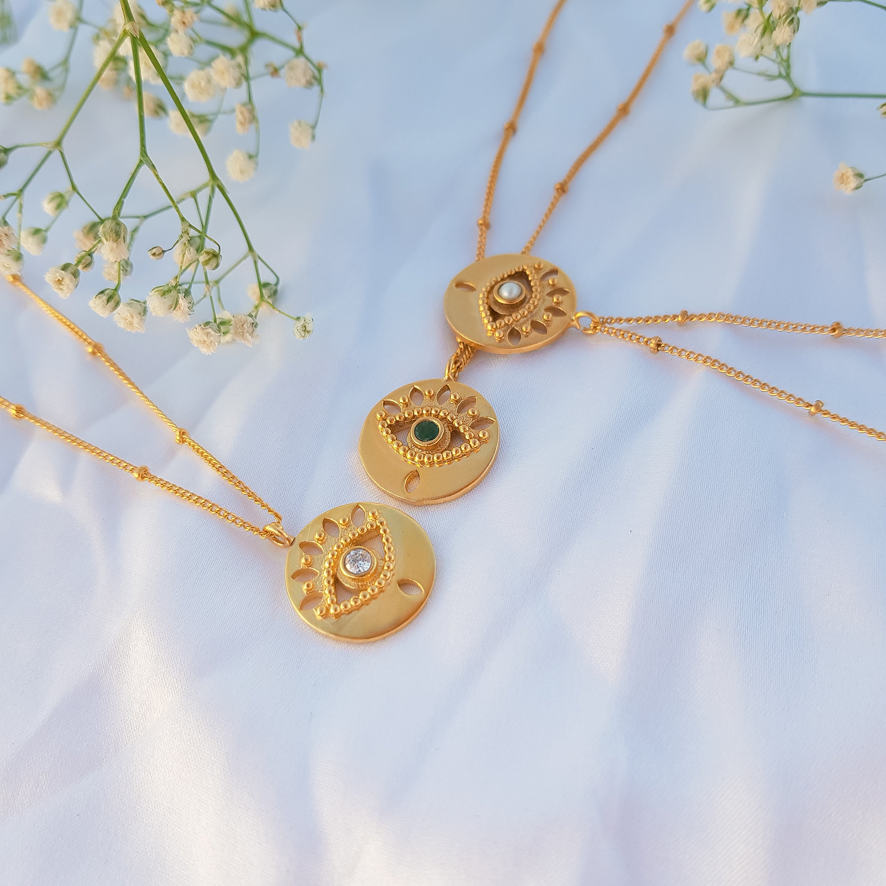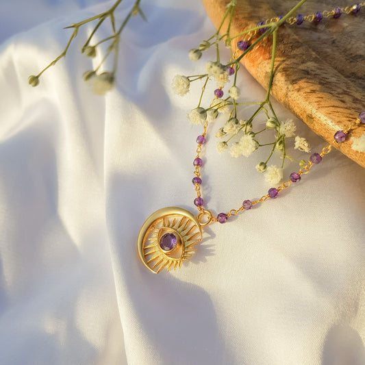 Amethyst beaded necklace with Evil Eye Crescent Moon charm in 22k gold plated 925 sterling silver