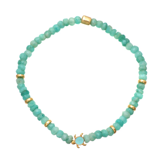 Amazonite turtle charm stretch bracelet with blue enamel and in gold plated 925 sterling silver