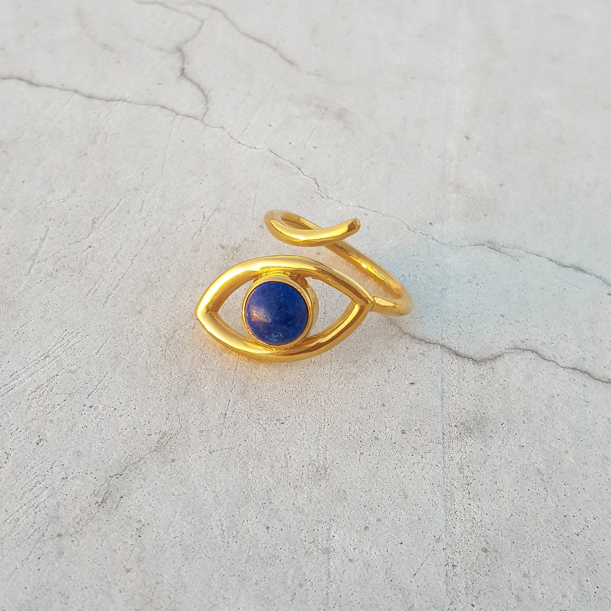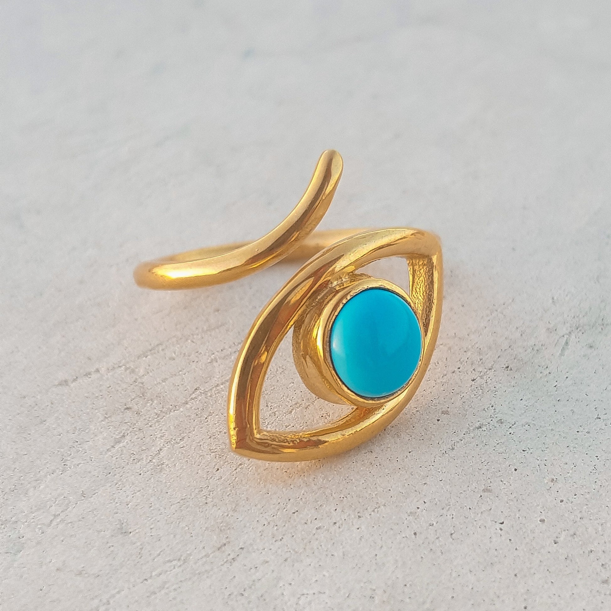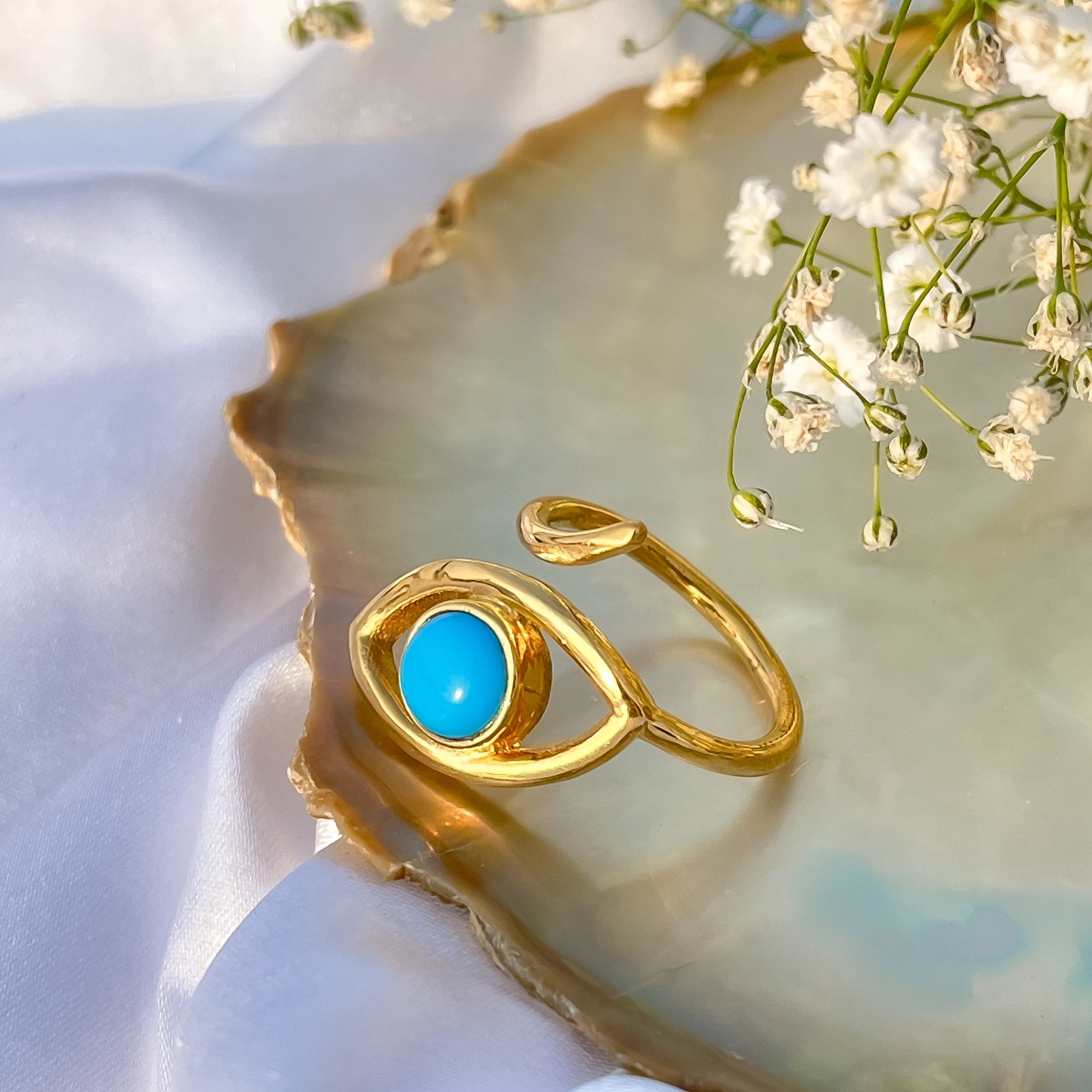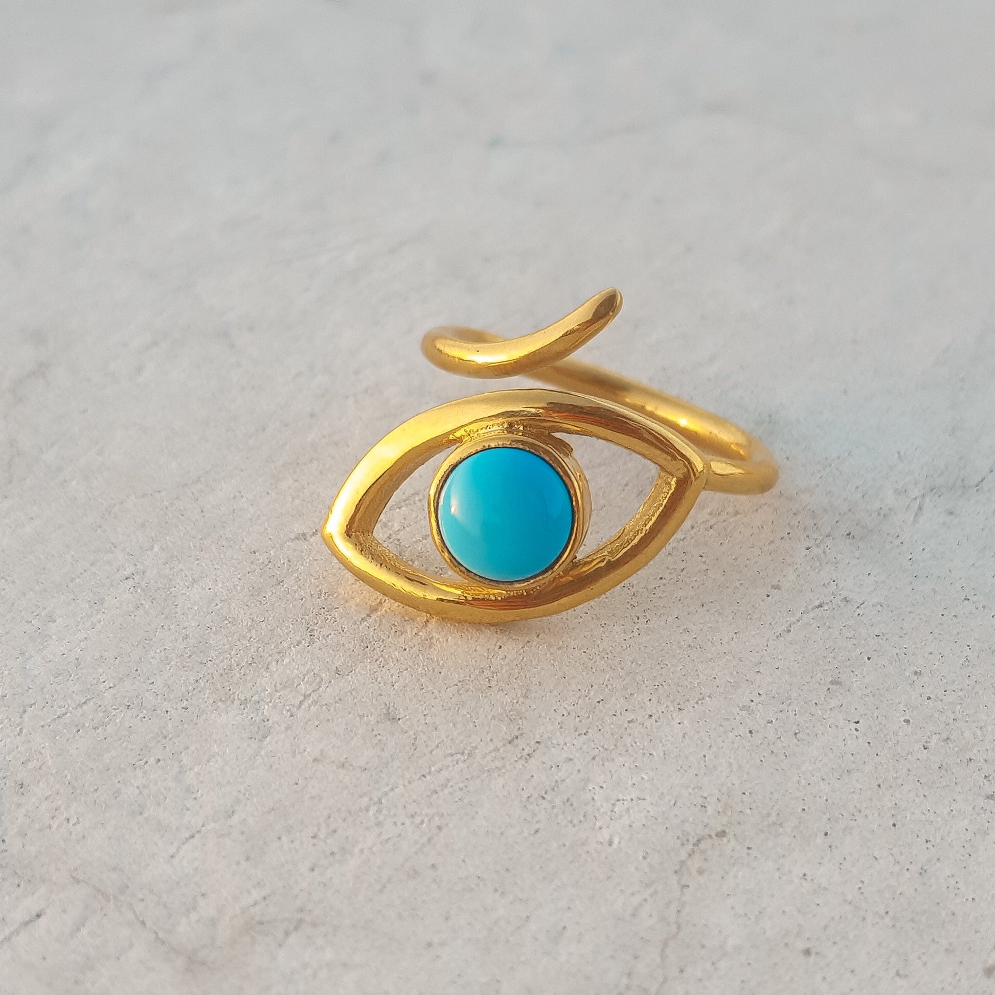 This adjustable ring features the protective Evil Eye symbol in a vibrant Turquoise gemstone, set in Brass or 925 Sterling Silver with gold plating. Combining style and positive energy, this ring is perfect for any occasion. Stay protected and fashionable with this must-have piece. (Also available in other gemstones)