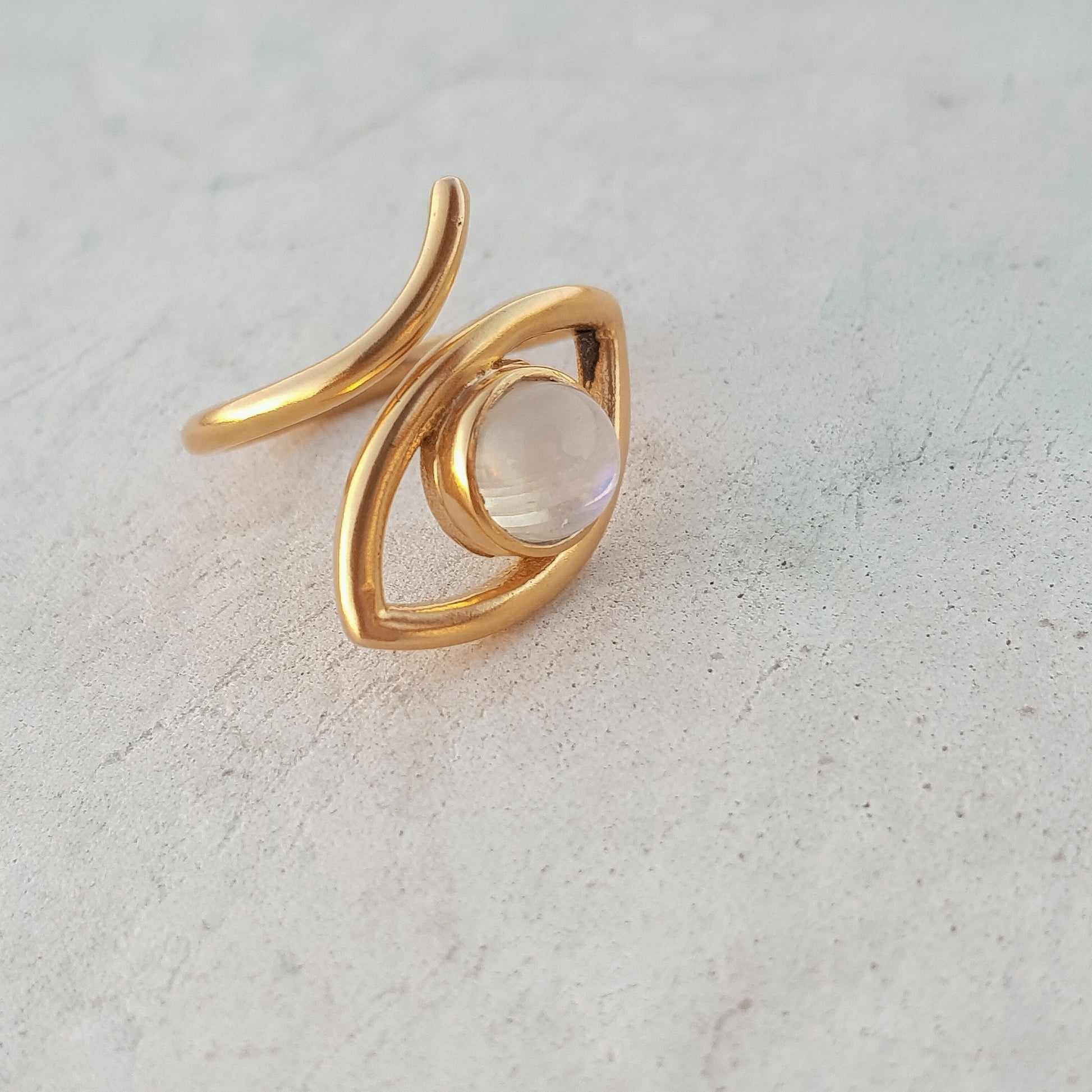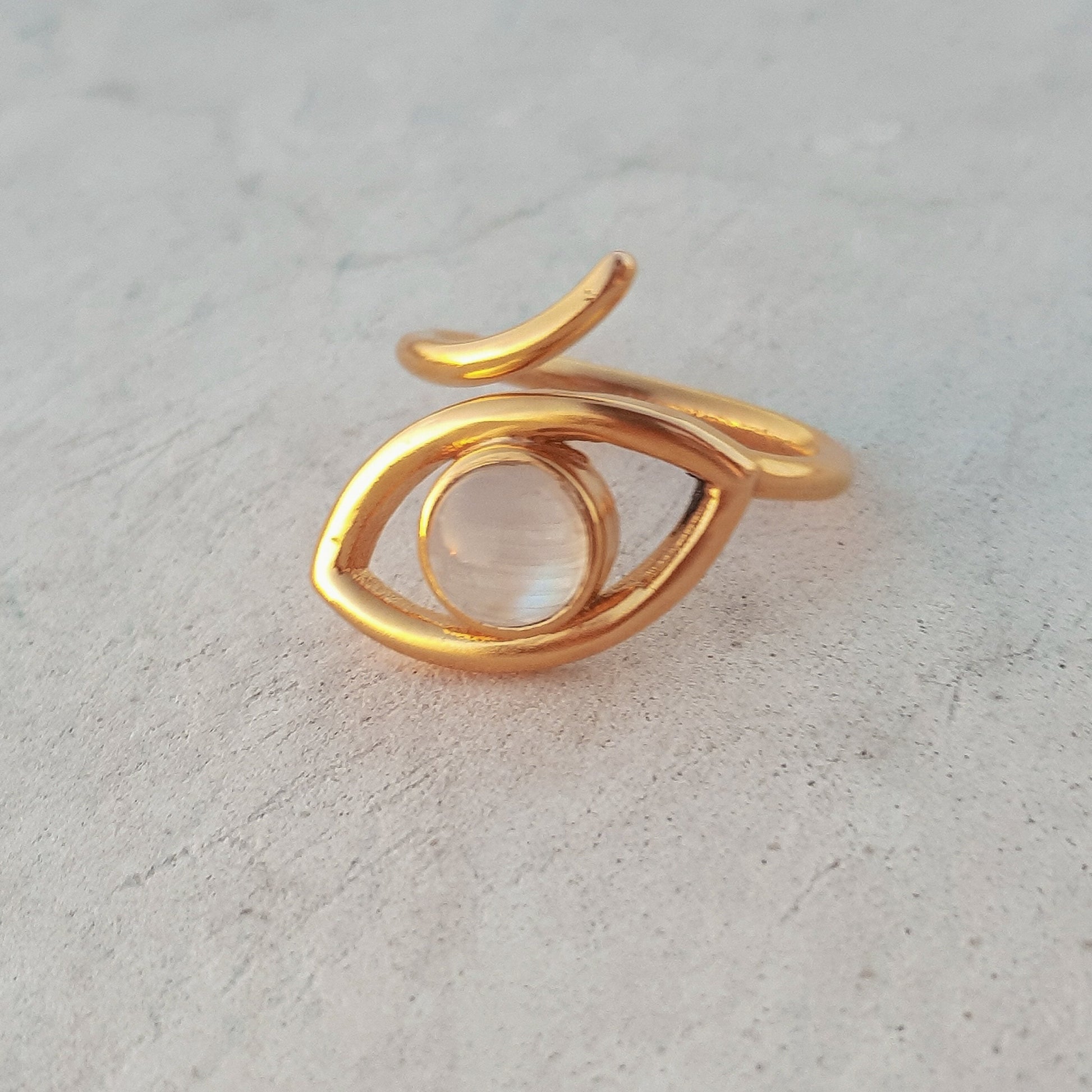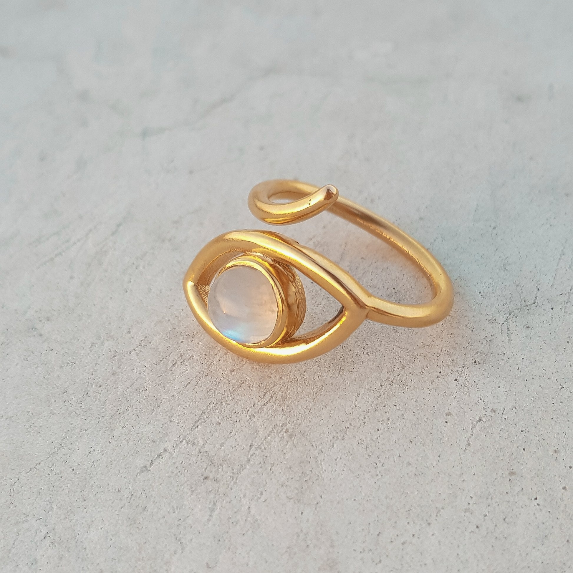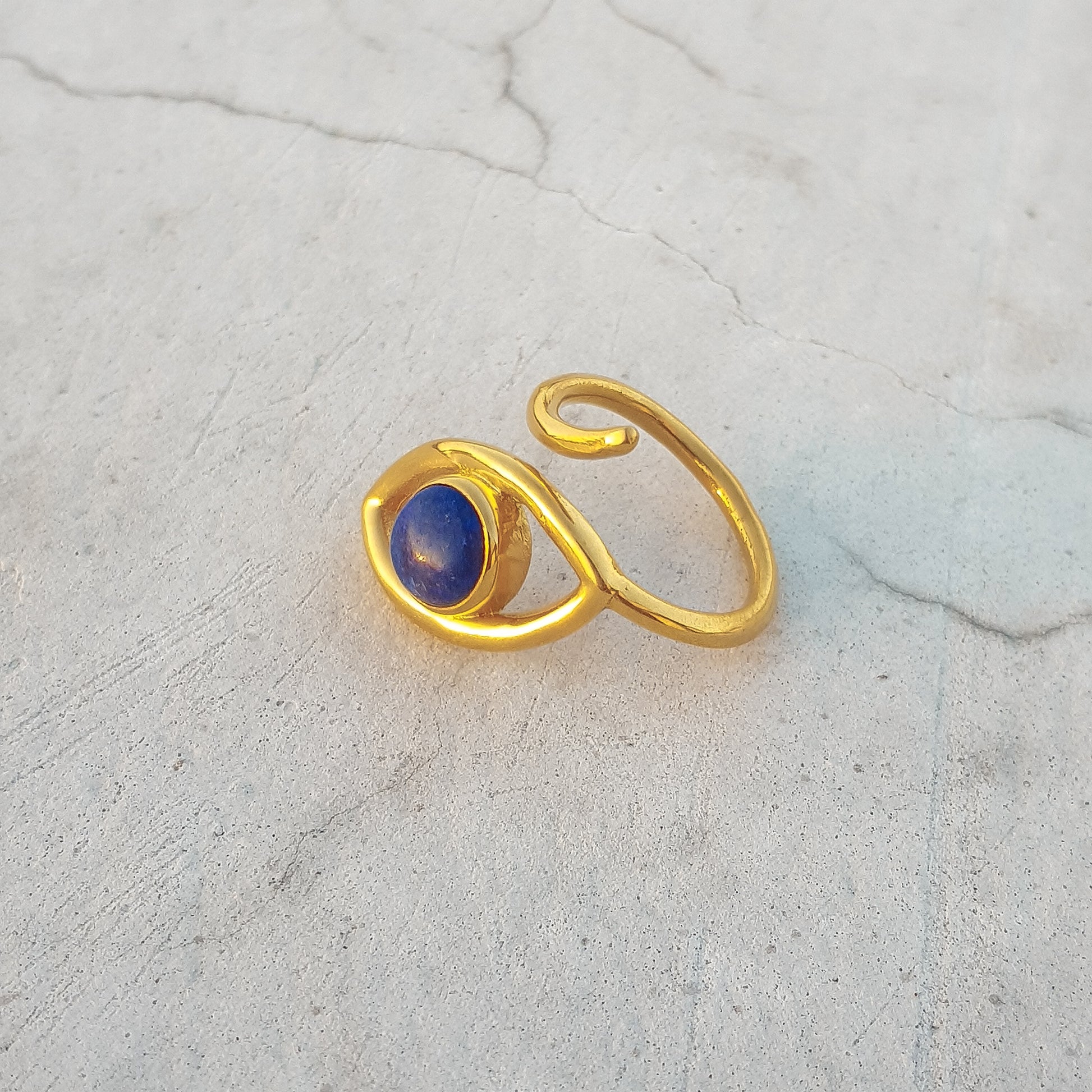 This adjustable ring features the protective Evil Eye symbol in a vibrant Turquoise gemstone, set in Brass or 925 Sterling Silver with gold plating. Combining style and positive energy, this ring is perfect for any occasion. Stay protected and fashionable with this must-have piece. (Also available in other gemstones)