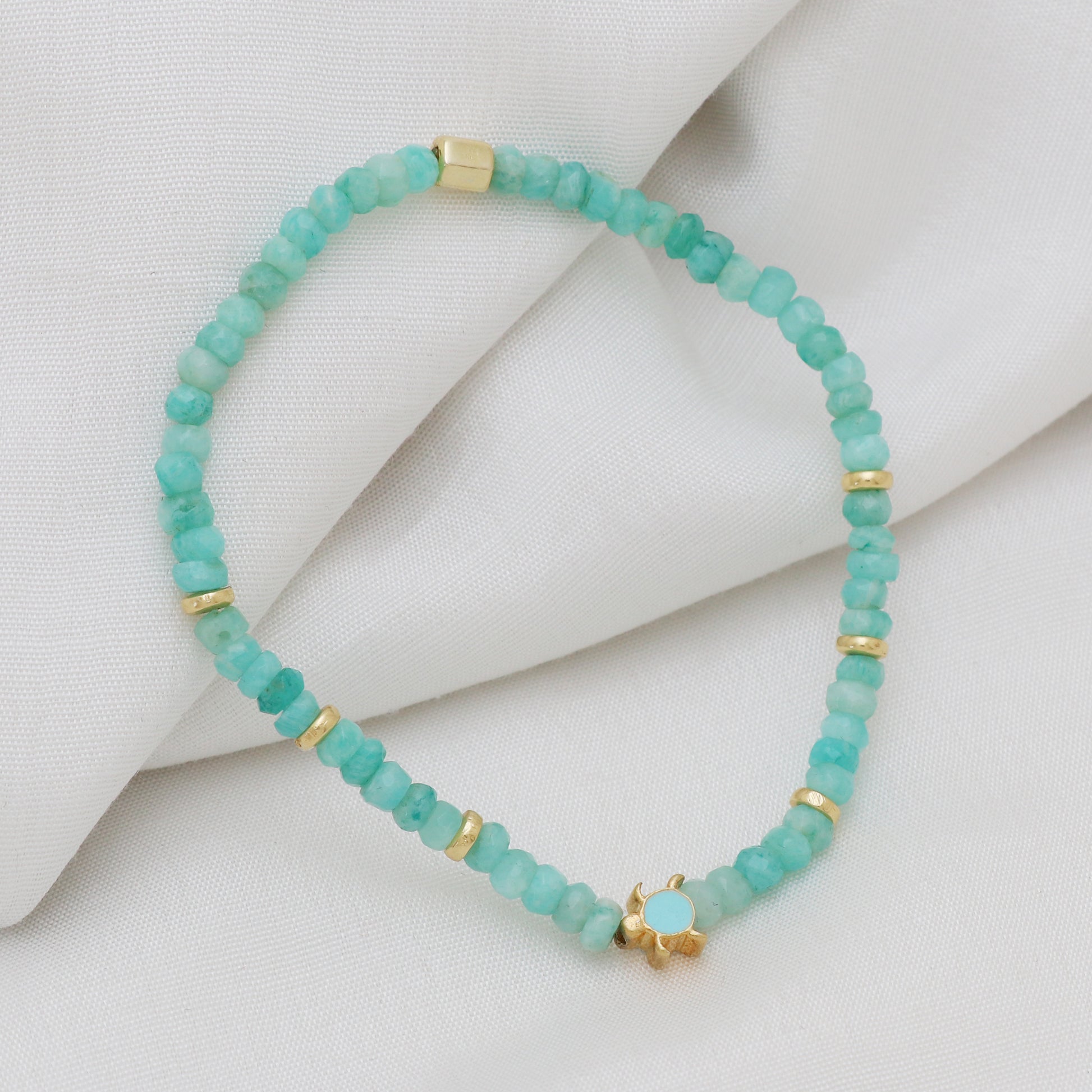Amazonite turtle charm stretch bracelet with blue enamel and in gold plated 925 sterling silver