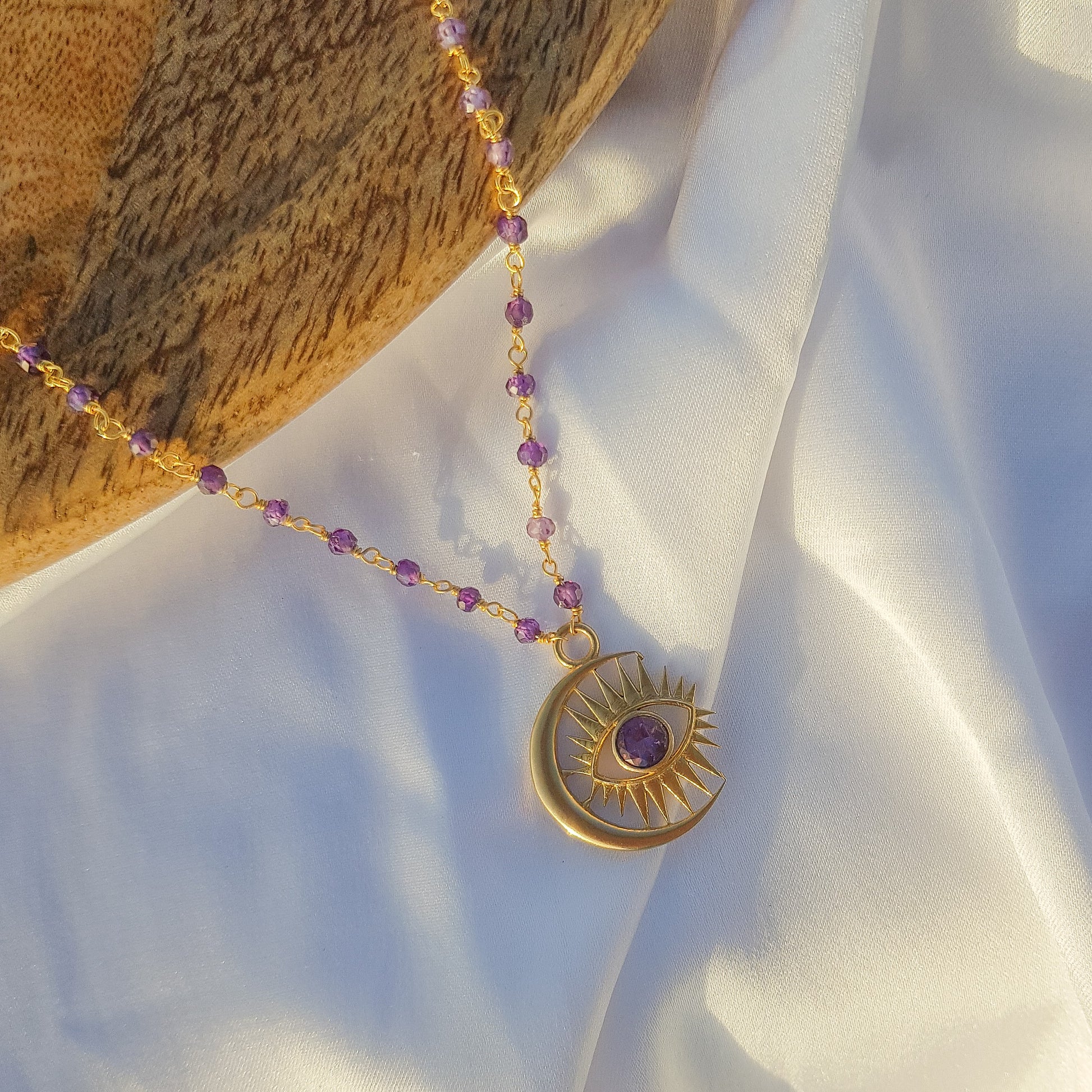Amethyst beaded necklace with Evil Eye Crescent Moon charm in 22k gold plated 925 sterling silver