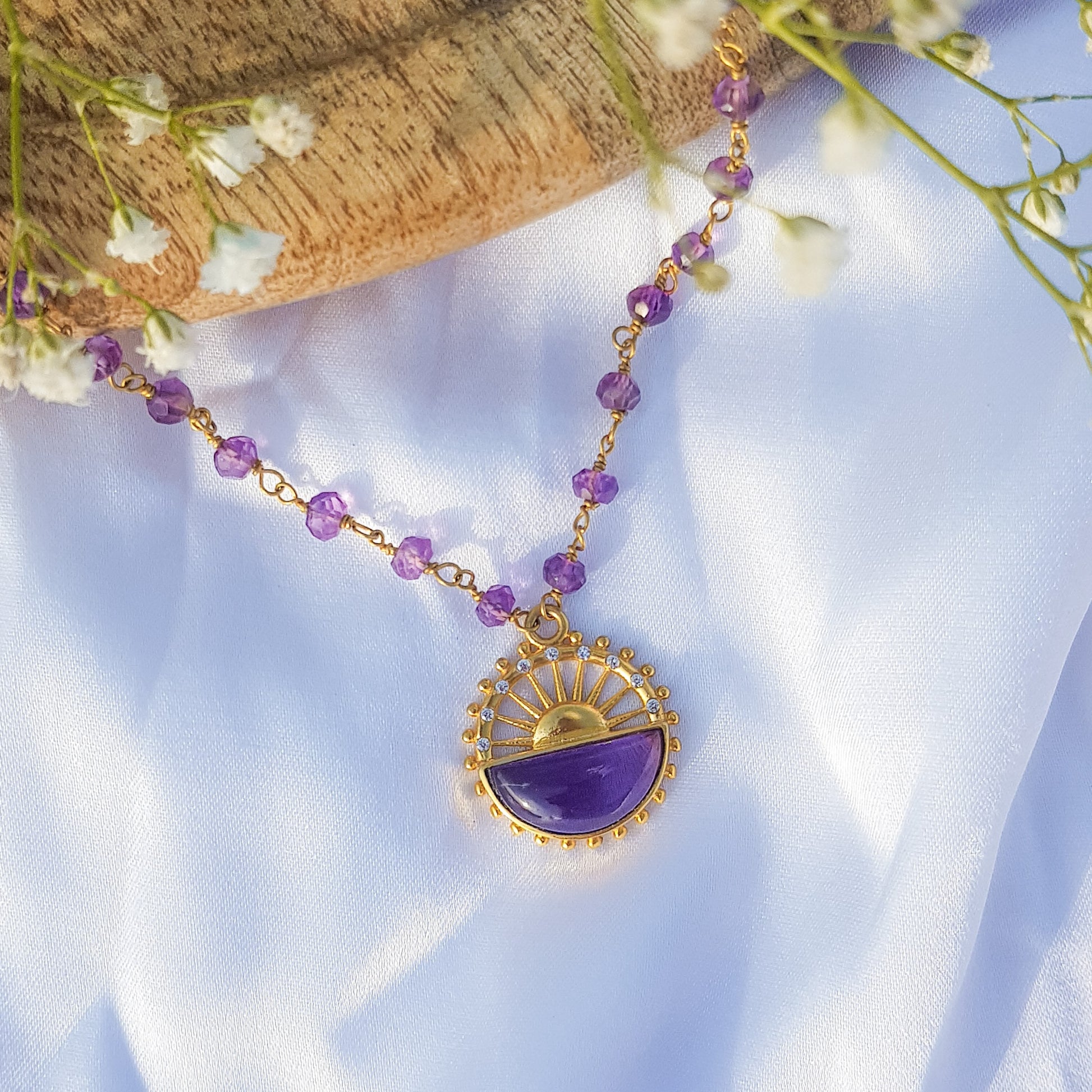 Add a touch of elegance to your jewelry collection with our Amethyst beaded necklace. Crafted from high-quality 925 sterling silver, featuring a stunning sun charm in a 22k gold plated finish and sparkling zircon stones, this necklace is both beautiful and durable. The purple amethyst beads add a touch of bold color, making it the perfect statement piece for any outfit, while the sun charm brings a sense of positivity and warmth. Crafted with high-quality materials, this necklace will make a beautiful addition to any jewelry collection.