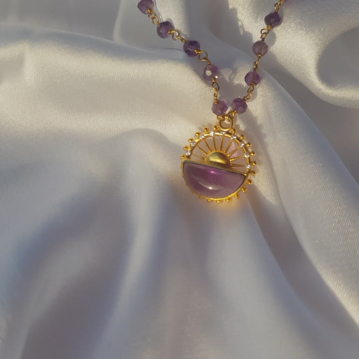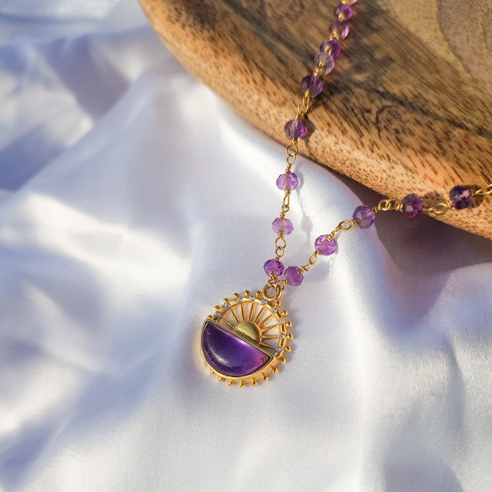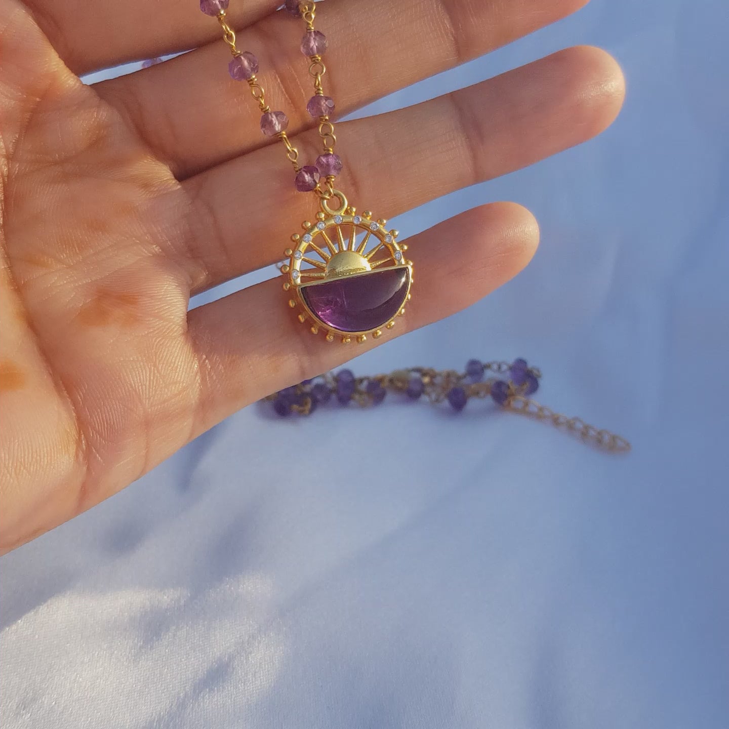 Amethyst beaded necklace with sun charm in 22k gold plated 925 sterling silver and zircon stones