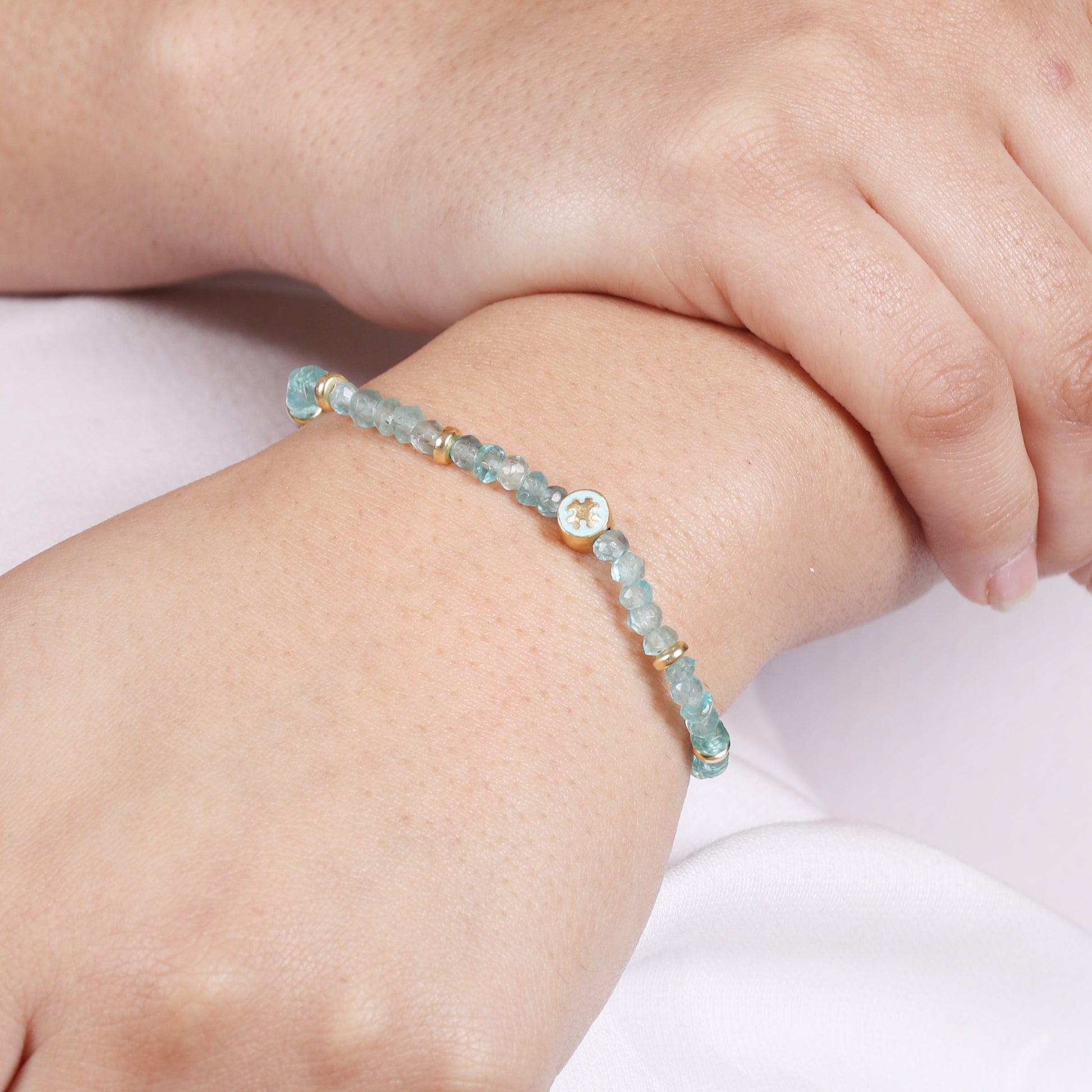 Apatite flower charm stretch bracelet with blue enamel in gold plated 925 sterling silver