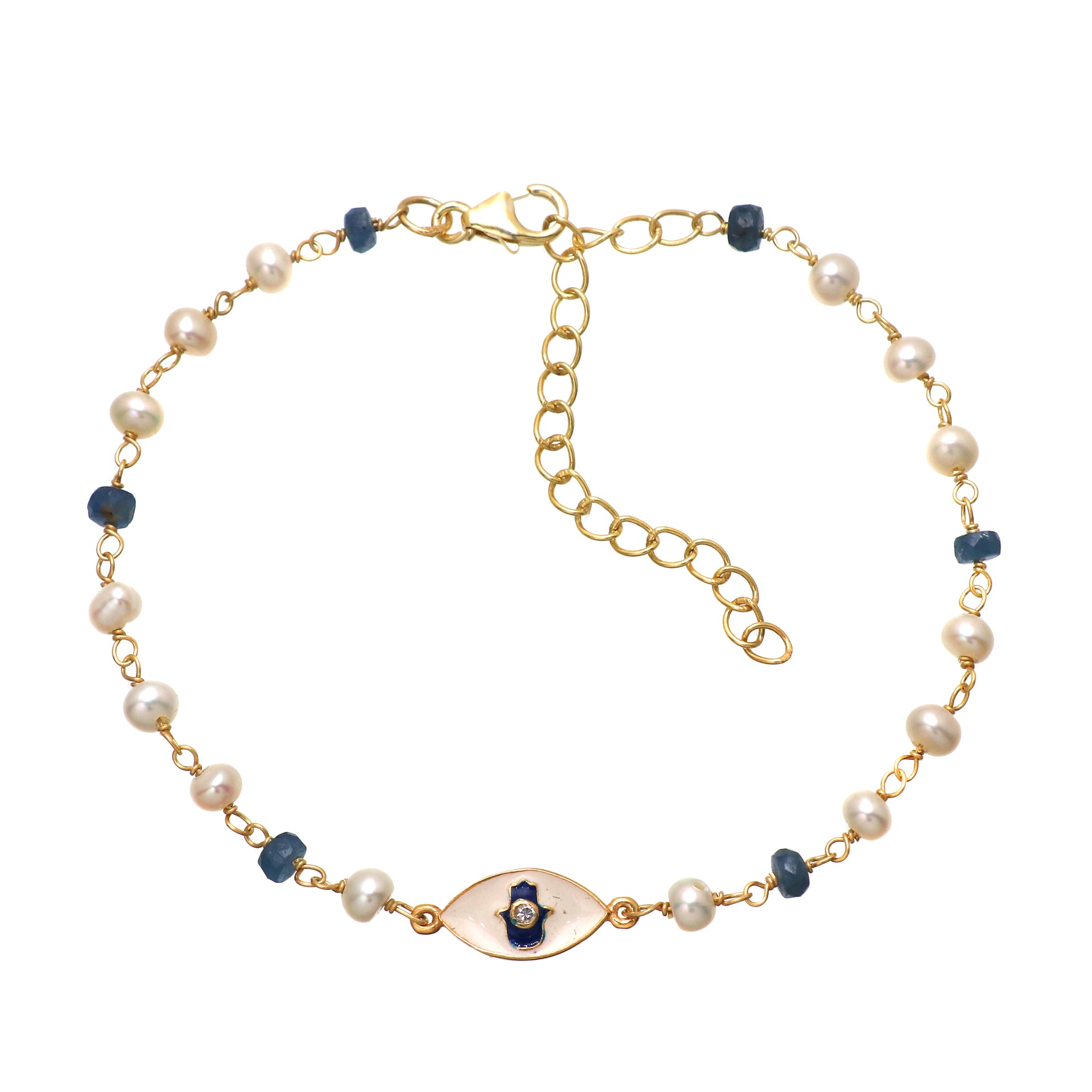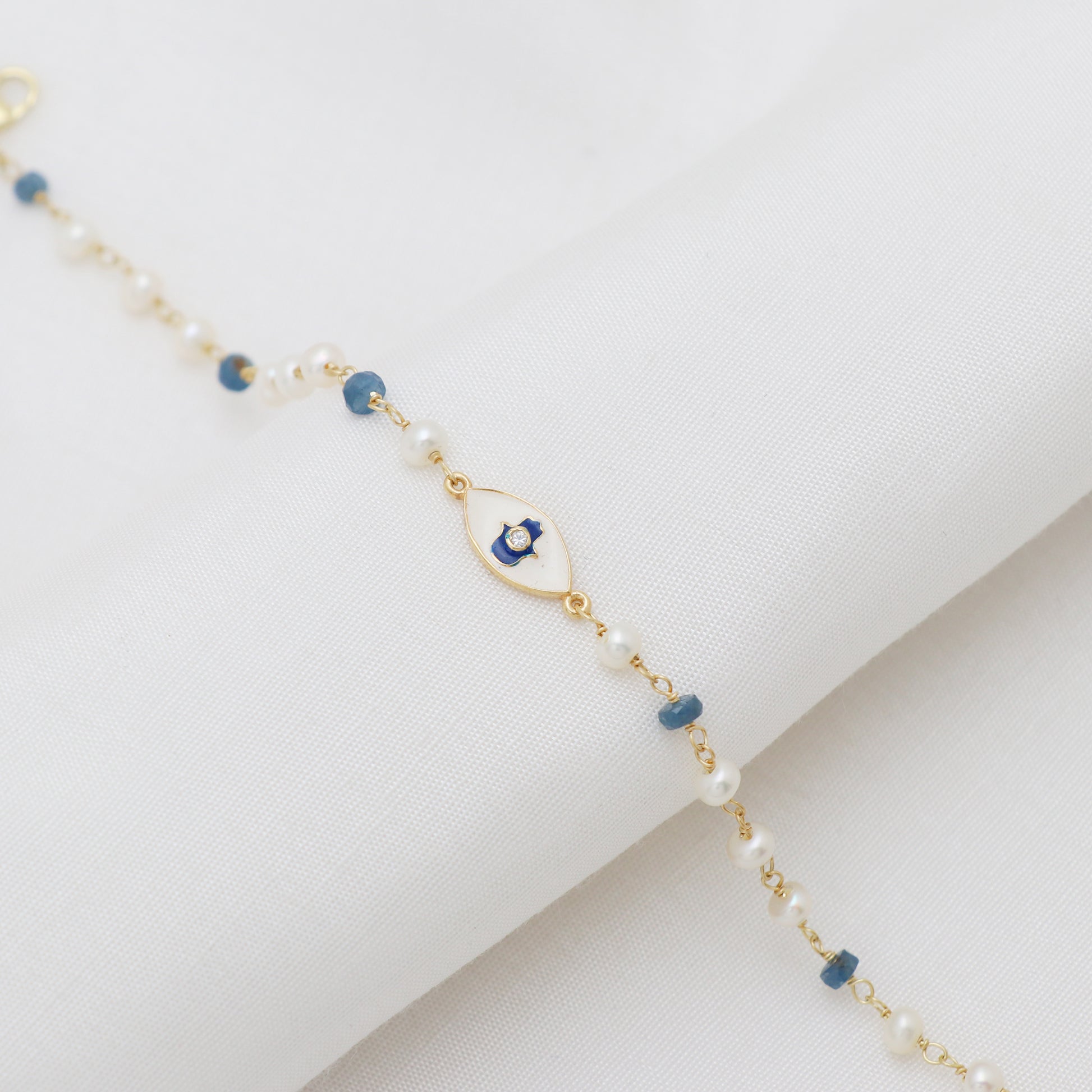 Blue Sapphire and pearl hamsa charm rosary bracelet with blue and white enamel and zircon stone in gold plated 925 sterling silver