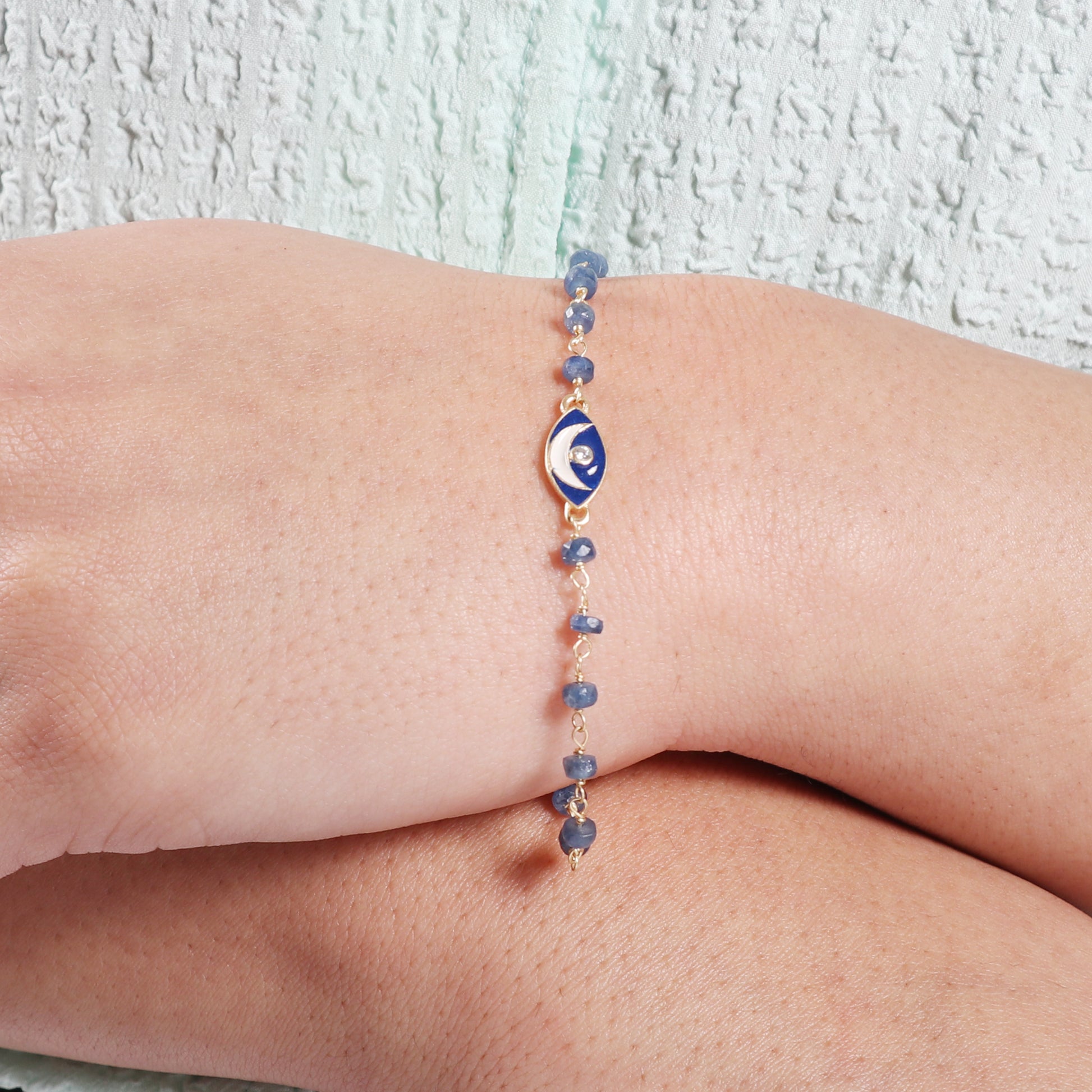 Expertly crafted with exquisite detail, our Blue Sapphire moon charm rosary bracelet will add a touch of elegance to any outfit. Made with gold plated 925 sterling silver and adorned with stunning blue enamel and zircon stones, this bracelet is both luxurious and stylish. Perfect for any occasion, it's sure to make a statement wherever you go.