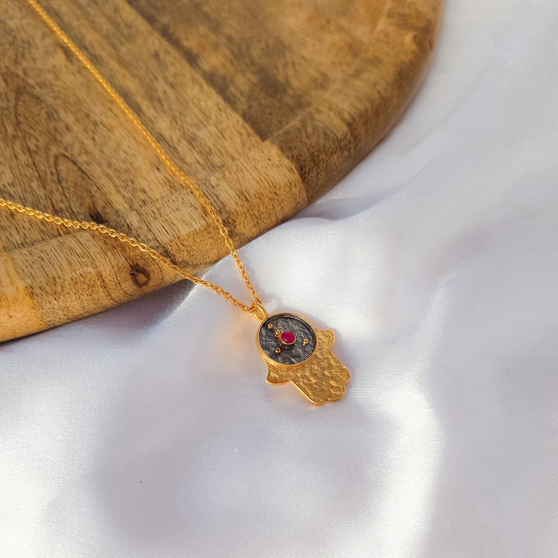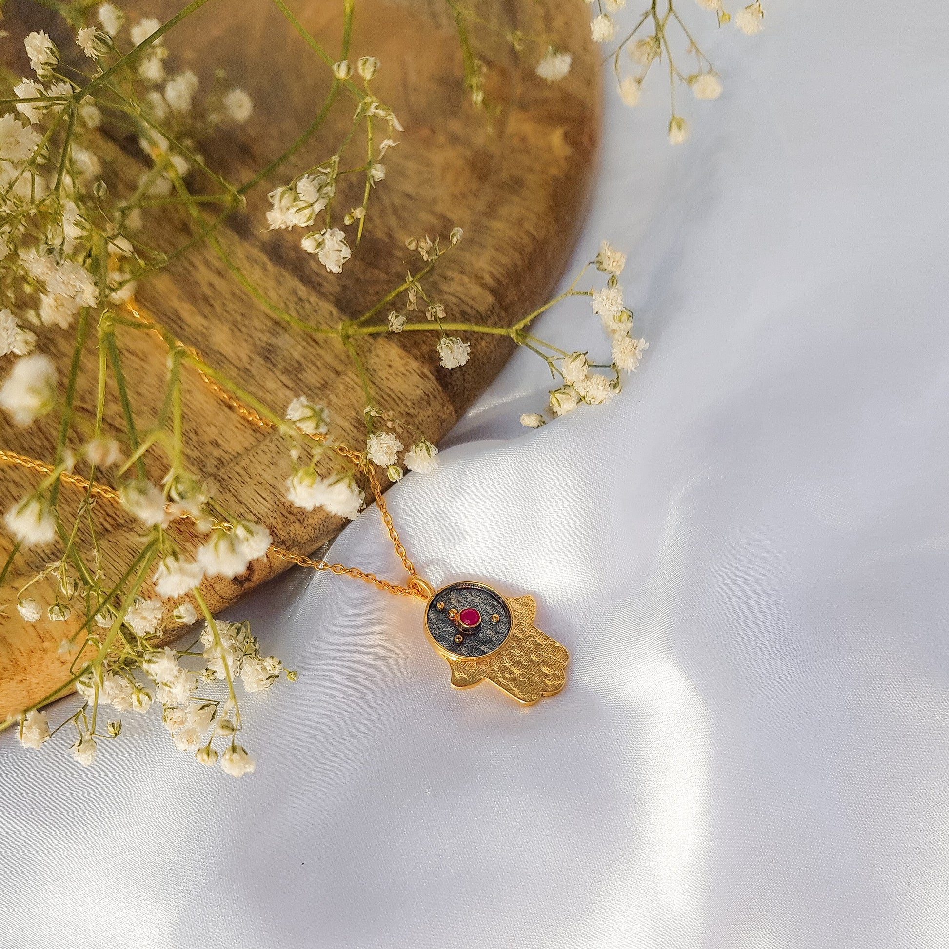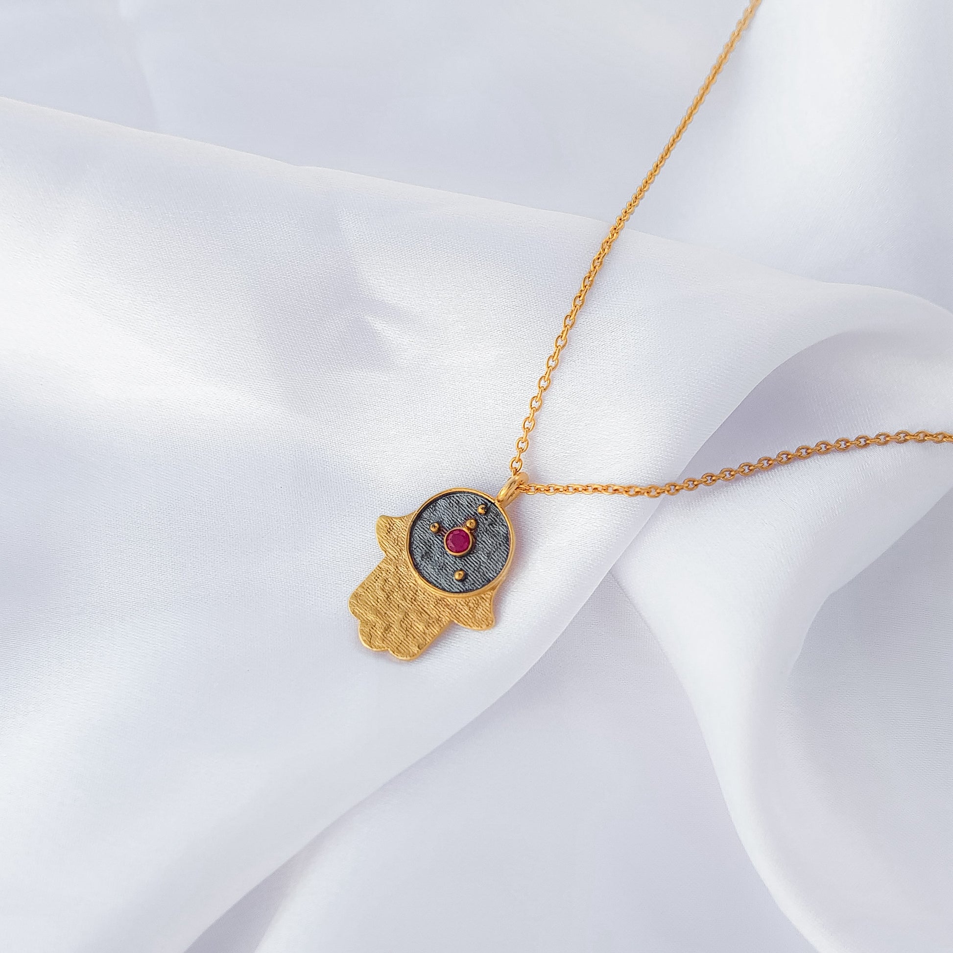 Cancer Zodiac Constellation chain necklace with Hamsa Charm and ruby birthstone in two tone black rhodium and 22k gold plated 925 sterling silver