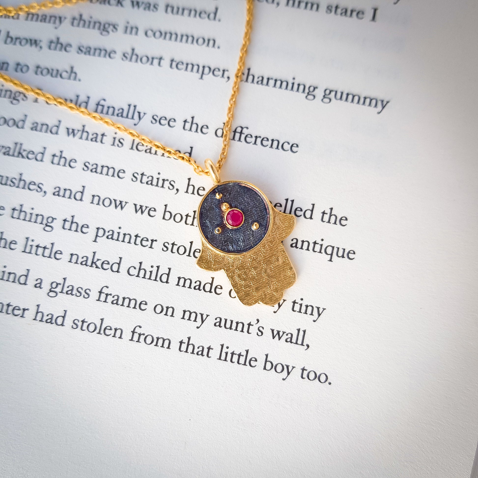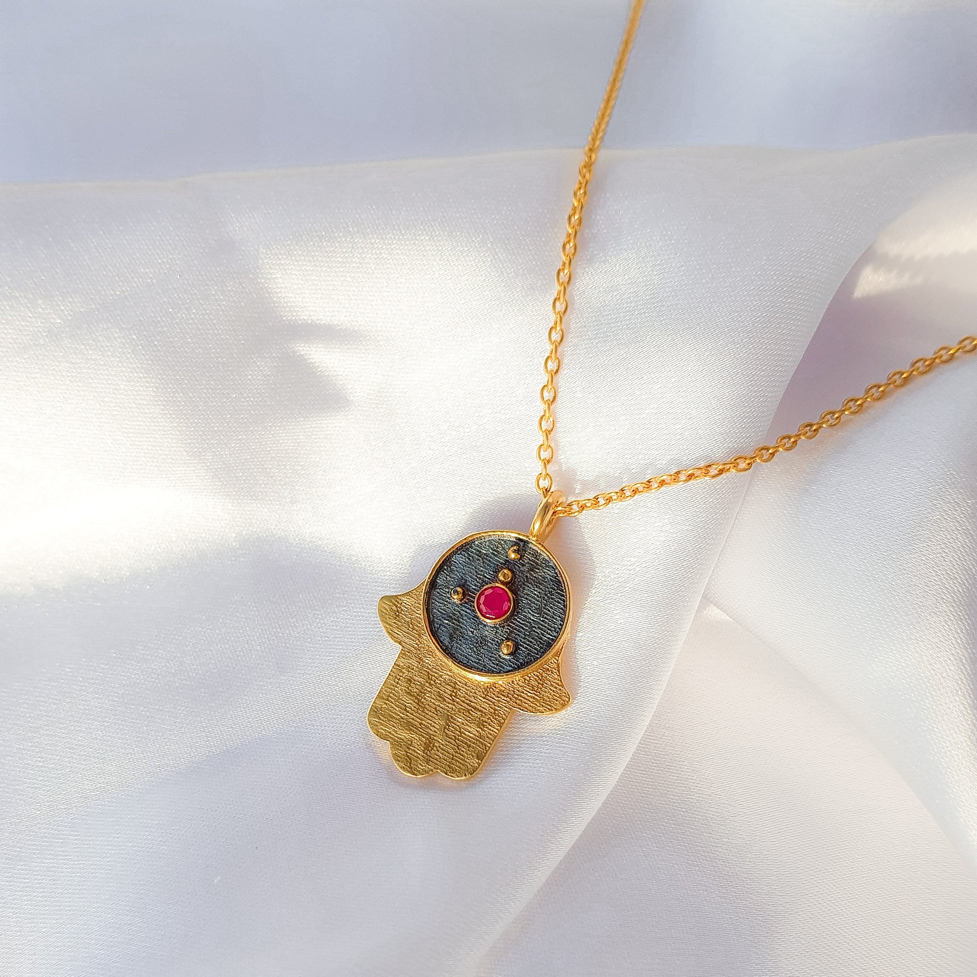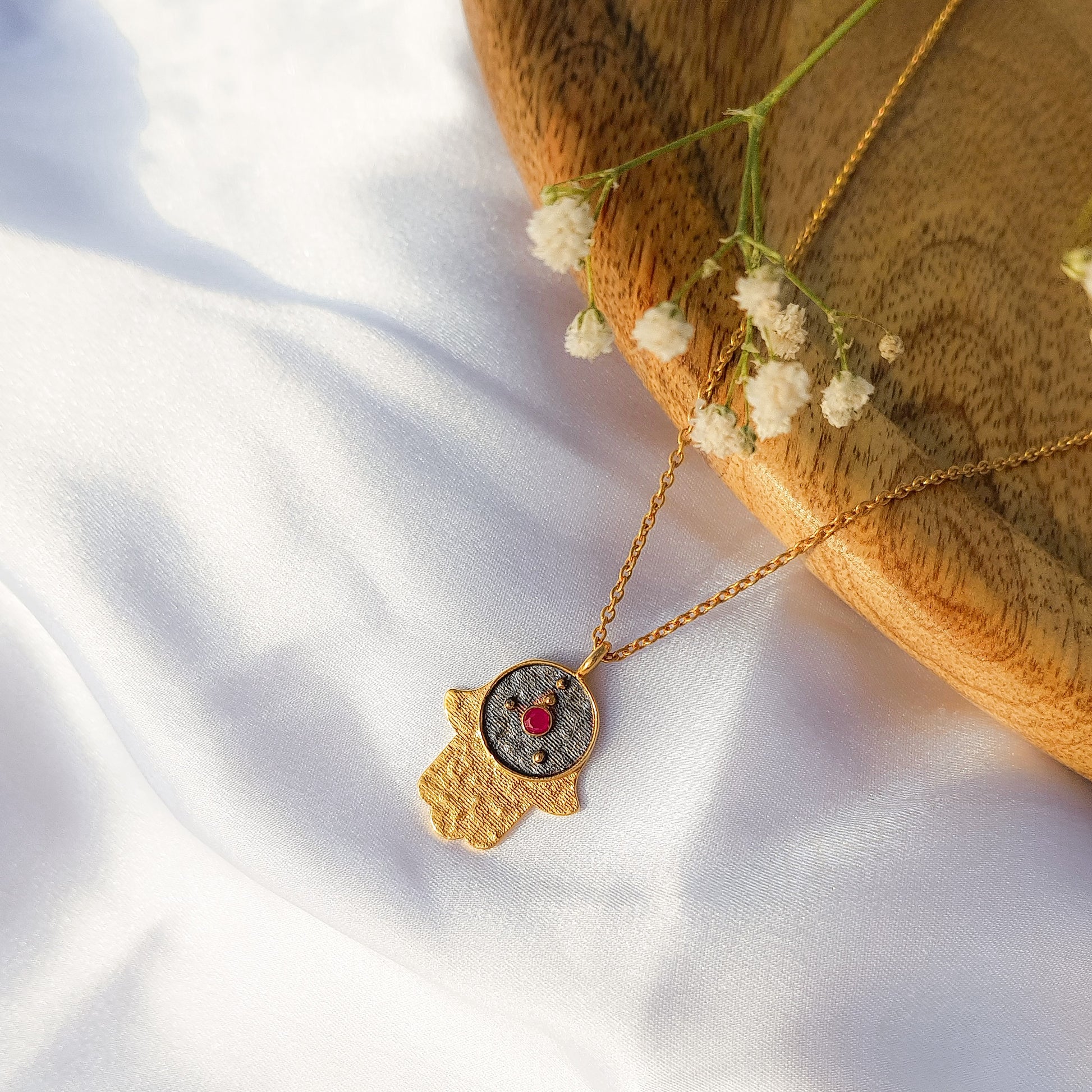 Cancer Zodiac Constellation chain necklace with Hamsa Charm and ruby birthstone in two tone black rhodium and 22k gold plated 925 sterling silver