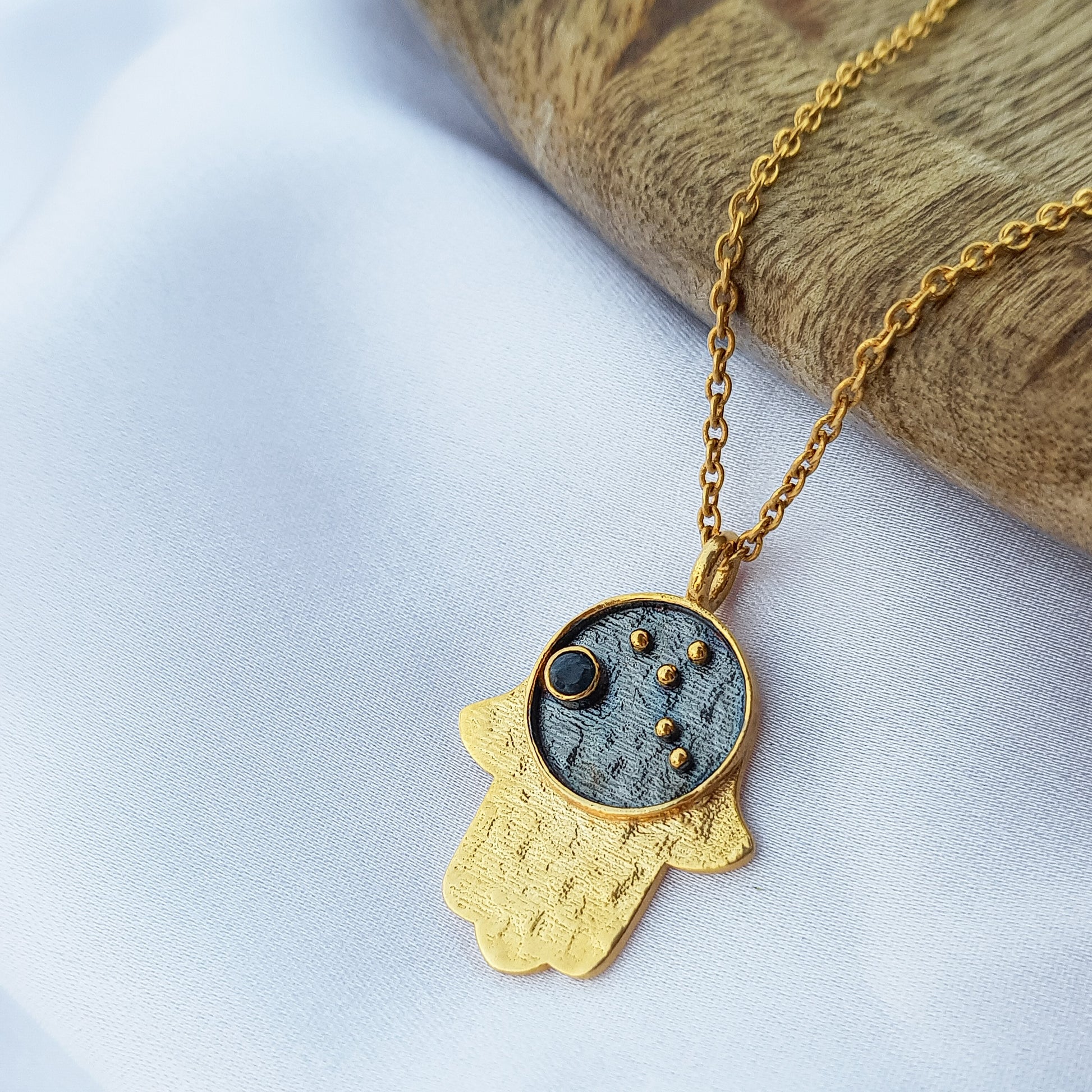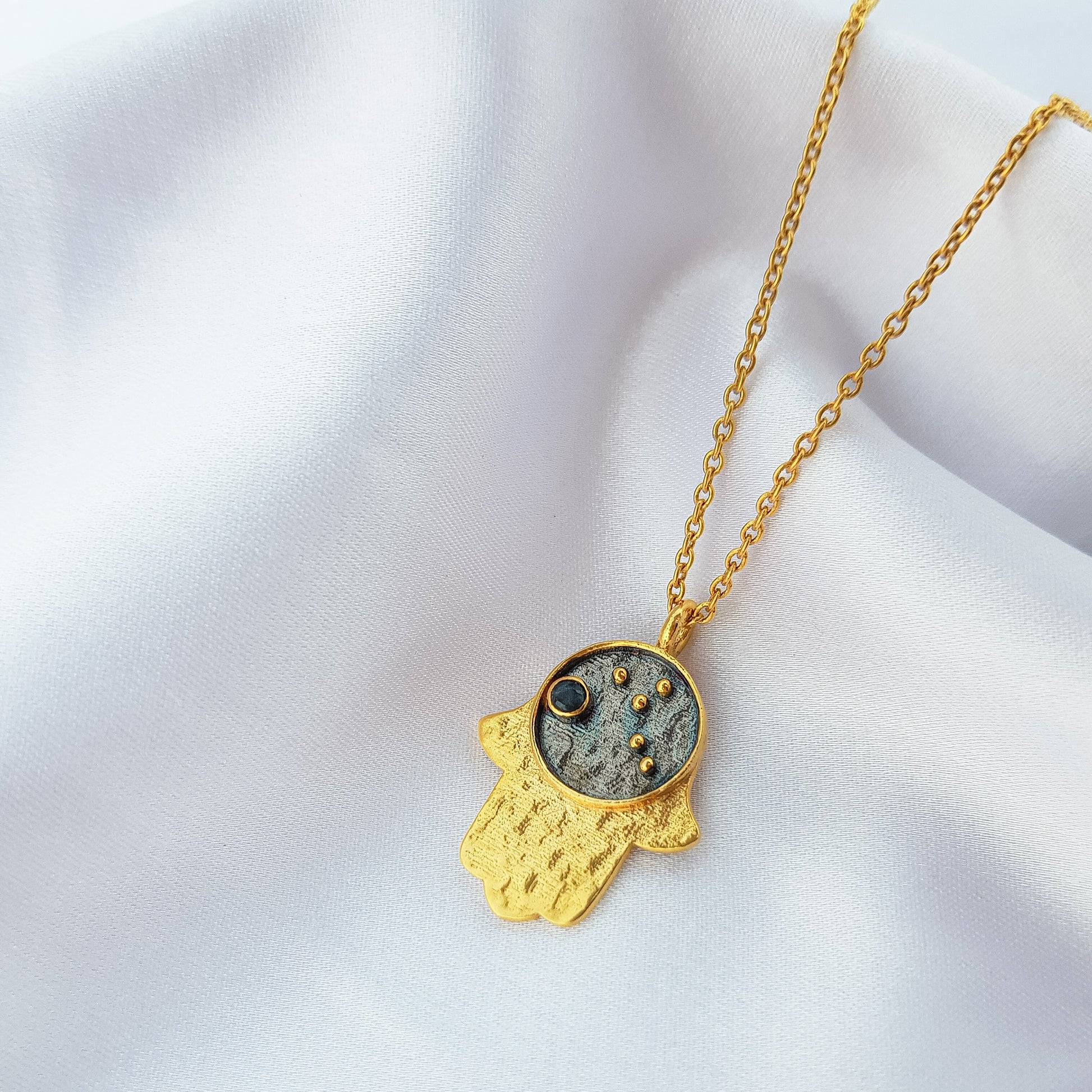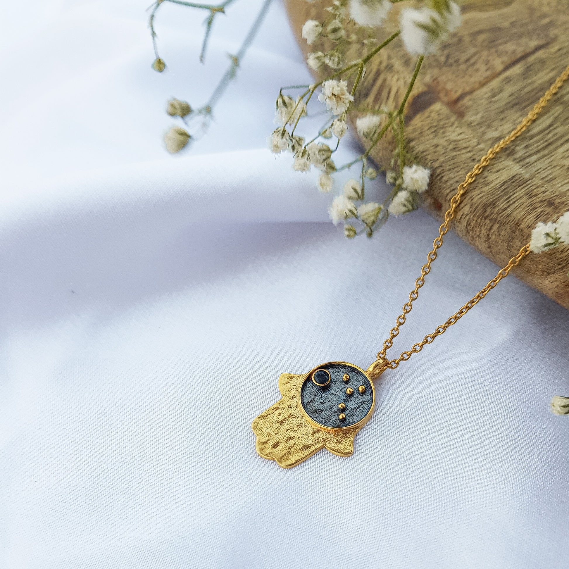 This unique necklace features a Virgo zodiac constellation charm, a hamsa charm, and a blue sapphire as birthstone, all beautifully crafted in two-tone black rhodium and 22k gold plated 925 sterling silver. Perfect for anyone who wants to show off their Virgo pride with a touch of elegance. Perfect for anyone born between August 23 - September 22.