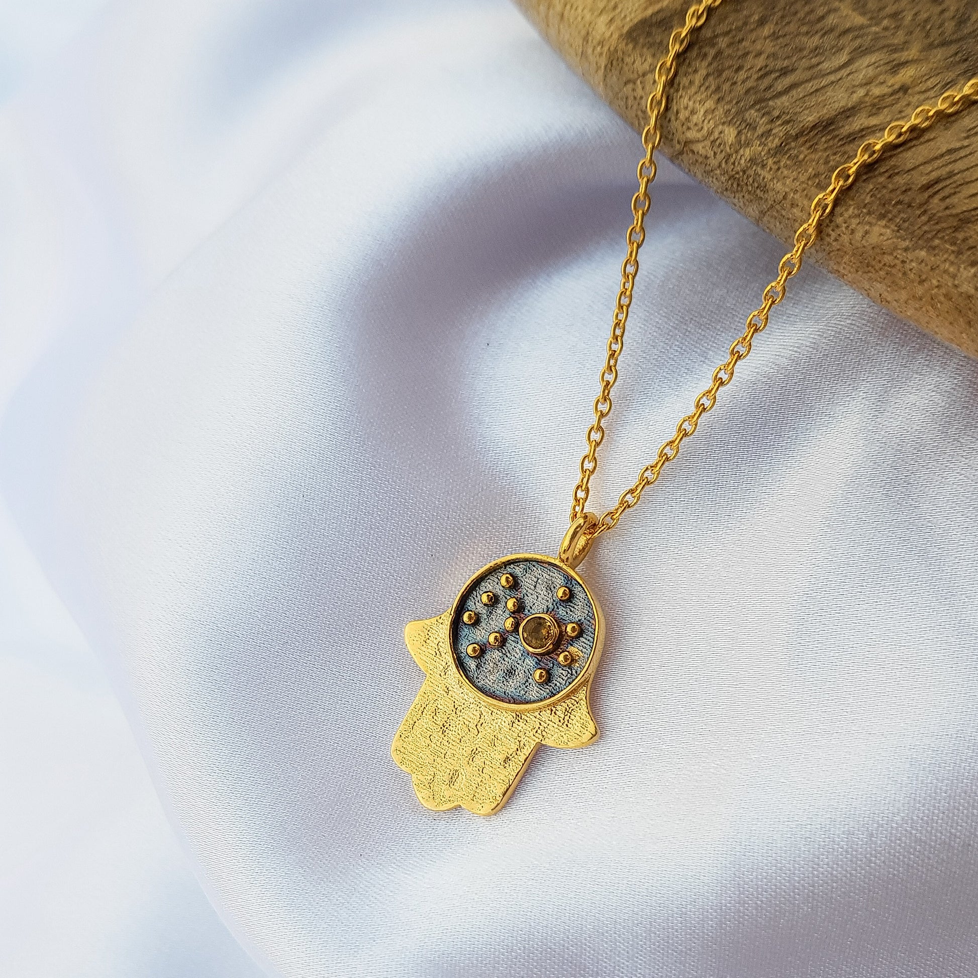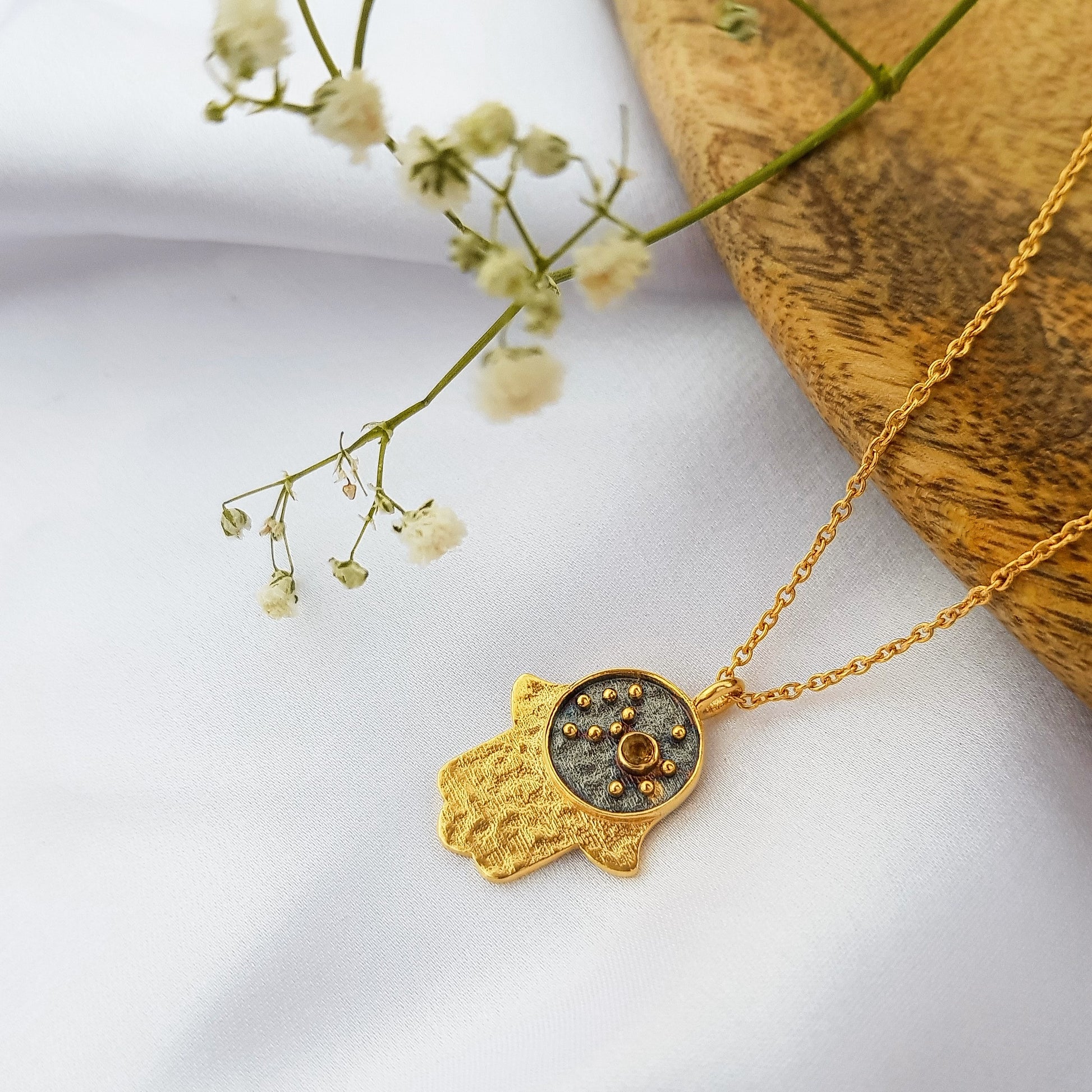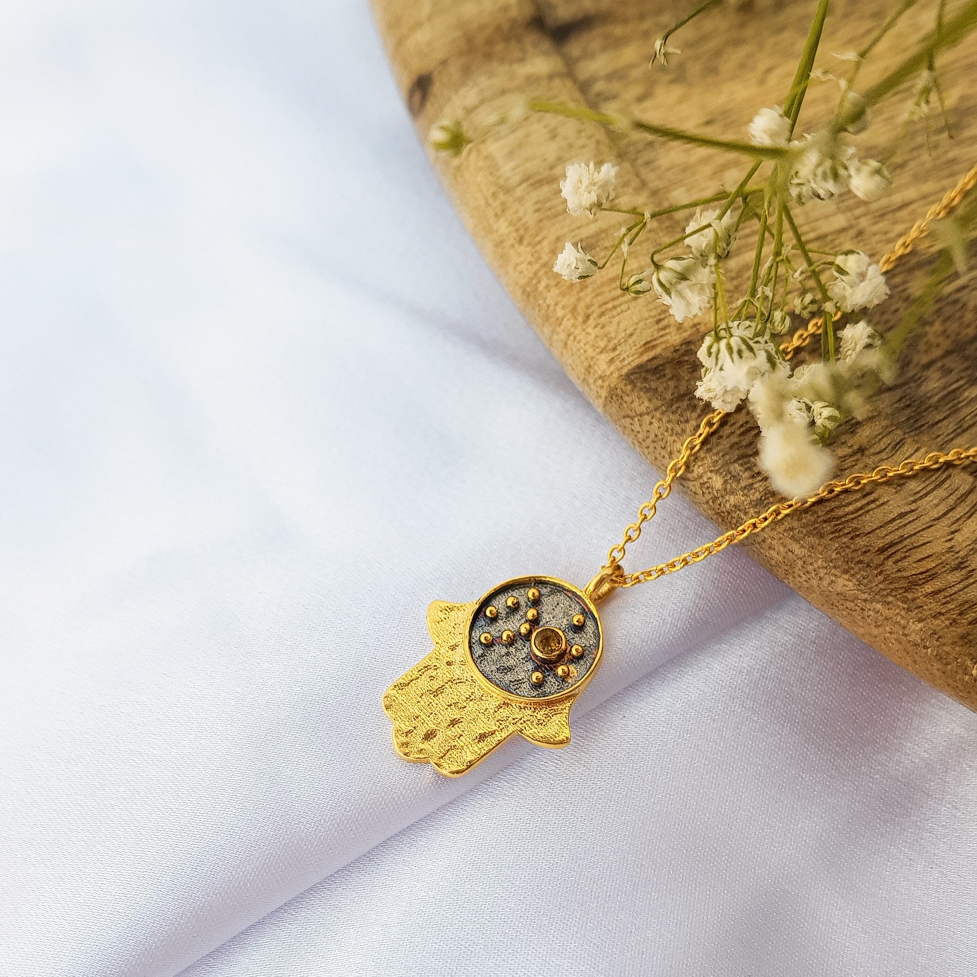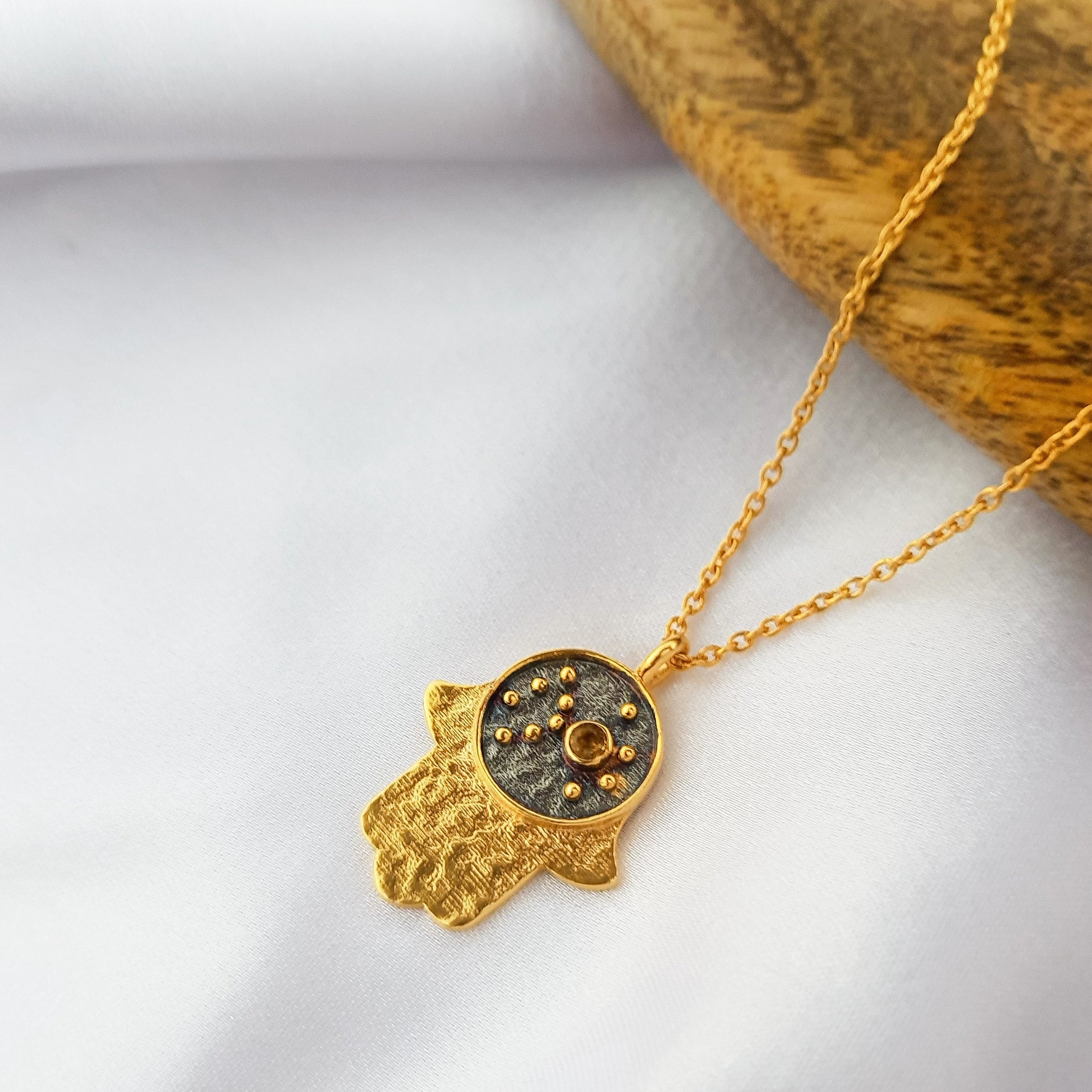 Introducing our Scorpio Zodiac Constellation chain necklace featuring a Hamsa Charm and Citrine as birthstone. Crafted with high-quality black rhodium and 22k gold plated 925 sterling silver, this necklace is a beautiful addition to any jewelry collection. Perfect for those born under the Scorpio sign between October 23 - November 21. This necklace symbolizes protection and success.