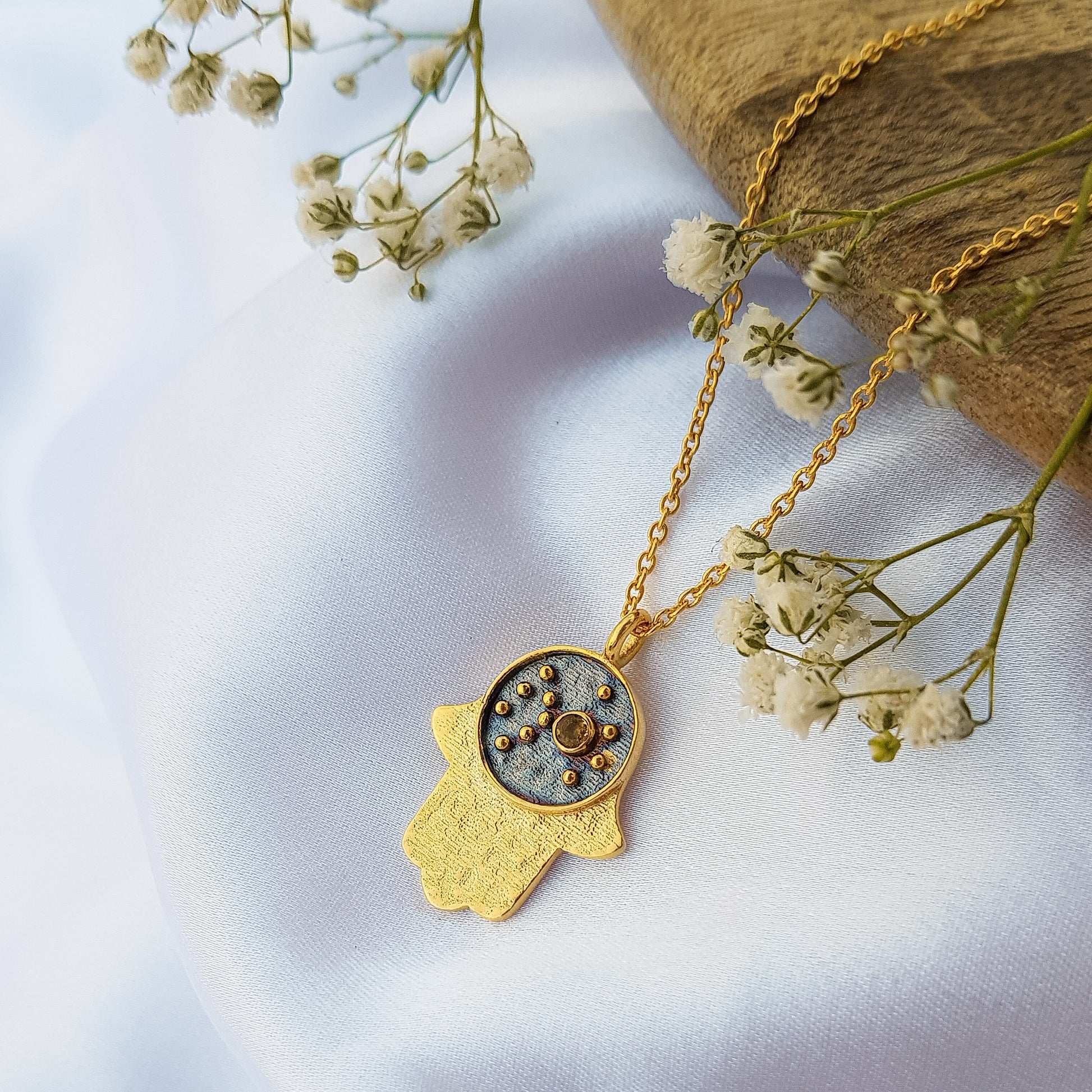 Scorpio Zodiac Constellation chain necklace with Hamsa Charm and Citrine birthstone in two tone black rhodium and 22k gold plated 925 sterling silver