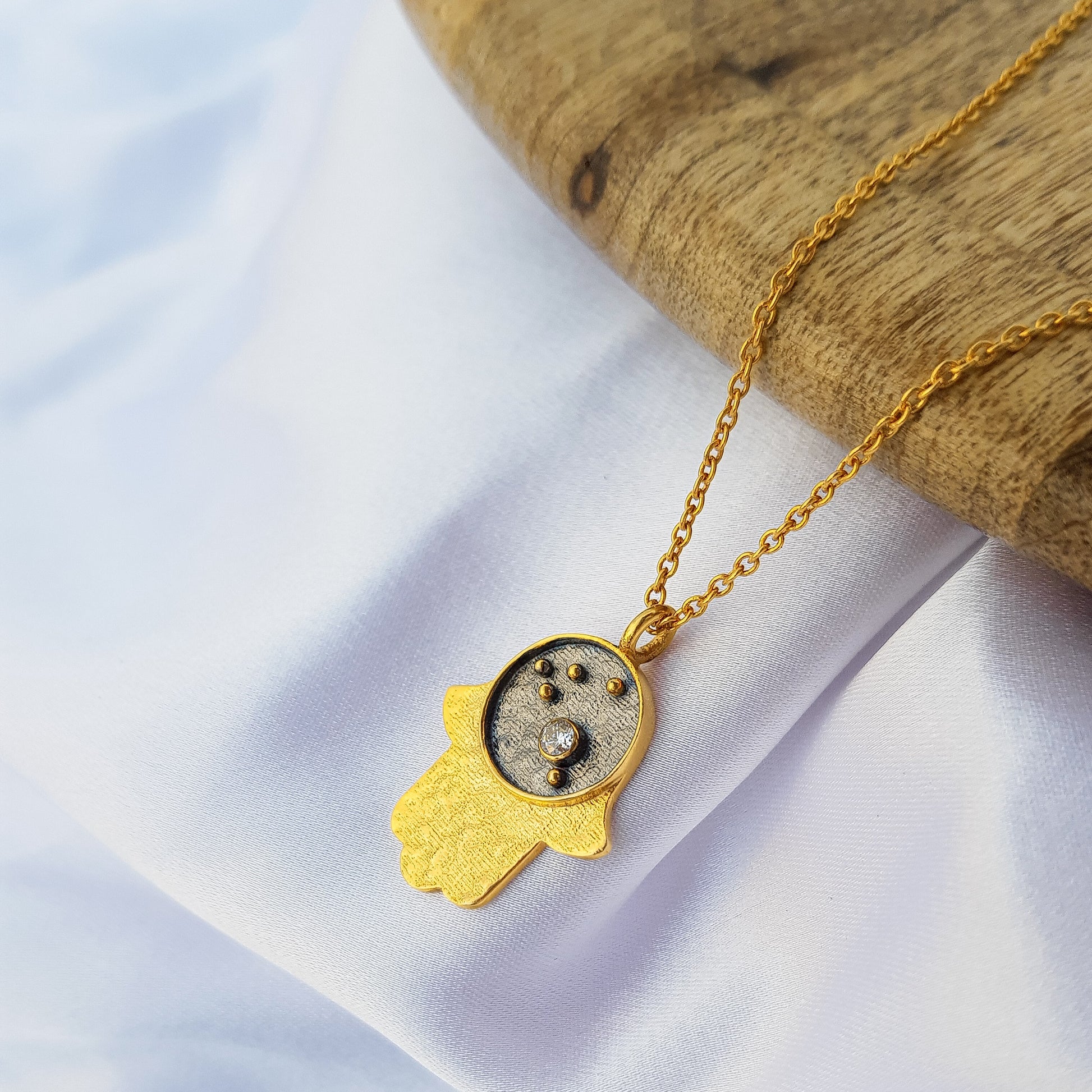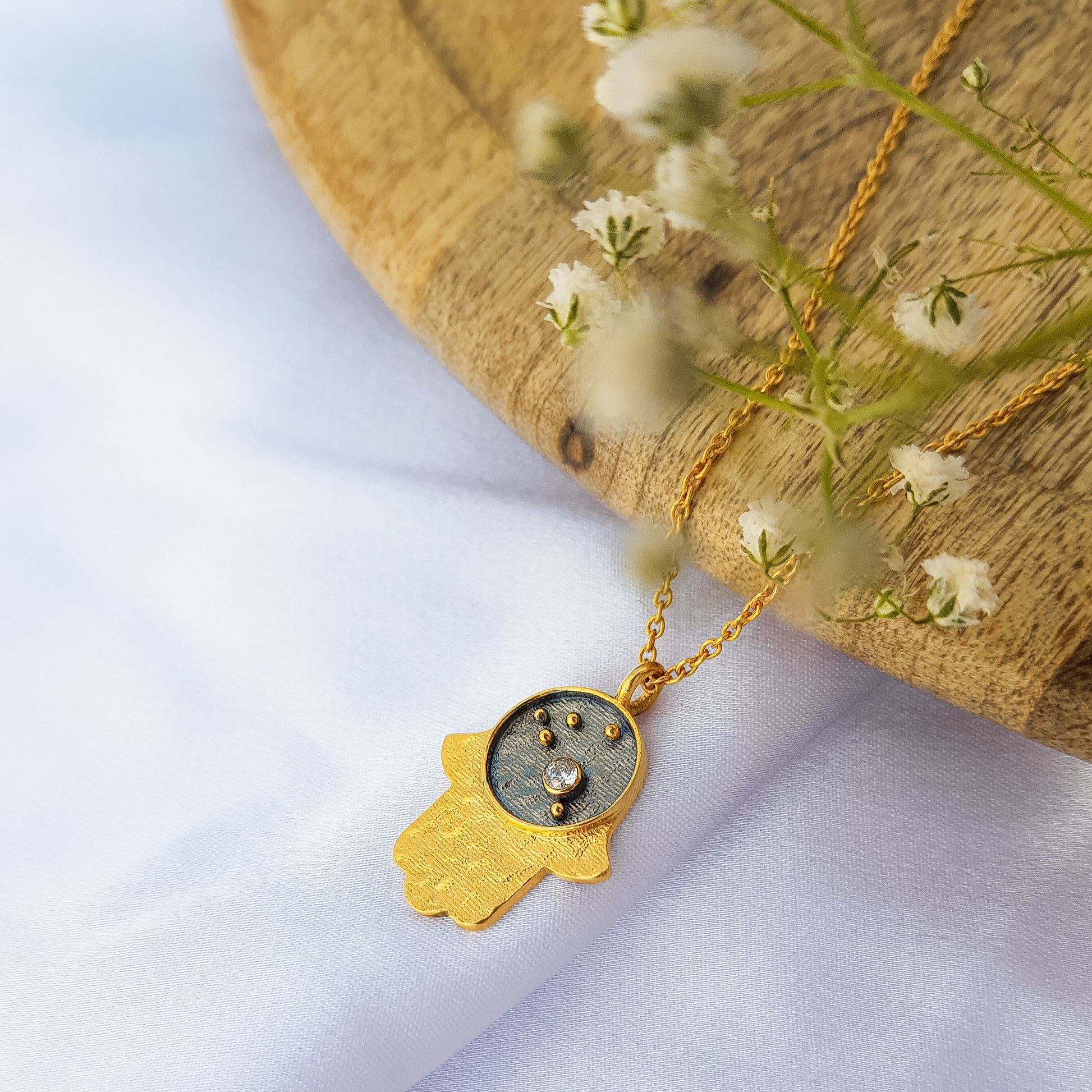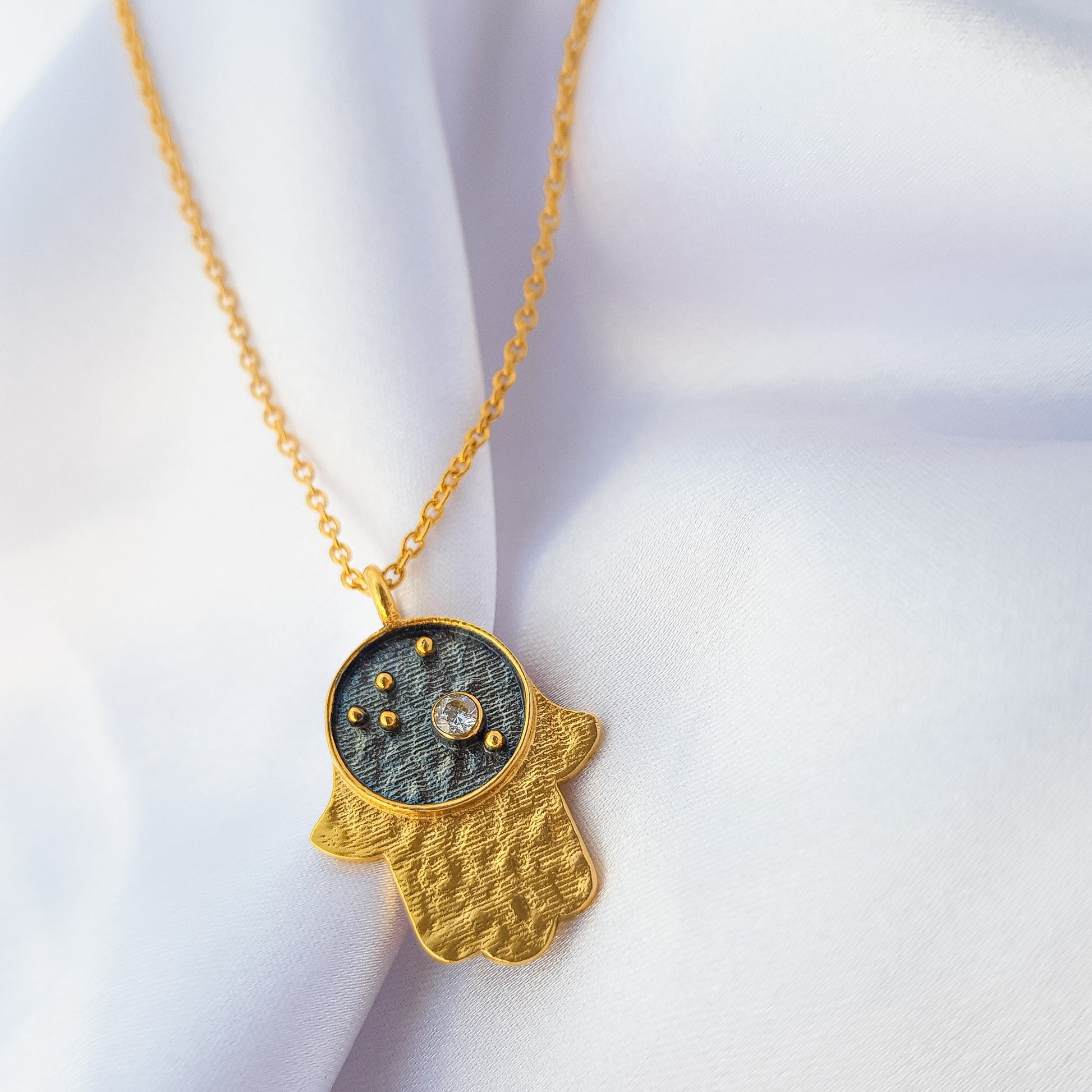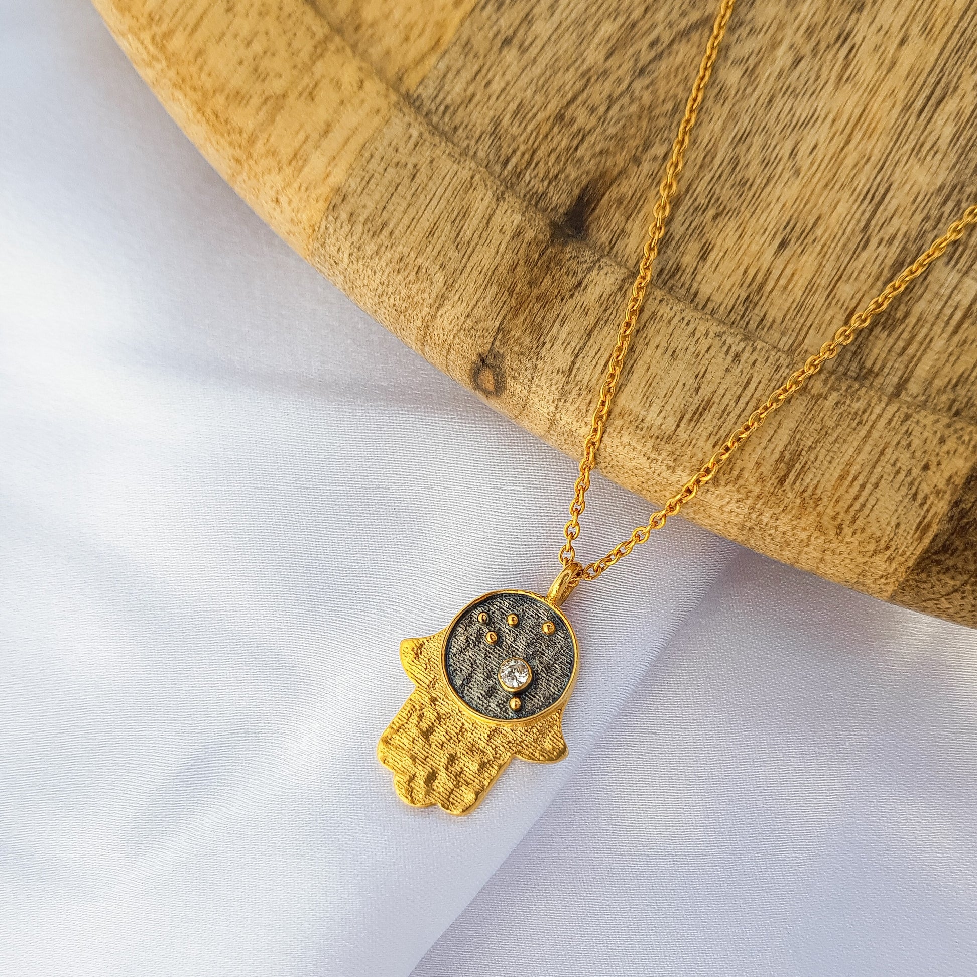 Celebrate your Aries zodiac sign with our stunning constellation chain necklace. Featuring a Hamsa charm and Zircon as birthstone, this two tone necklace is crafted from black rhodium and 22k gold plated 925 sterling silver for durability and style. Perfect for adding a touch of astrology to your outfit. Perfect for any zodiac enthusiast born between March 21 - April 19.