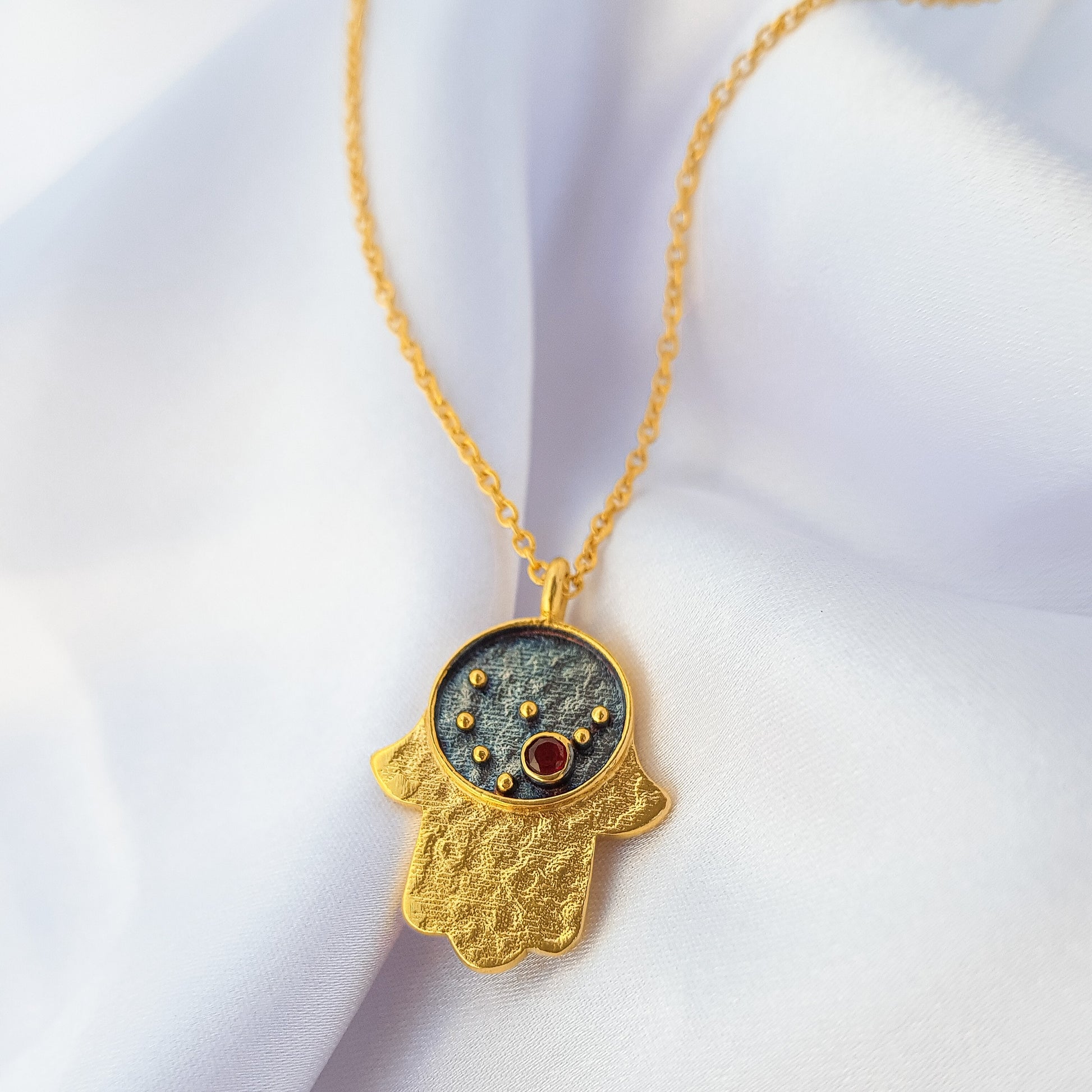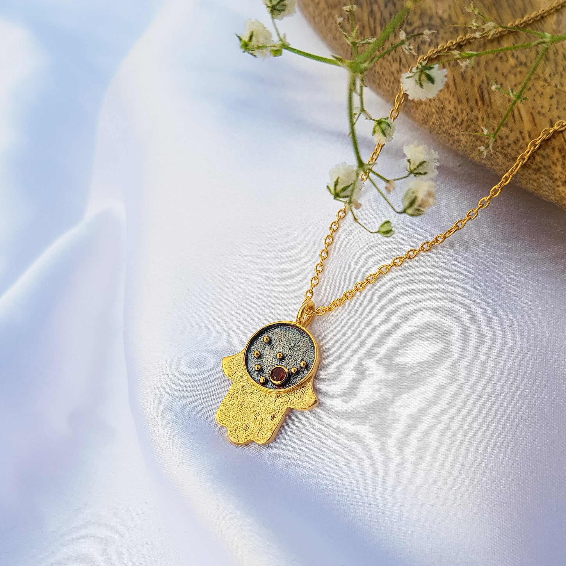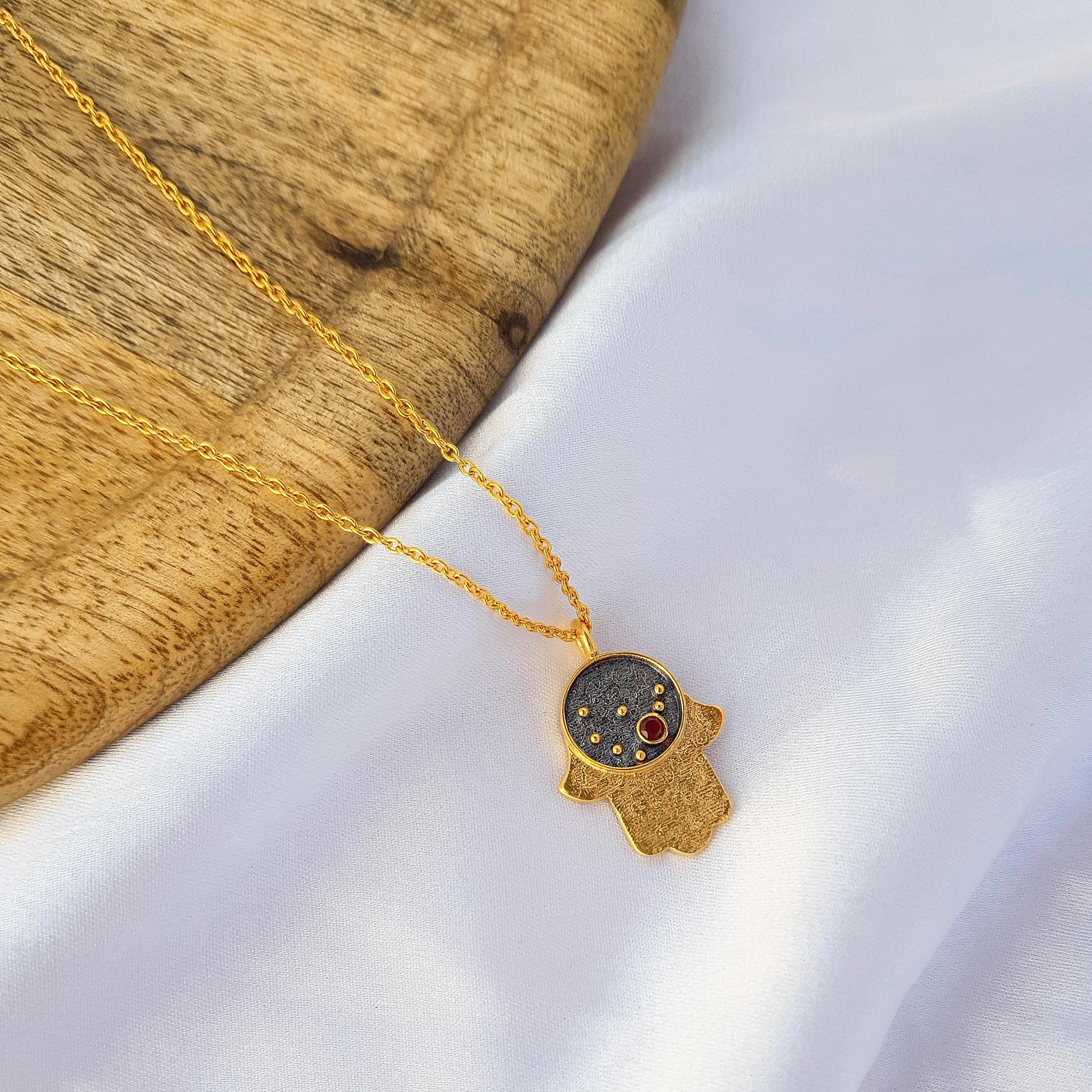 Capricorn Zodiac Constellation chain necklace with Hamsa Charm and Garnet birthstone in two tone black rhodium and 22k gold plated 925 sterling silver