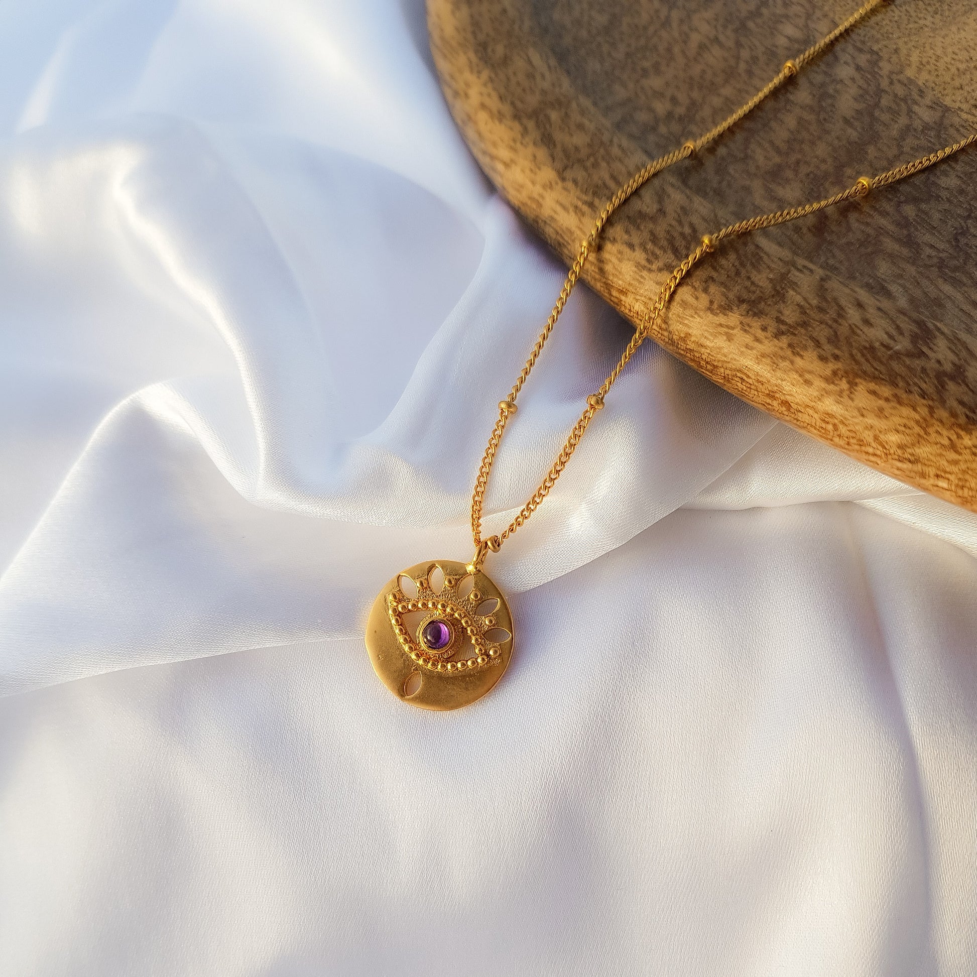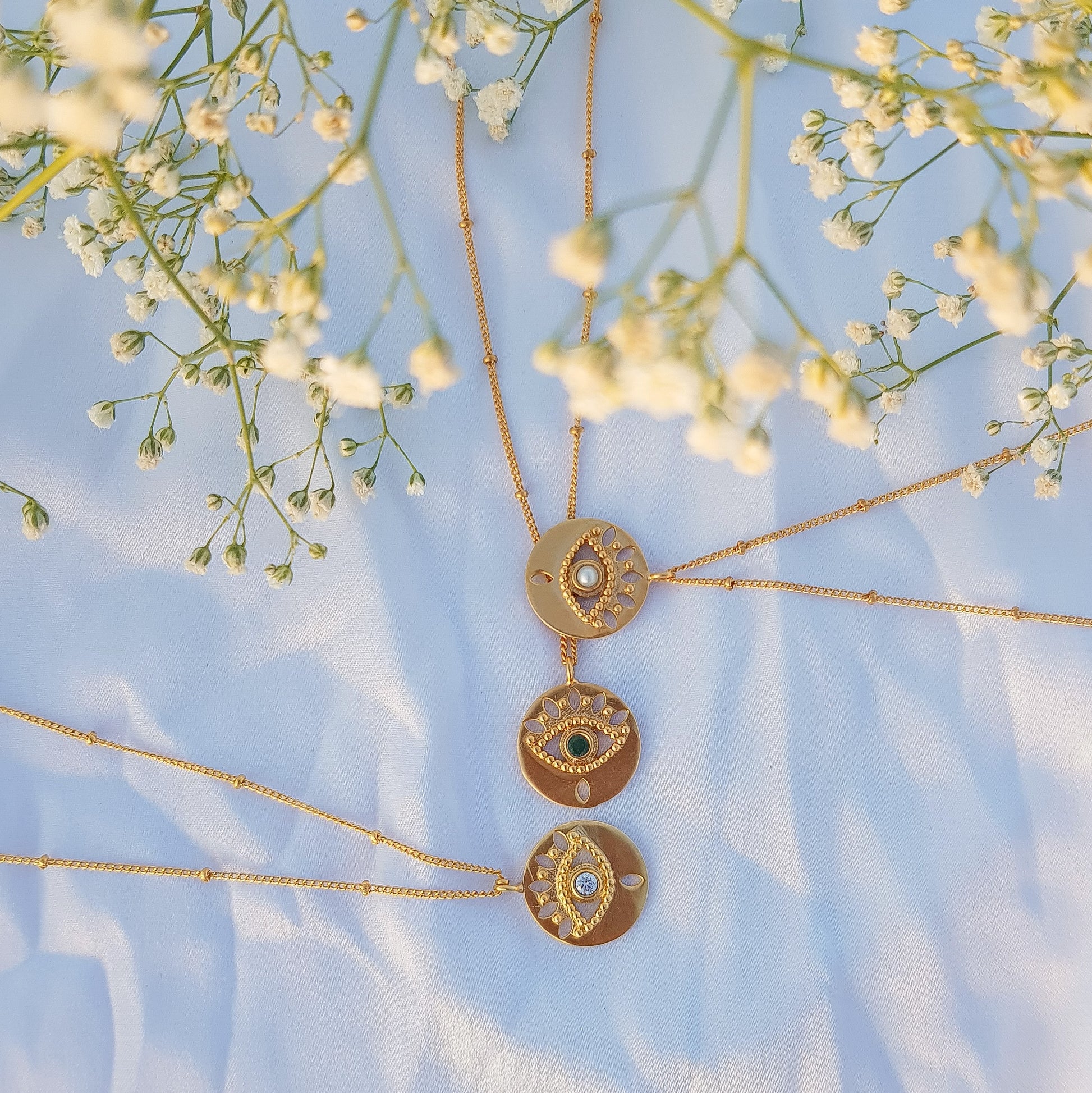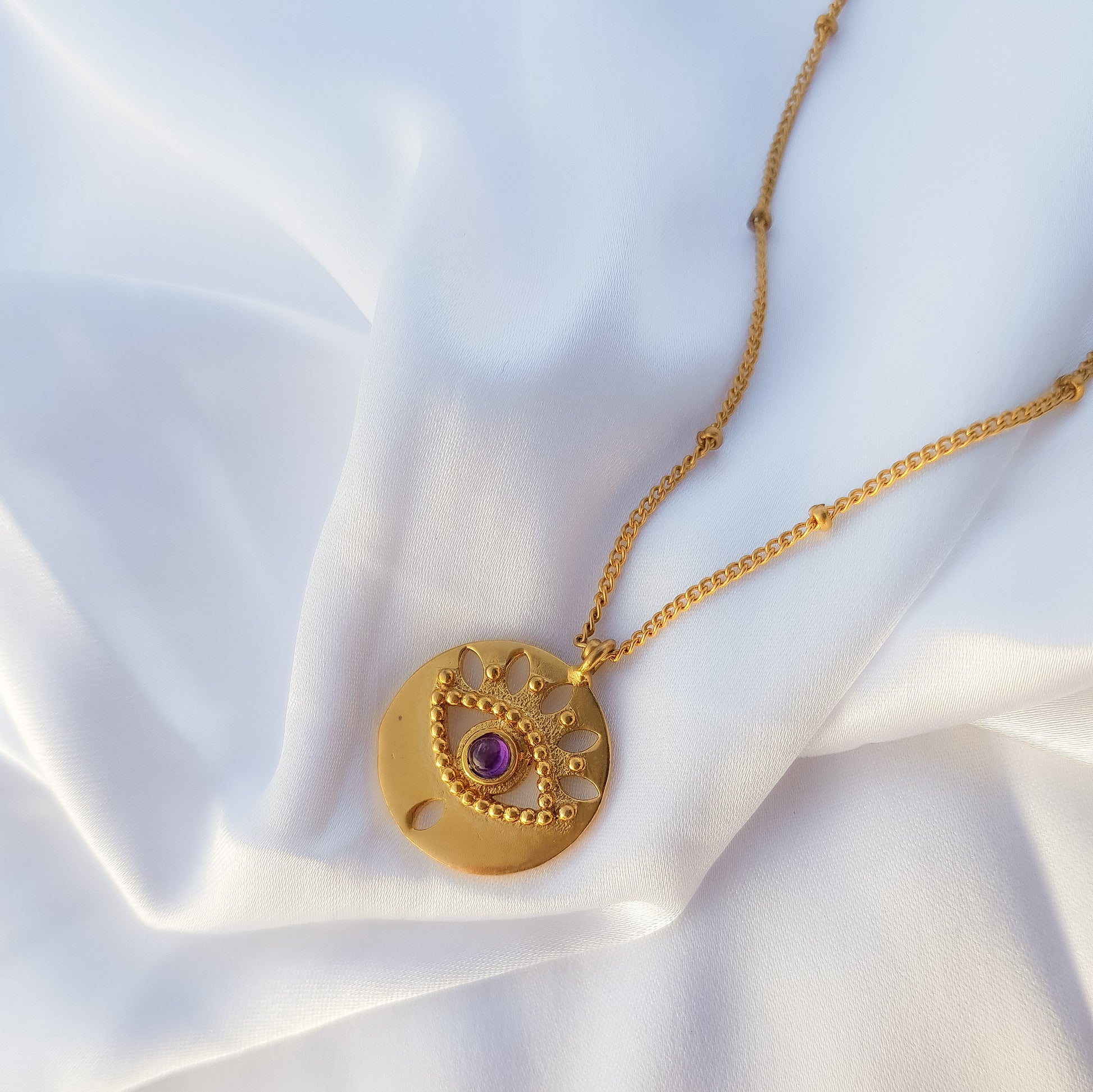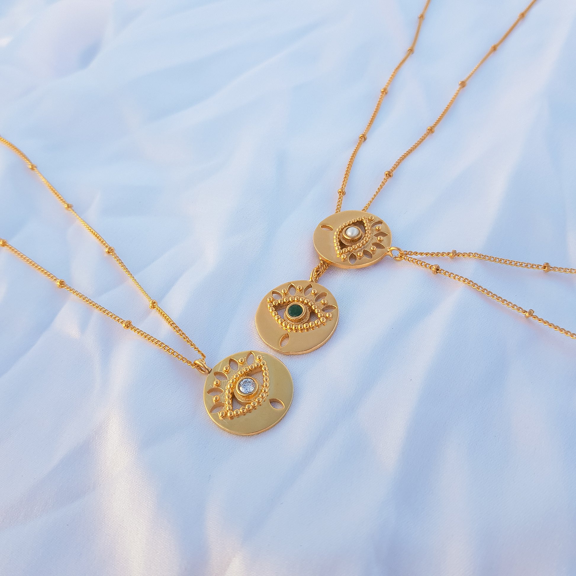 Evil Eye ball chain necklace with pearl, emerald, zircon and amethyst in 22k gold plated 925 sterling silver