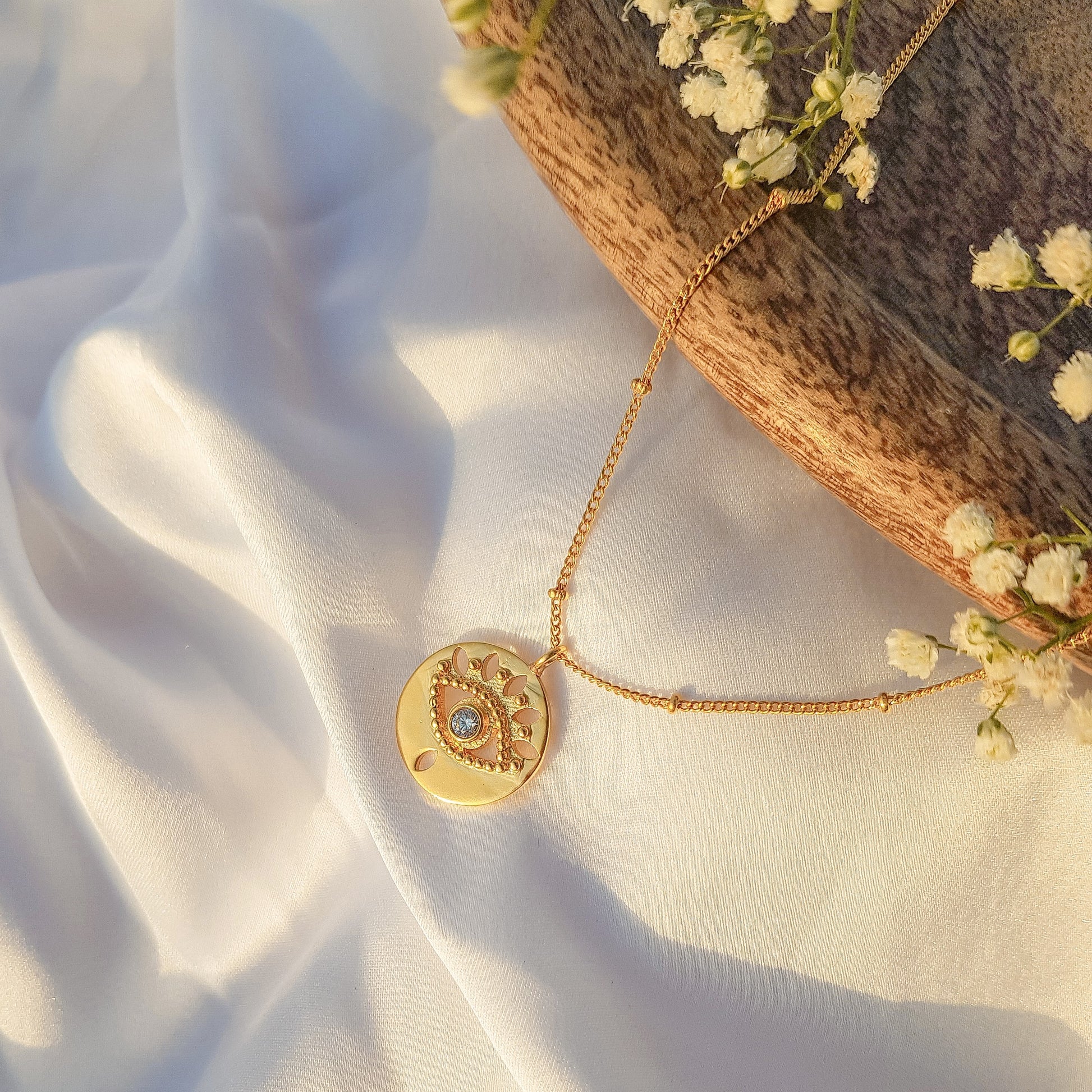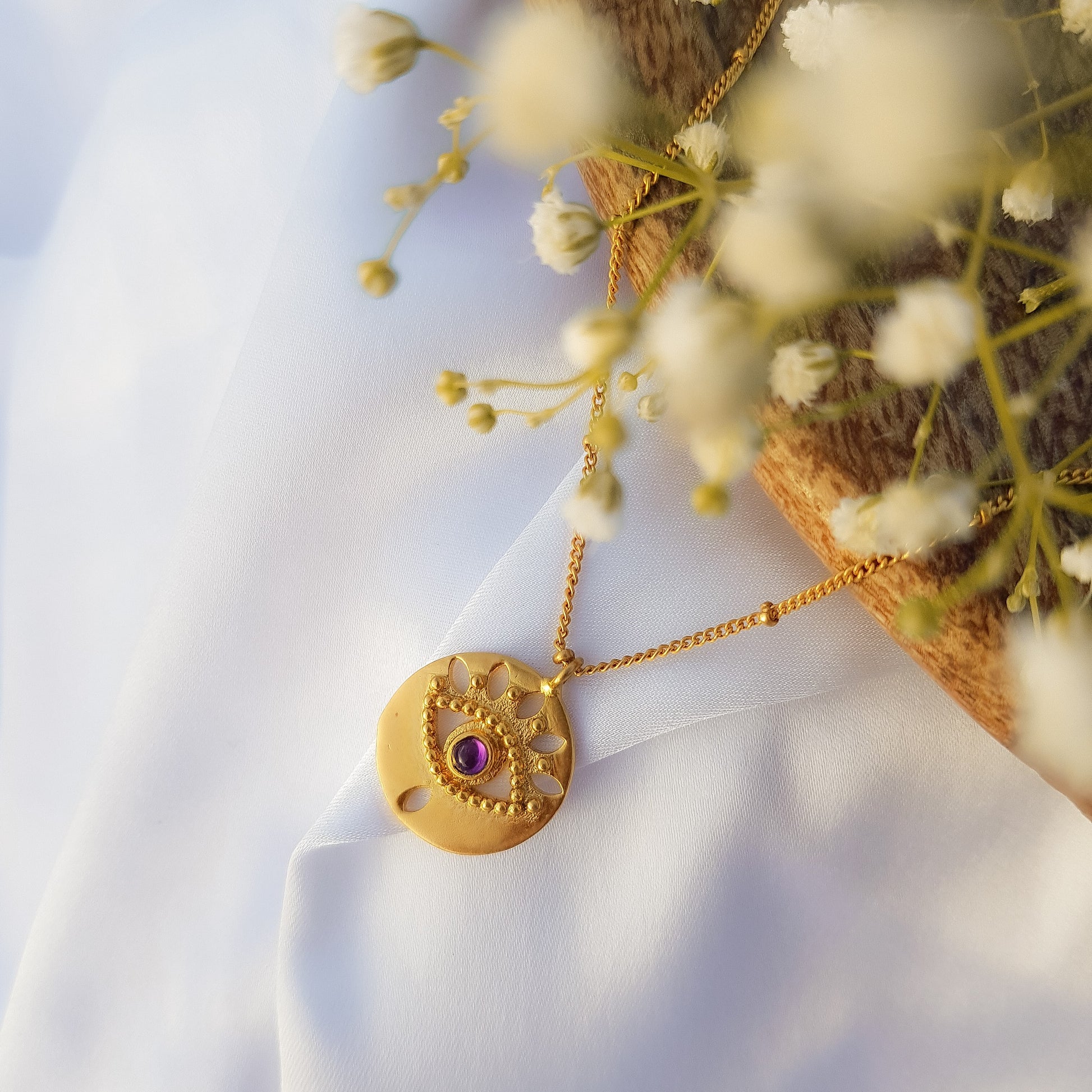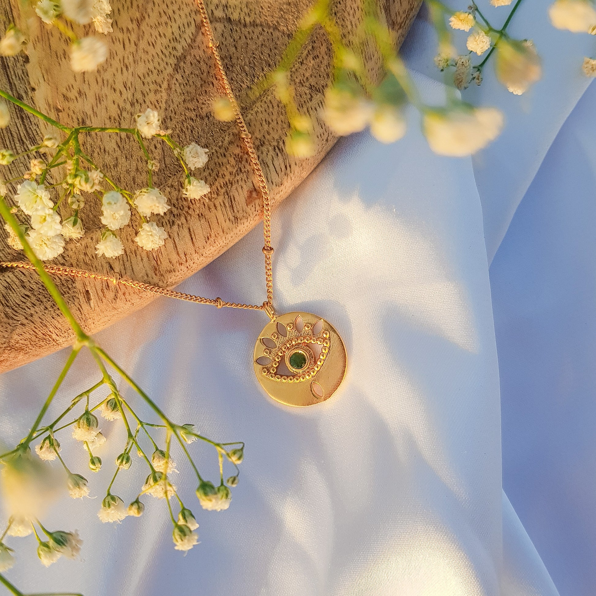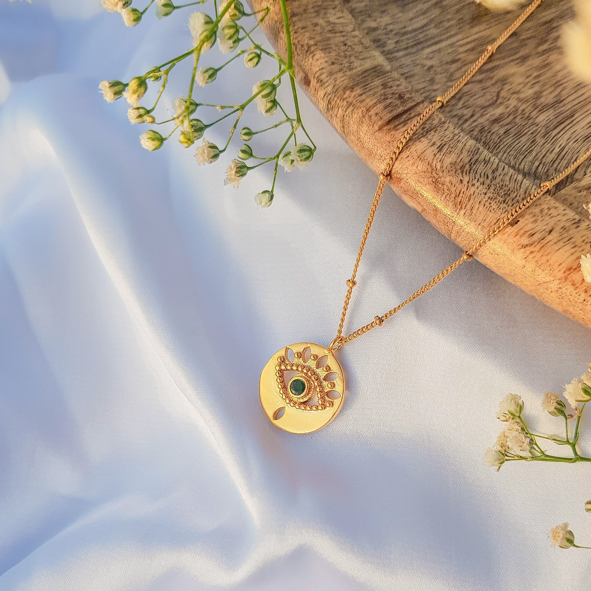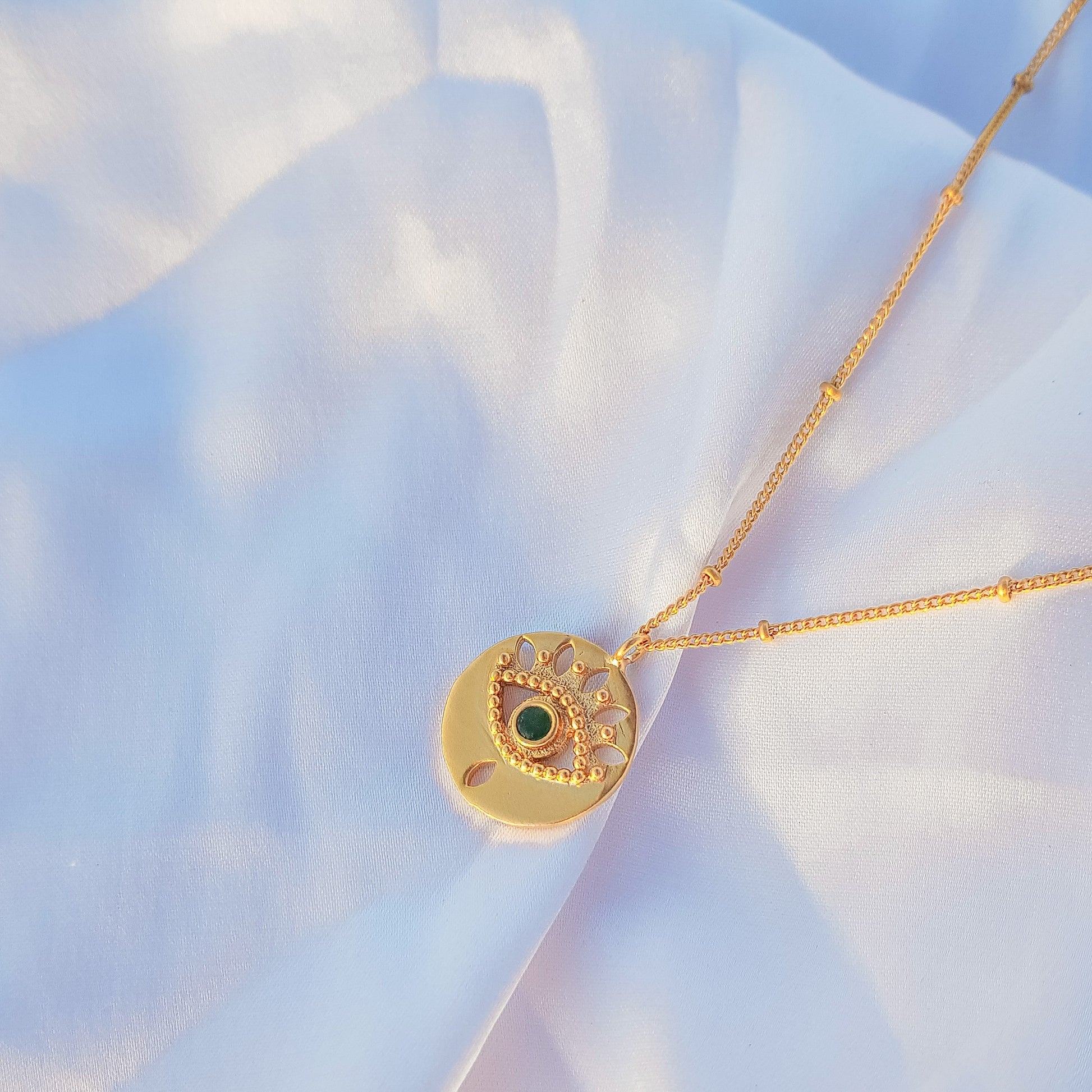 Evil Eye ball chain necklace with pearl, emerald, zircon and amethyst in 22k gold plated 925 sterling silver