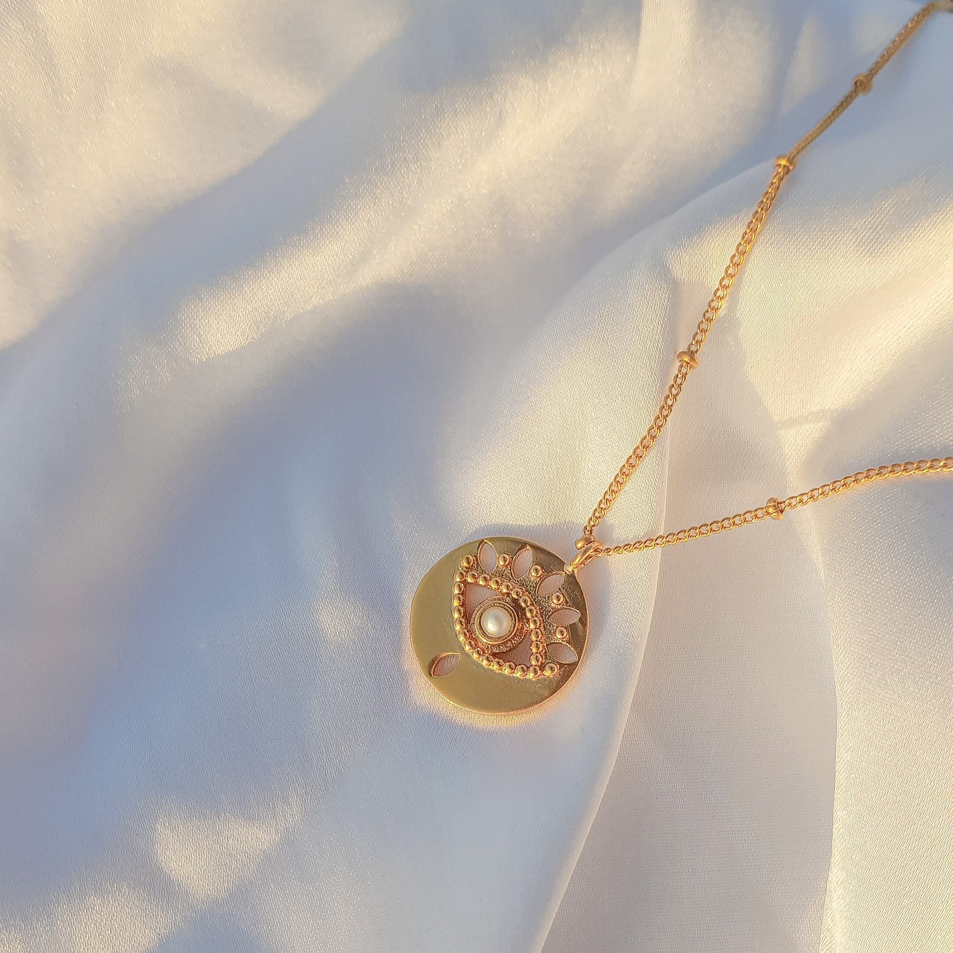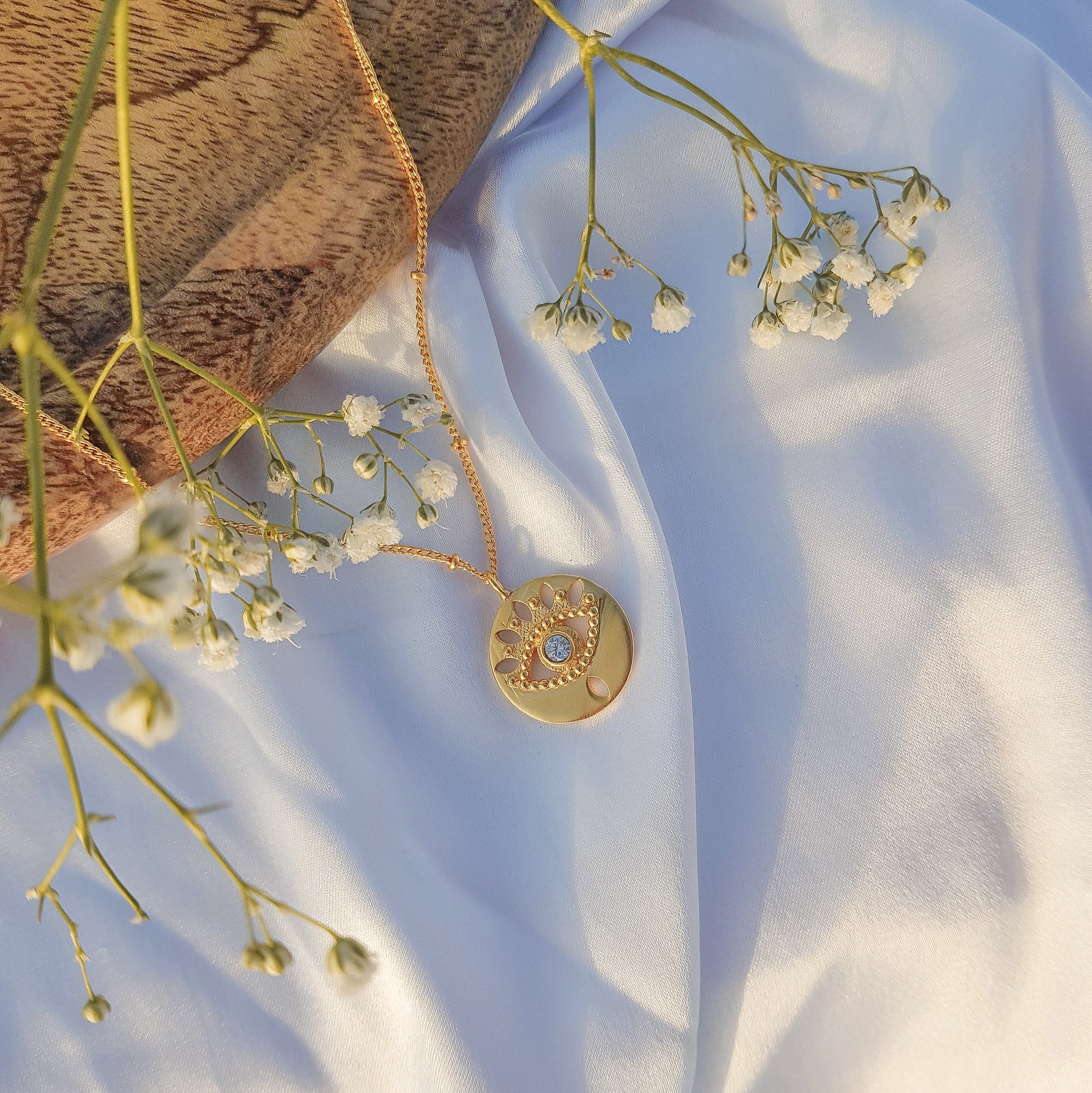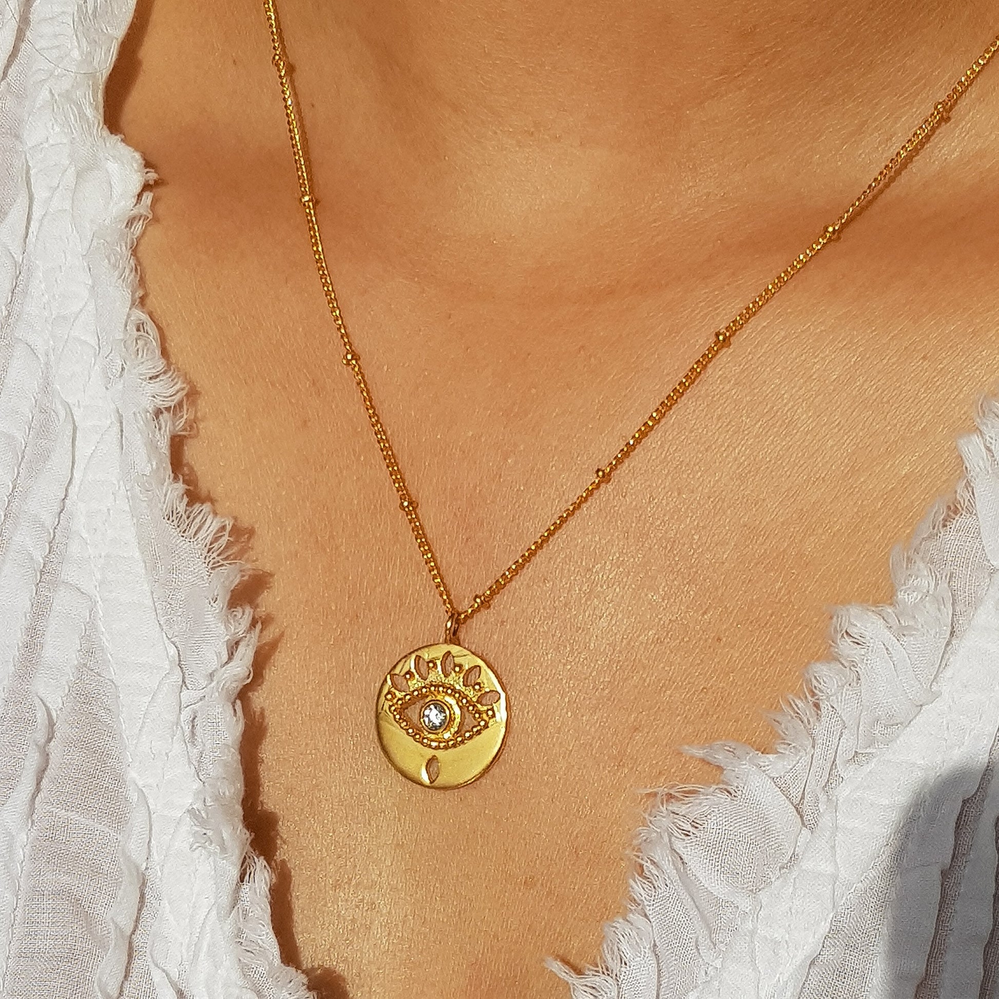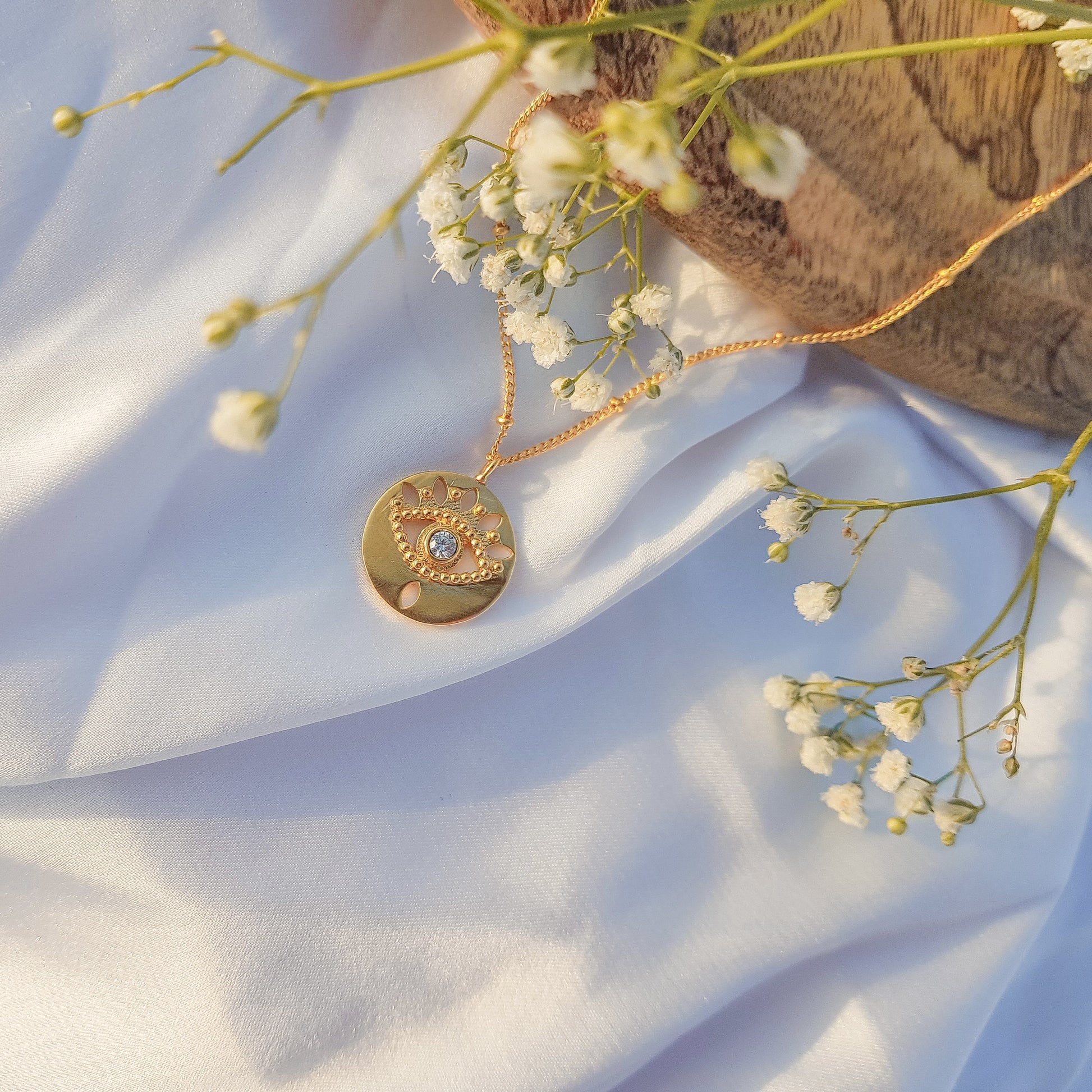 Evil Eye ball chain necklace with pearl, emerald, zircon and amethyst in 22k gold plated 925 sterling silver