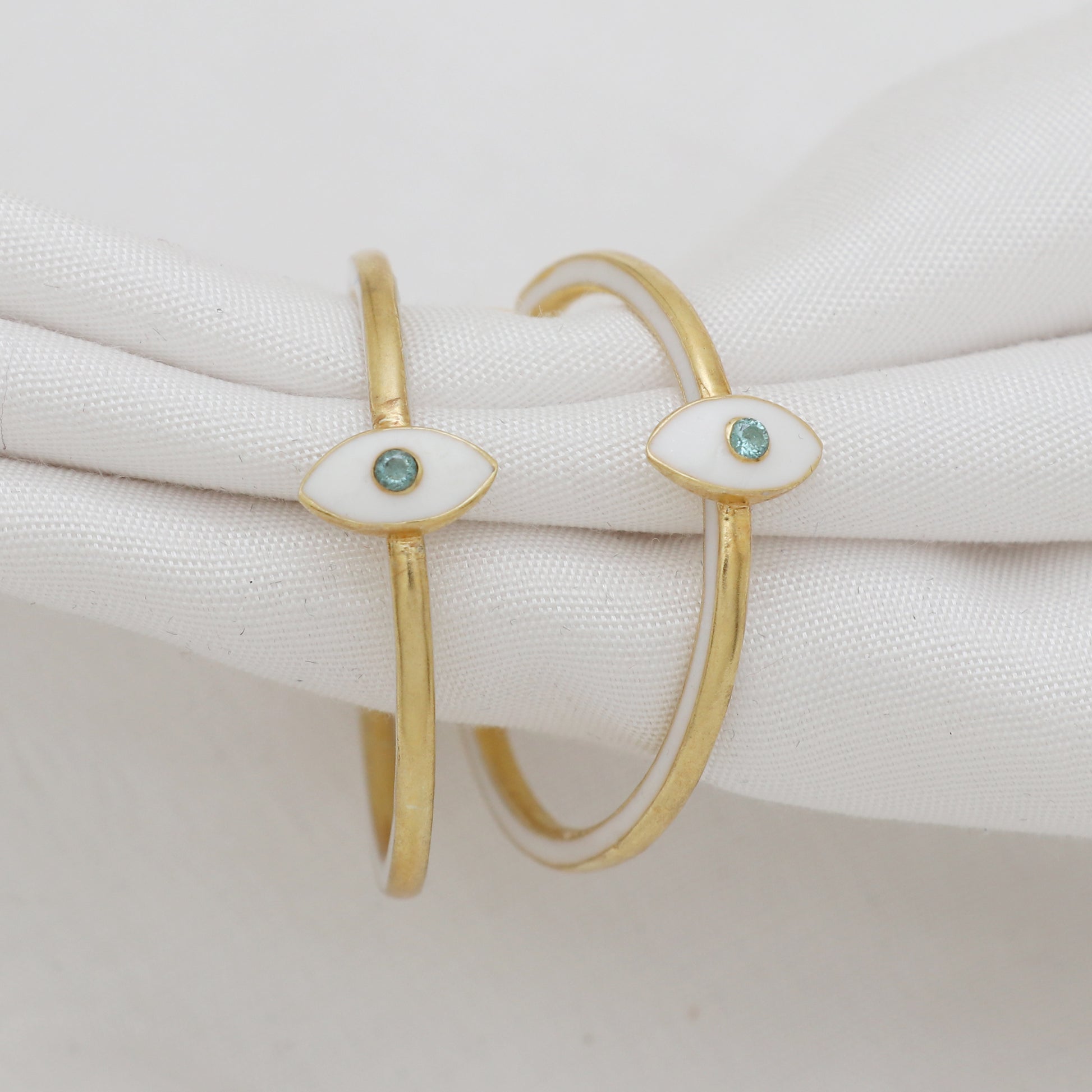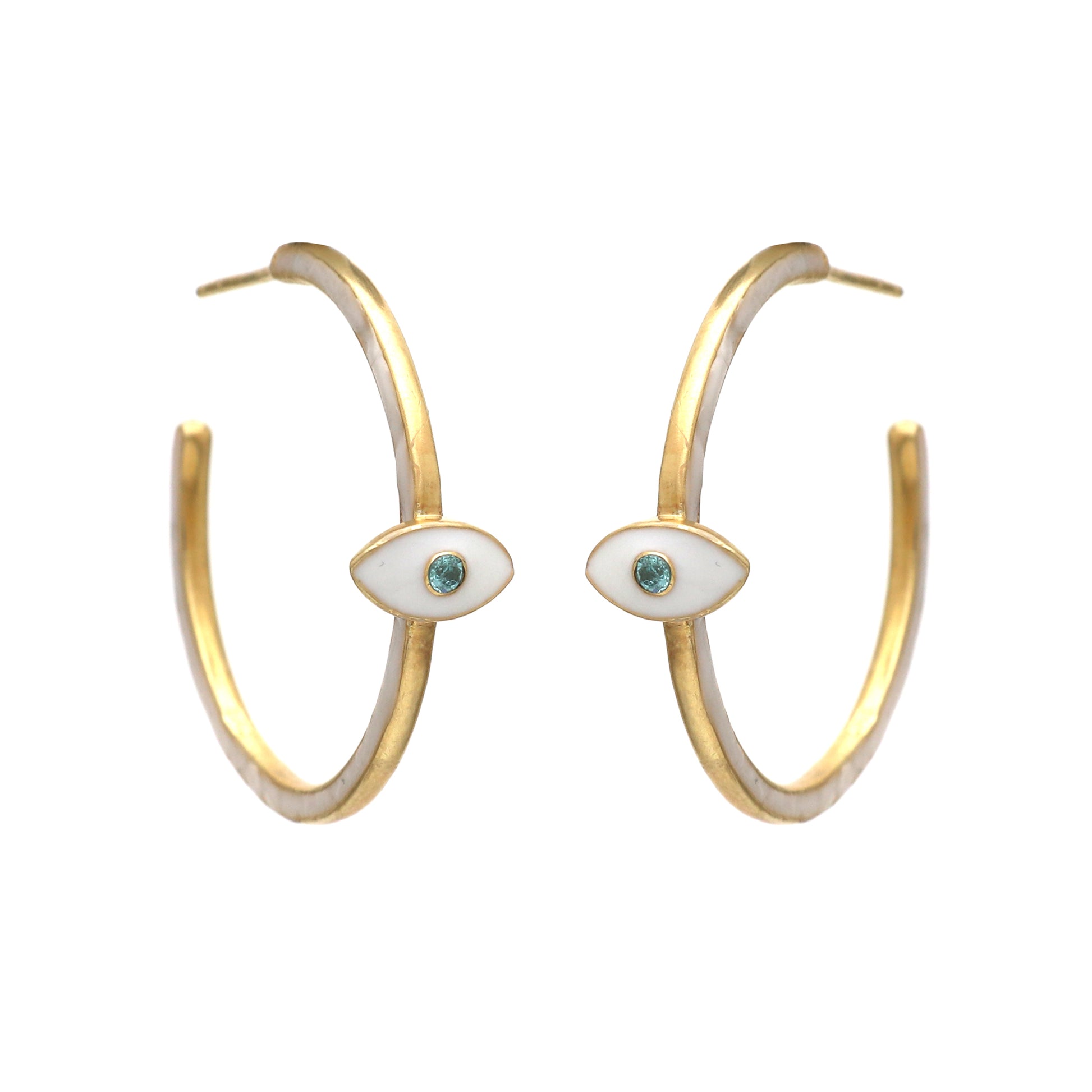 Evil Eye white enamel hoop earrings in gold plated 925 sterling silver with blue topaz gemstone
