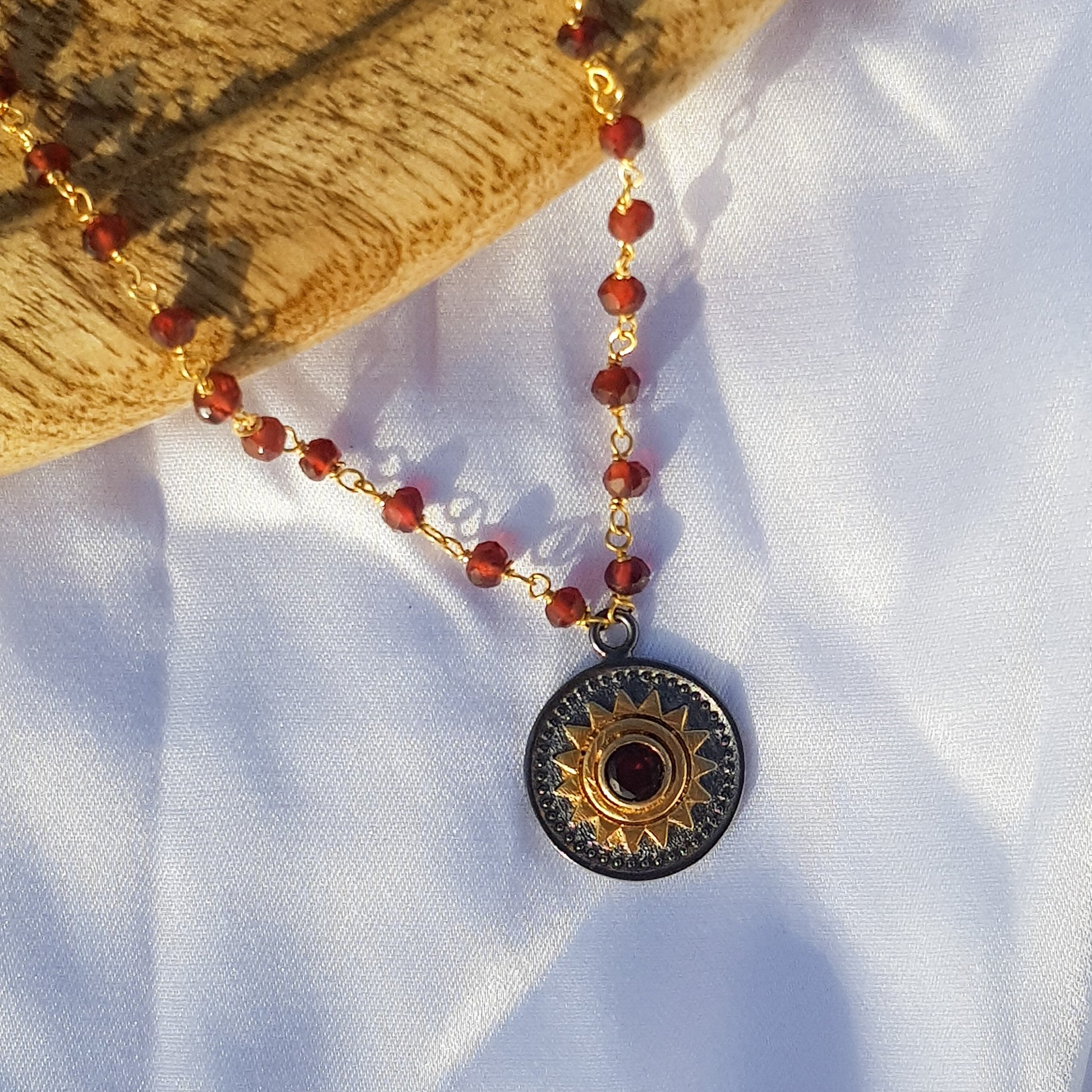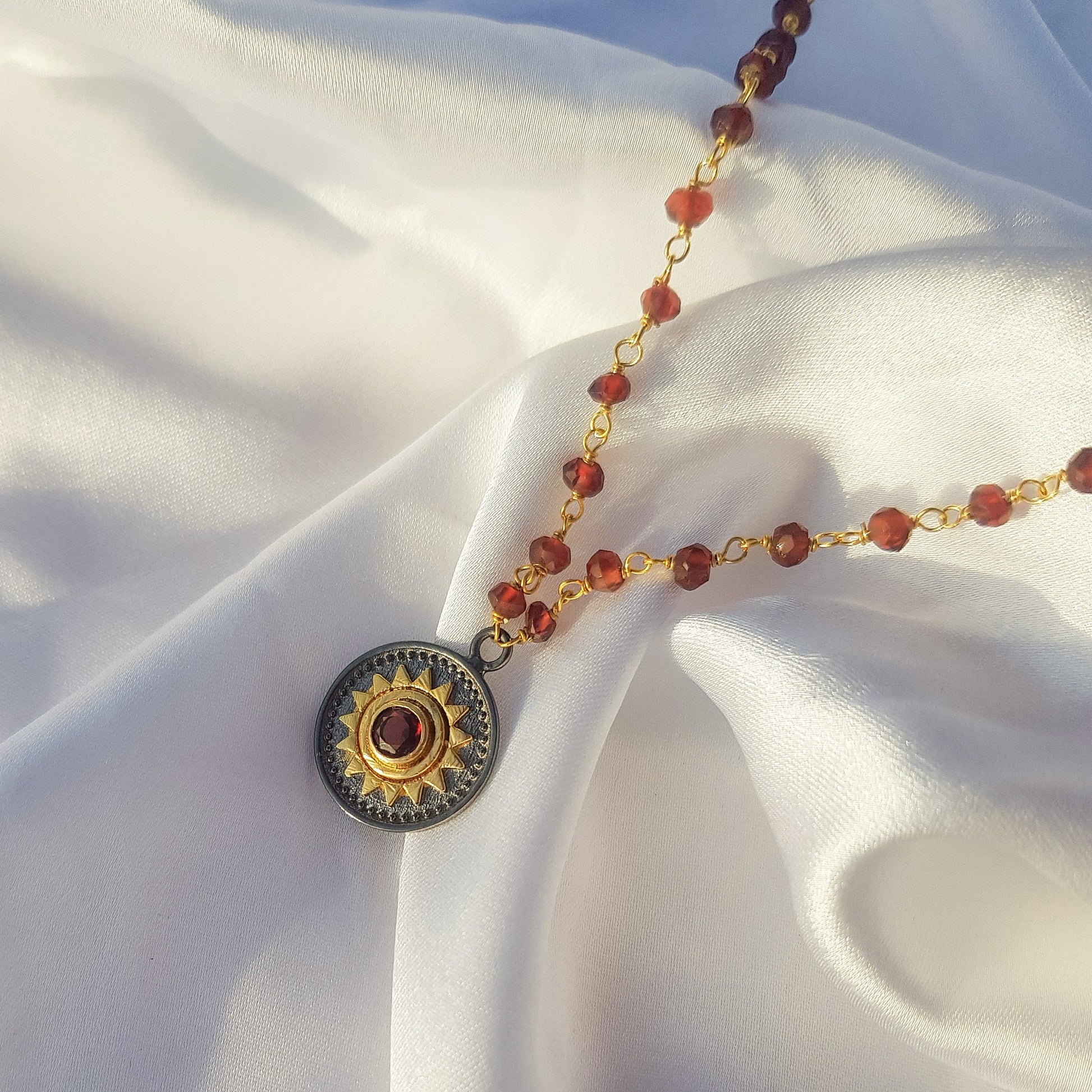 This stunning garnet beaded necklace features a unique Sun charm in two tone black rhodium and 22k gold plated 925 sterling silver. The warm tones of the gold and the deep red of the garnet evoke feelings of passion, strength, and positive energy. Stand out and radiate positivity with this beautiful necklace.