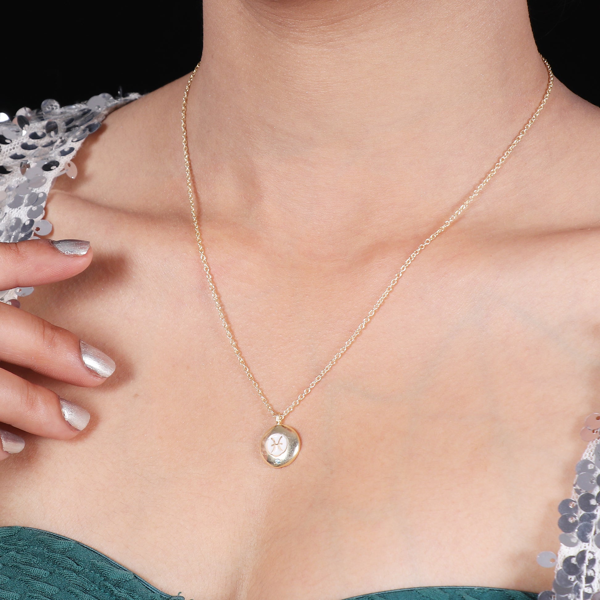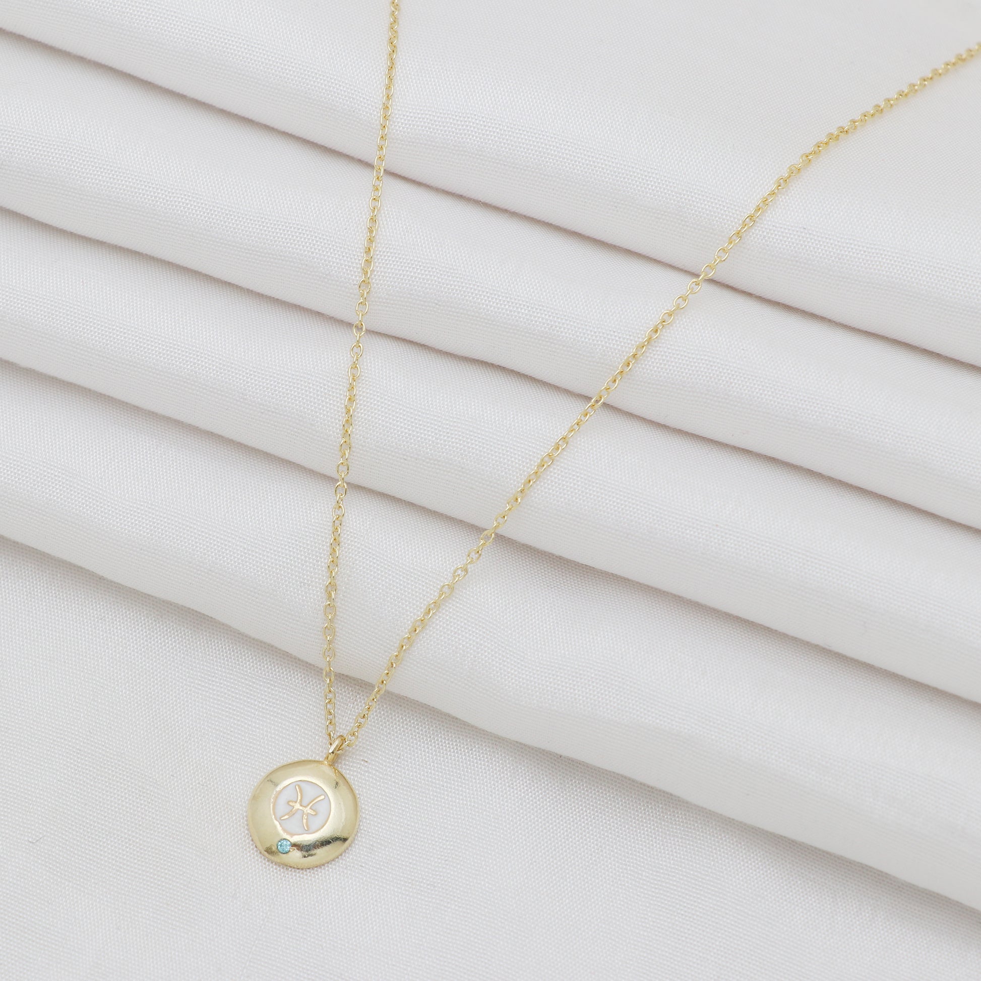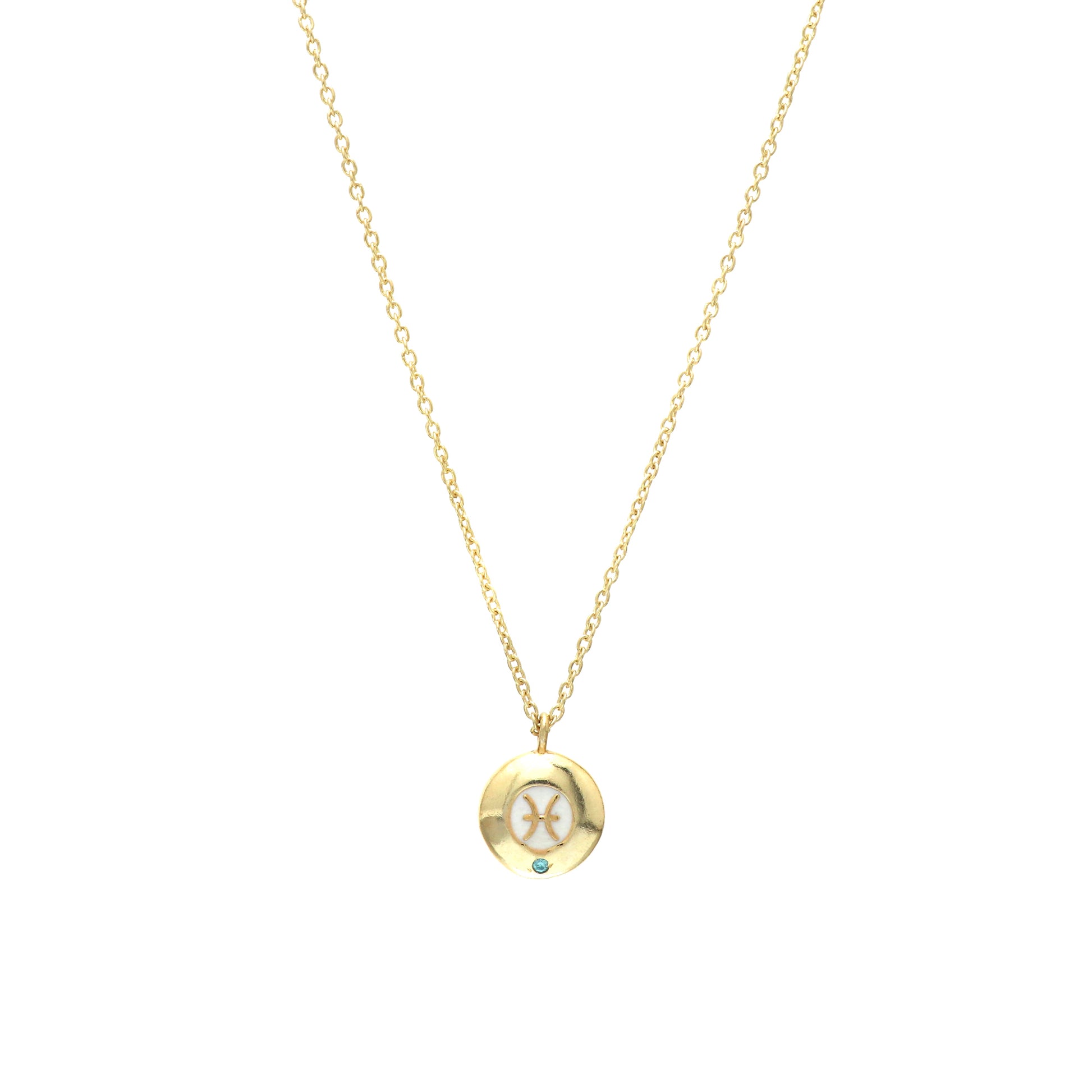 This elegant Pisces Zodiac Sign chain necklace features a beautiful white enamel pendant adorned with an Blue Topaz as birthstone. Made from 22k gold plated 925 sterling silver, it's the perfect accessory for any Pisces. Effortlessly display your astrological sign while adding a touch of luxury to your wardrobe. Perfect for any zodiac enthusiast born between February 19 - March 20.