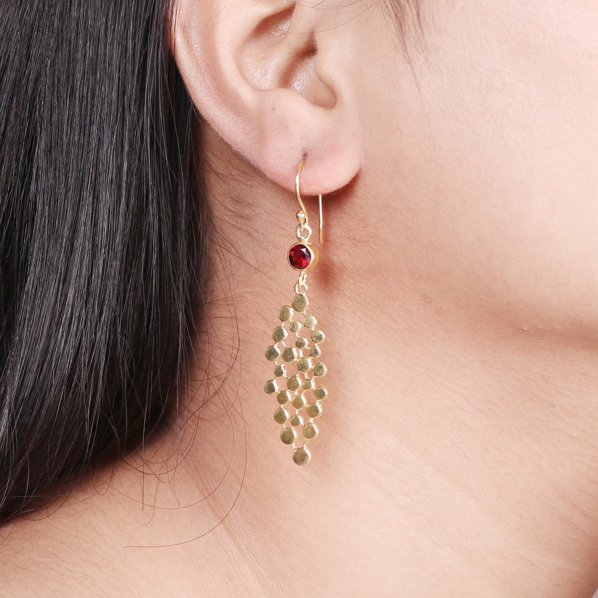 Expertly crafted with 925 sterling silver and a stunning garnet gemstone, these gold plated earrings are a timeless addition to any jewelry collection. The gold plating adds a touch of elegance while the garnet gemstone brings natural beauty and positive energy to the wearer. Experience luxury and style with these exquisite earrings.