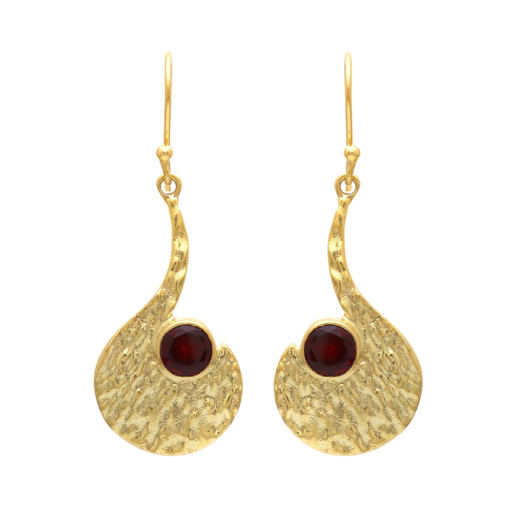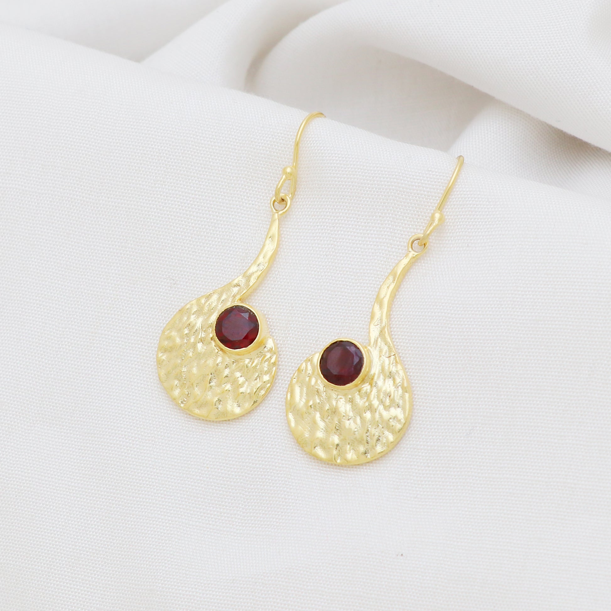 Gold plated 925 sterling silver textured earrings with garnet gemstone