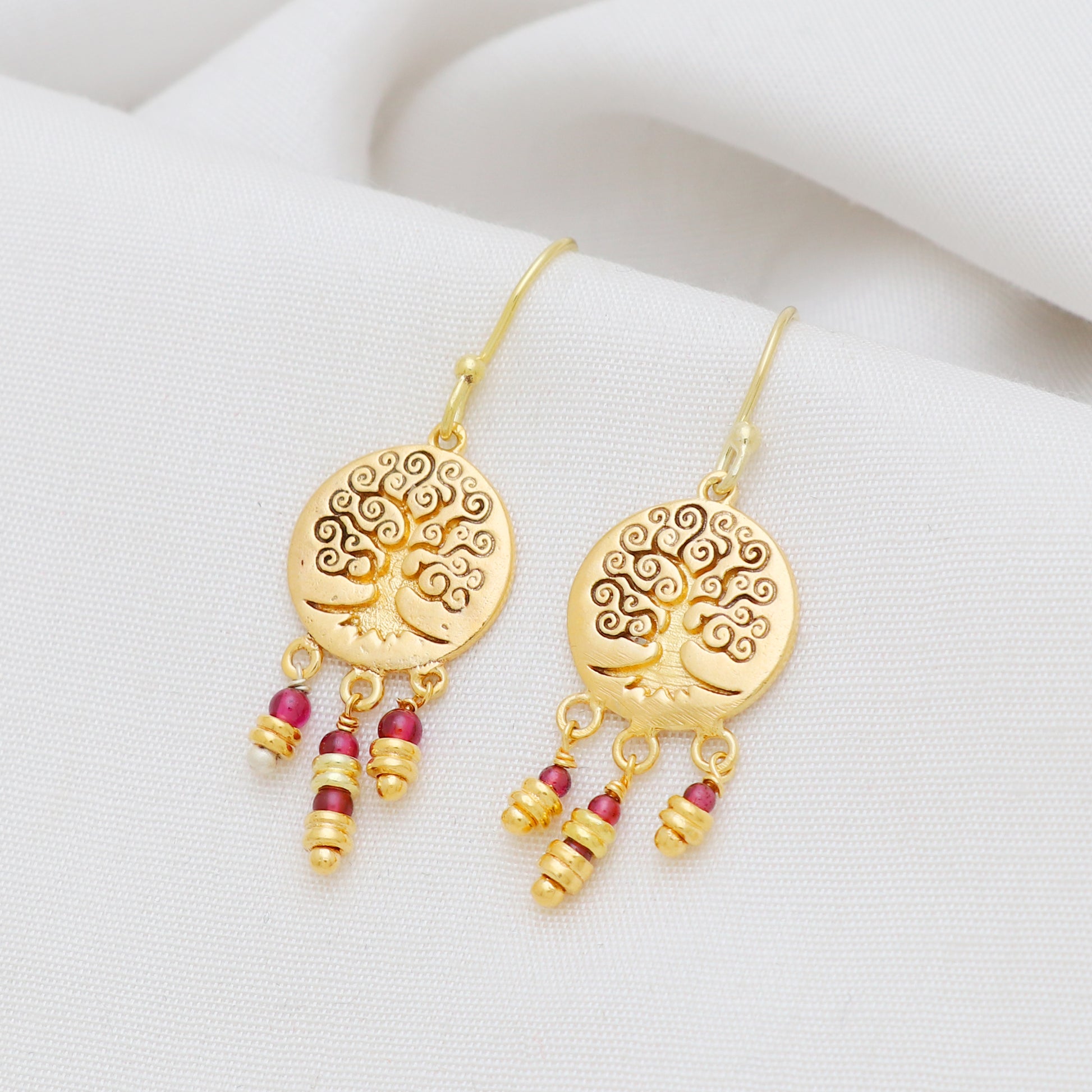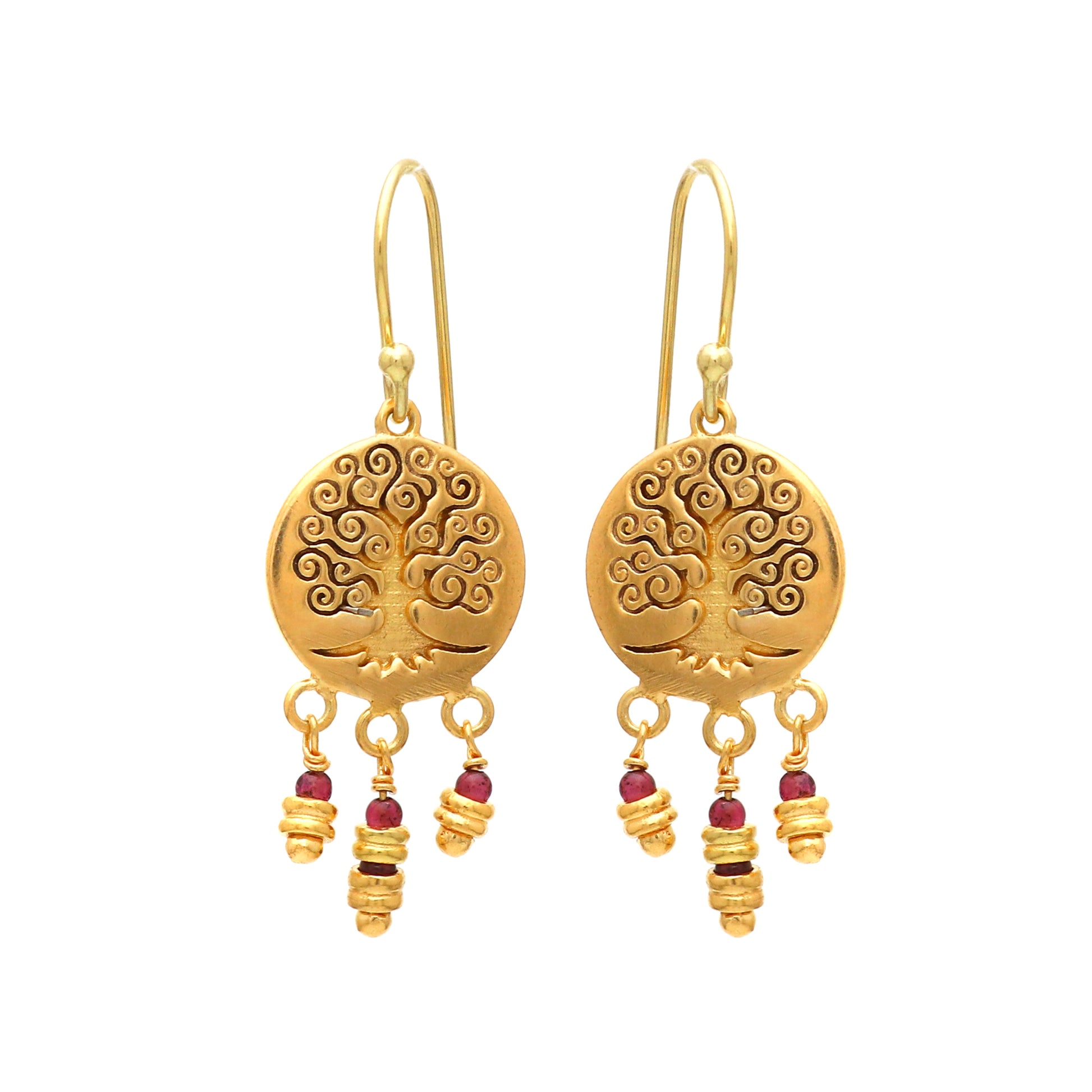 Gold plated 925 sterling silver tree of life earrings with garnet gemstone
