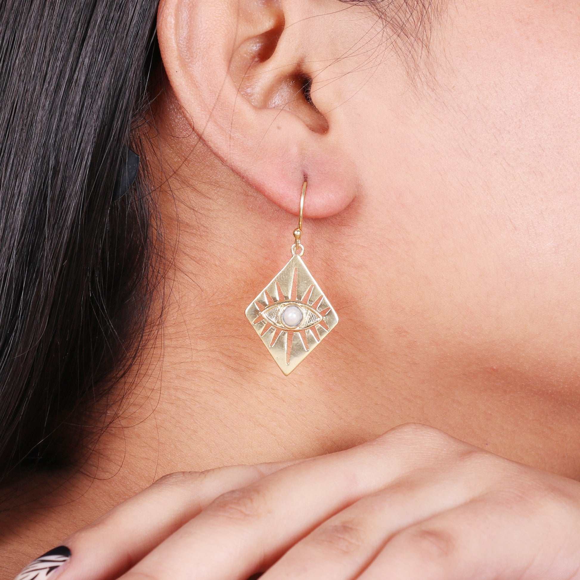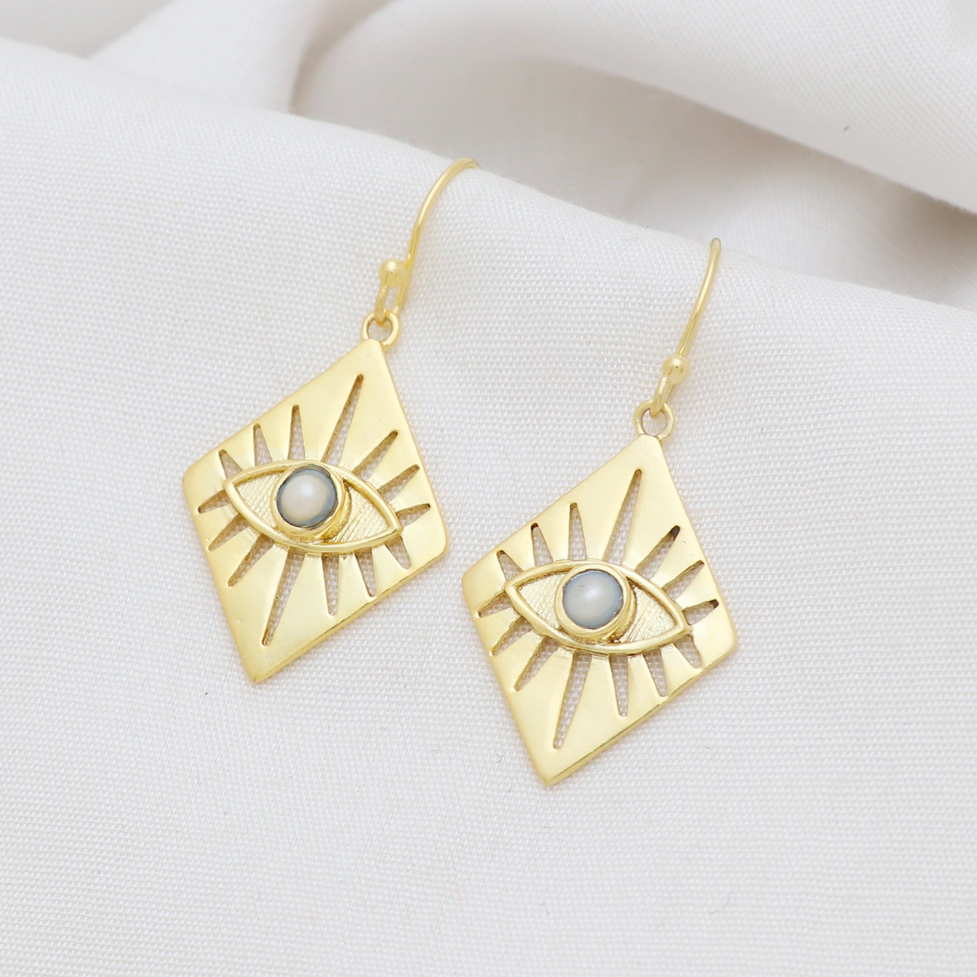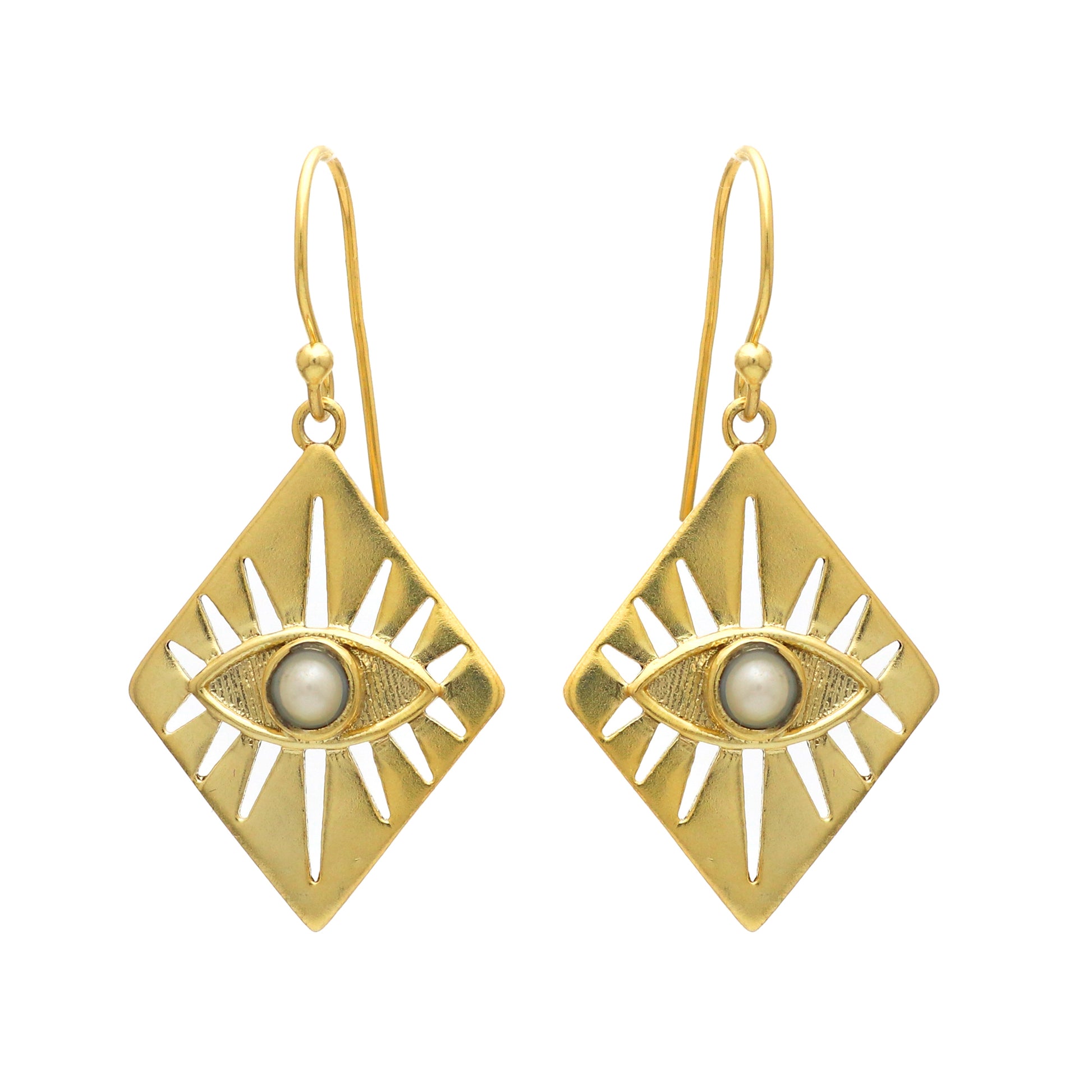 These elegant earrings feature a gold plated evil eye charm and a pearl gemstone set on 925 sterling silver. Handcrafted and timeless, they add a touch of sophistication to any outfit while also bringing good luck and protection to the wearer. Made with high quality materials, they are a must-have for any jewelry collection.