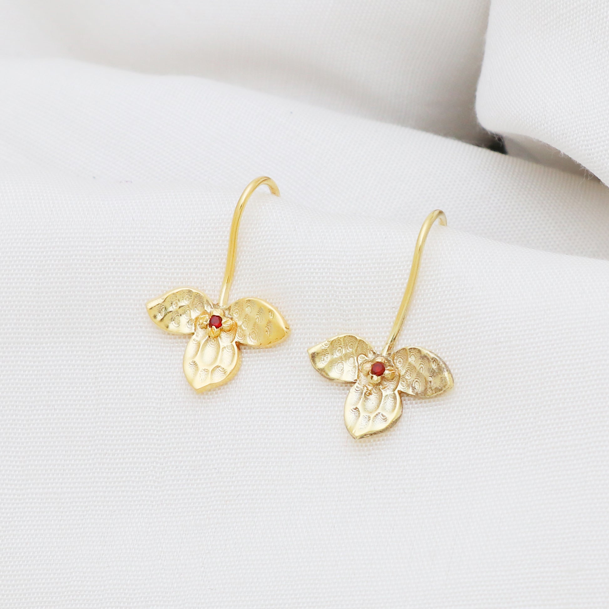 Hammered earring with garnet gemstone in gold plated 925 sterling silver