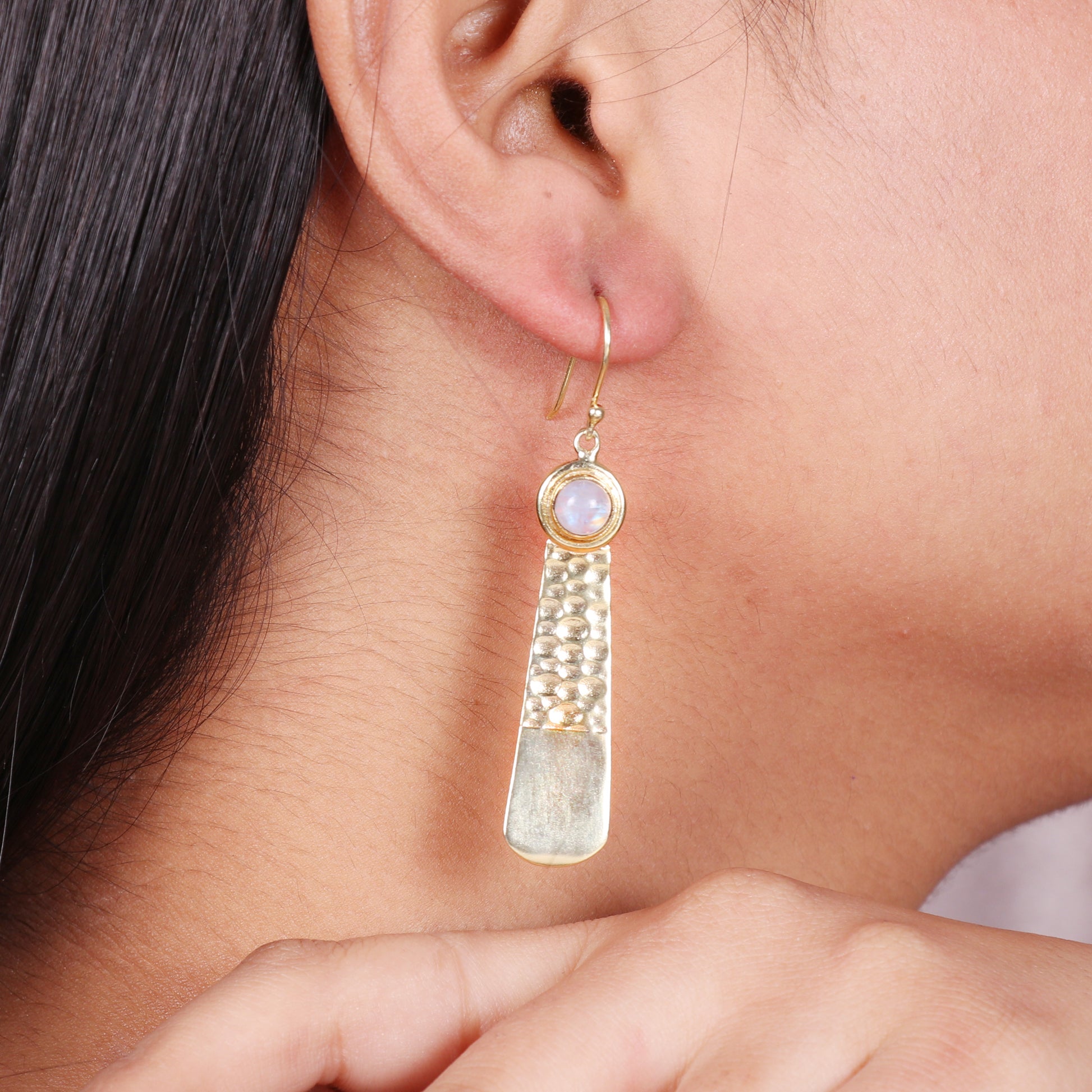 Expertly crafted with 925 sterling silver and a stunning rainbow moonstone gemstone, these earrings feature a beautifully hammered texture and a luxurious gold plated finish. Elevate any outfit with the unique and elegant design, while enjoying the healing and balancing benefits of the natural gemstone.