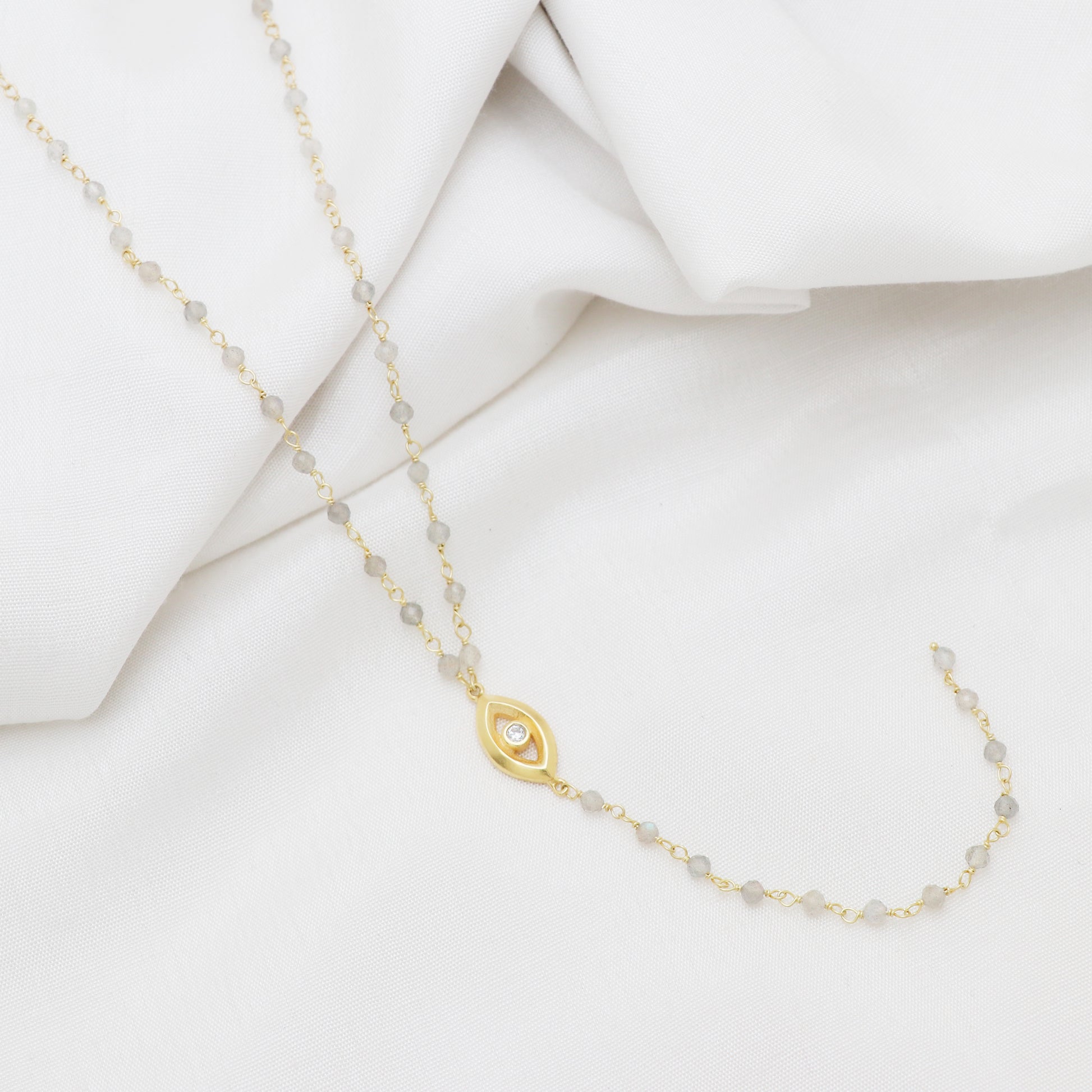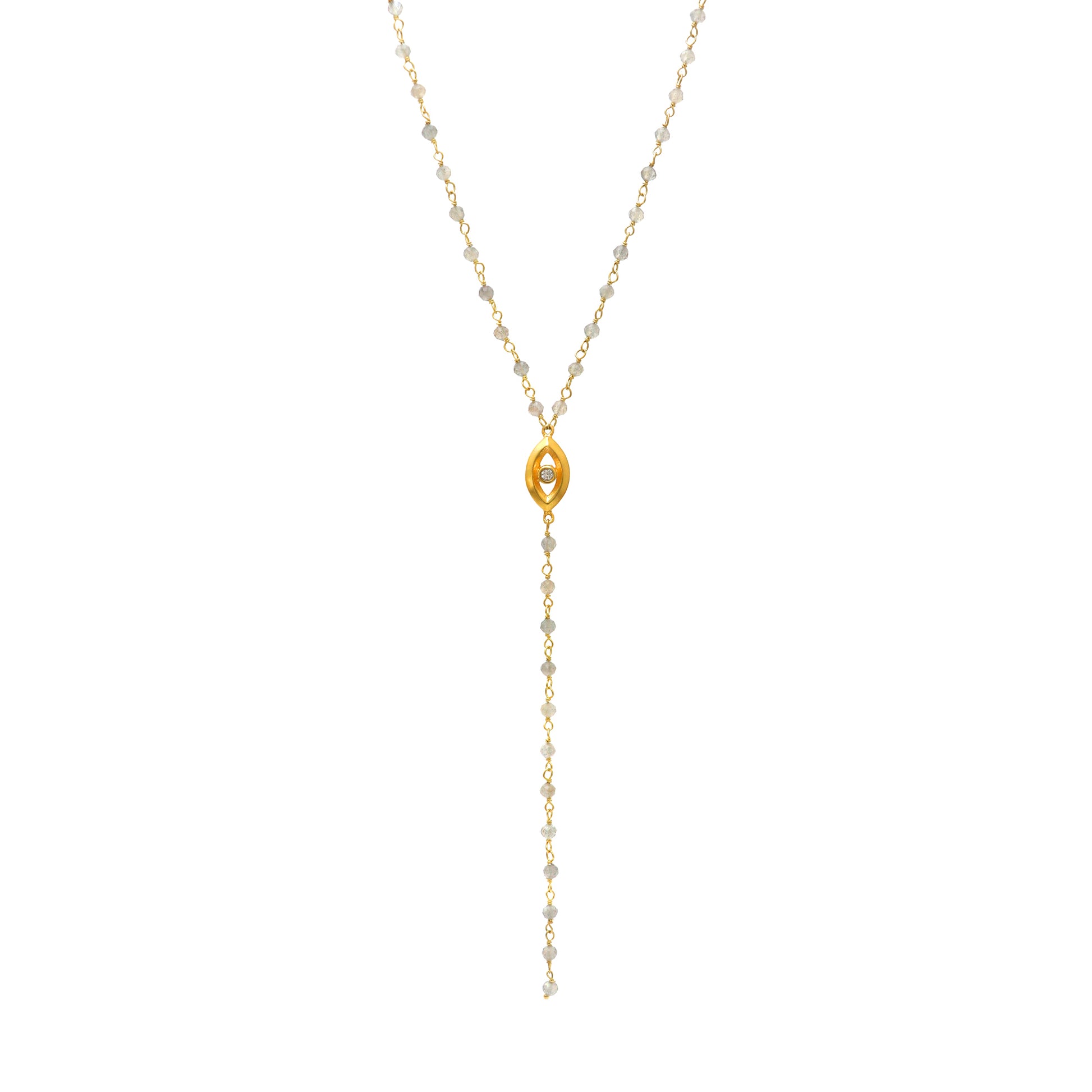 Labradorite rosary Y necklace with evil eye charm and zircon stone in 22k gold plated 925 sterling silver