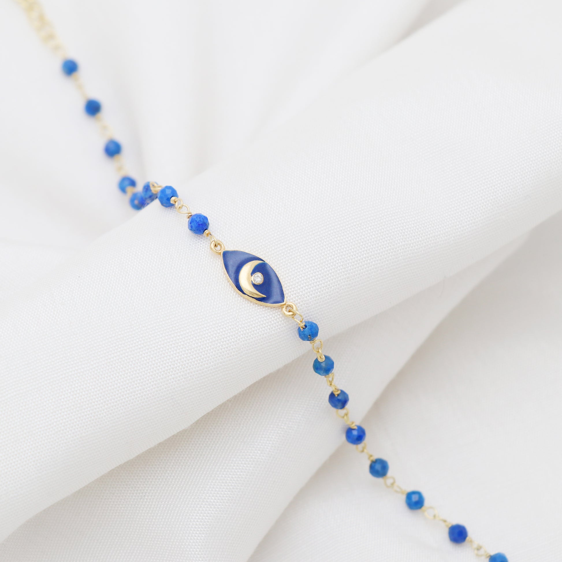 Elevate your style with our Lapis Lazuli Blue Enamel Moon Charm Rosary Bracelet. Made of gold plated 925 sterling silver, this bracelet features a beautiful lapis lazuli moon charm. Enhance any outfit with the power of lapis lazuli and the elegance of gold.