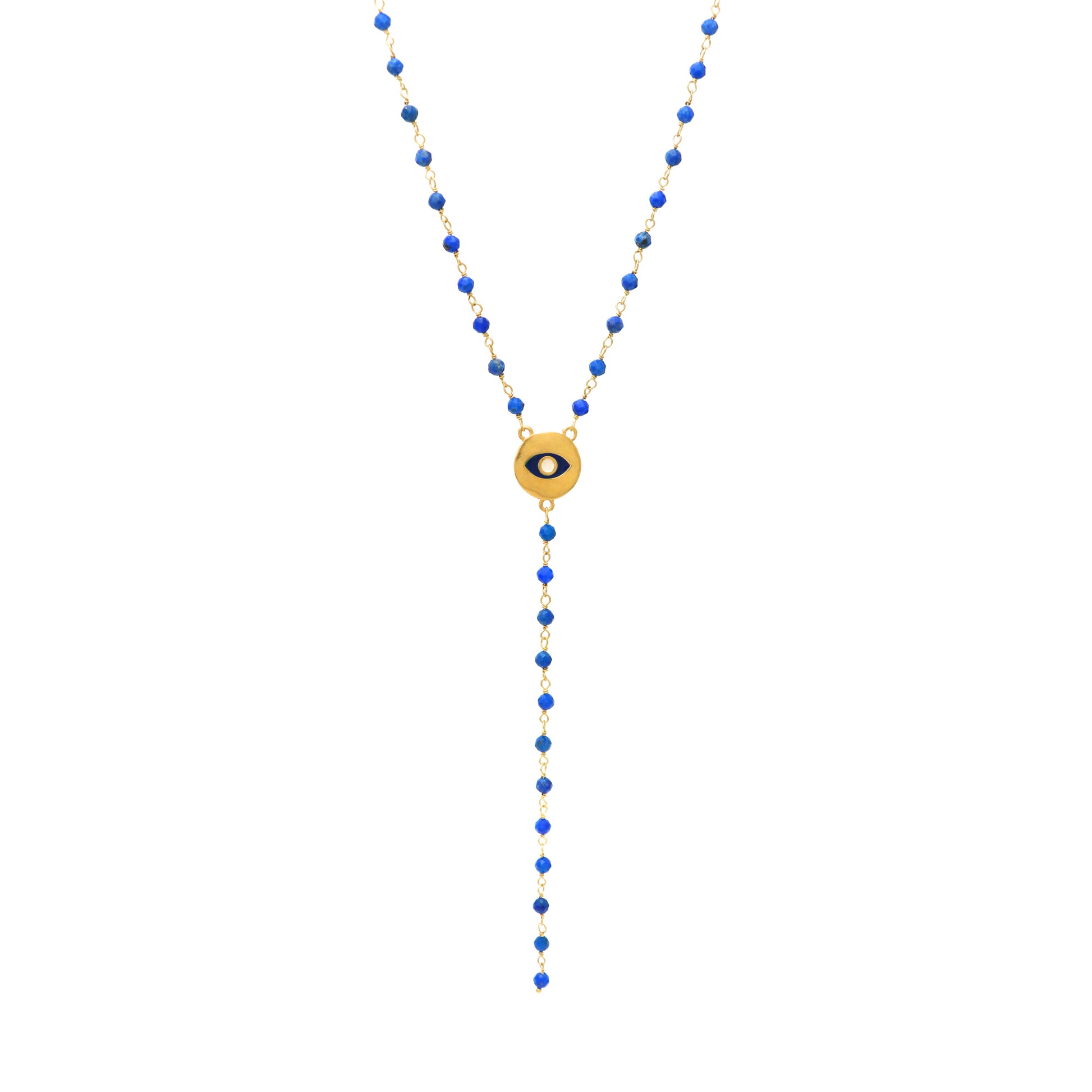 Capture the captivating energy of the Lapis Lazuli rosary Y necklace. Made with 22K gold plated Brass or 925 sterling silver, this necklace features a stunning blue and white enamel evil eye charm. Embrace the protective powers of the lapis lazuli stone, while adding a touch of elegance and style to your wardrobe.