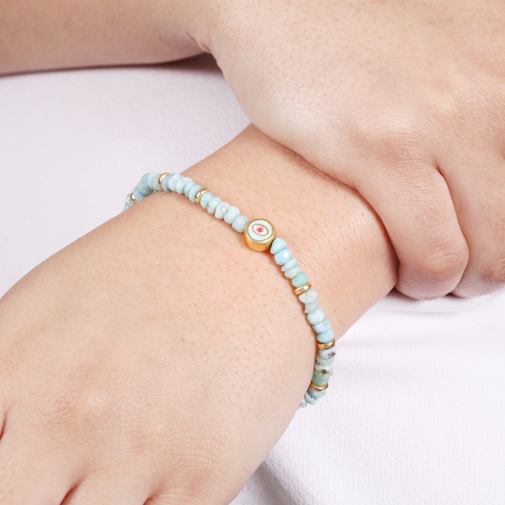 Larimar evil eye charm stretch bracelet with blue,whie and pink enamel in gold plated 925 sterling silver