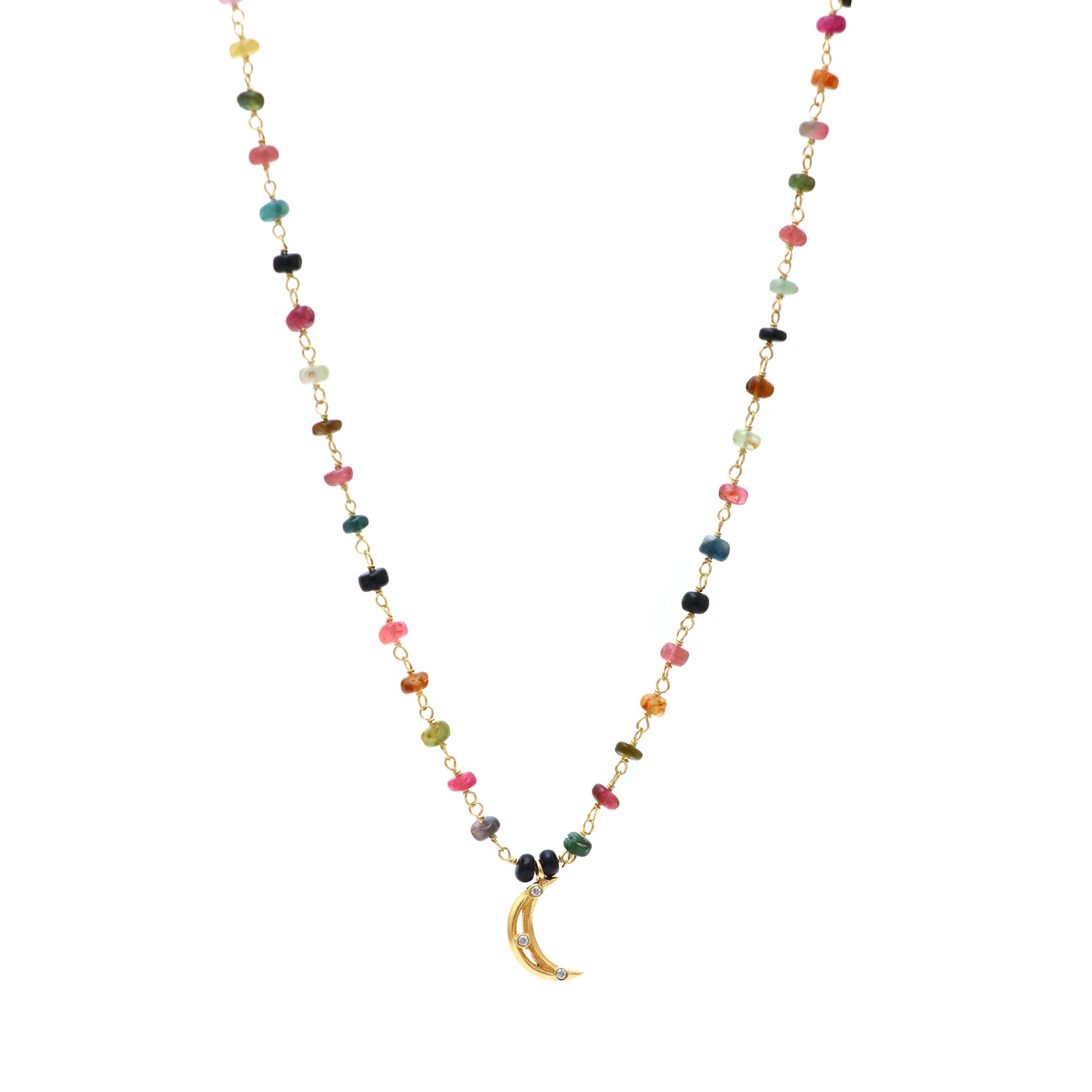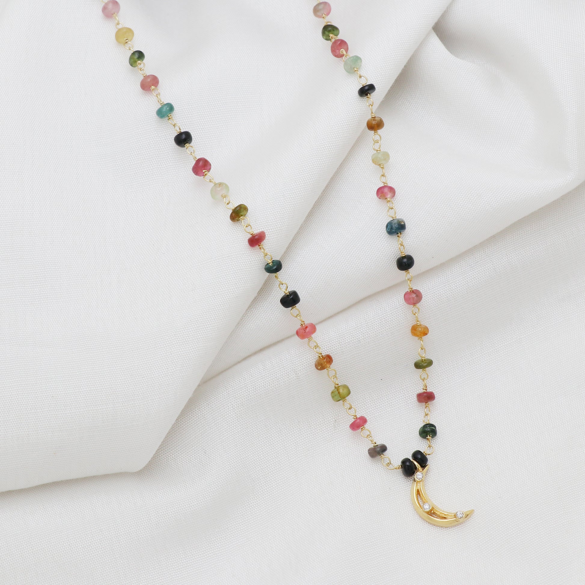 Multi Tourmaline beaded necklace with Moon charm in Gold plated 925 sterling silver