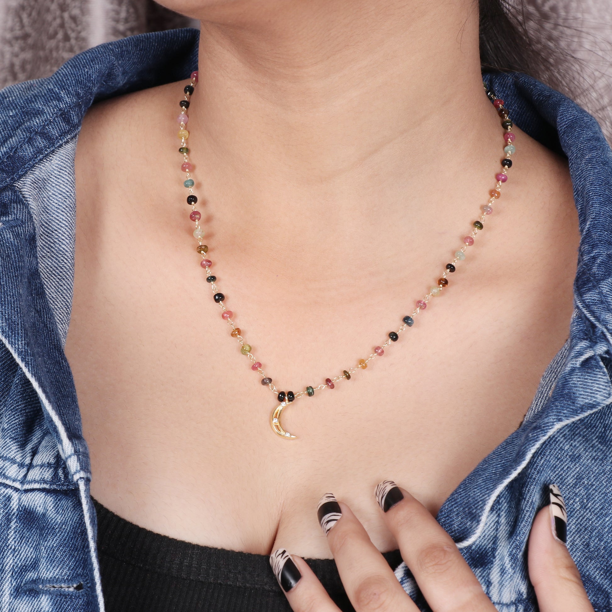 Discover the power of the moon with our Multi Tourmaline beaded necklace. Made with gold plated 925 sterling silver, this necklace features a stunning Moon charm that symbolizes intuition and inner wisdom. Enhance your spiritual journey and connect with your inner self with this unique and beautiful piece.