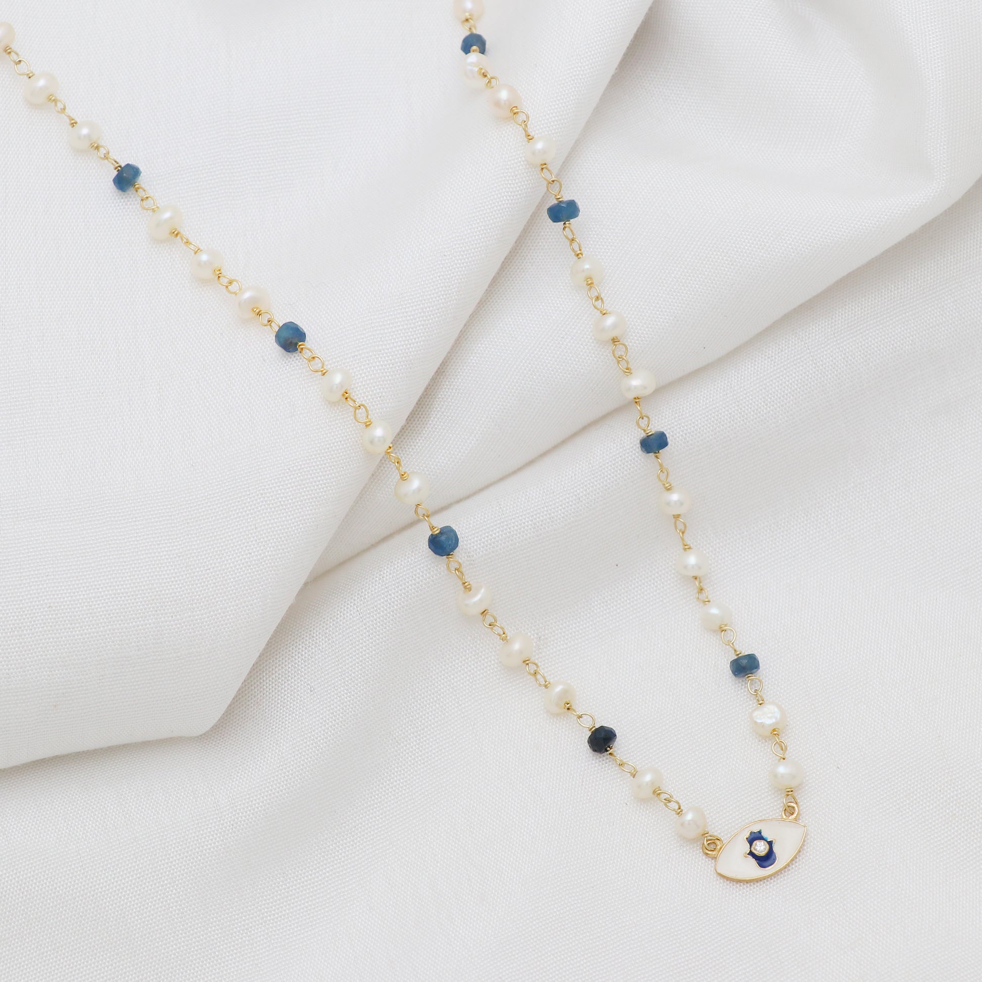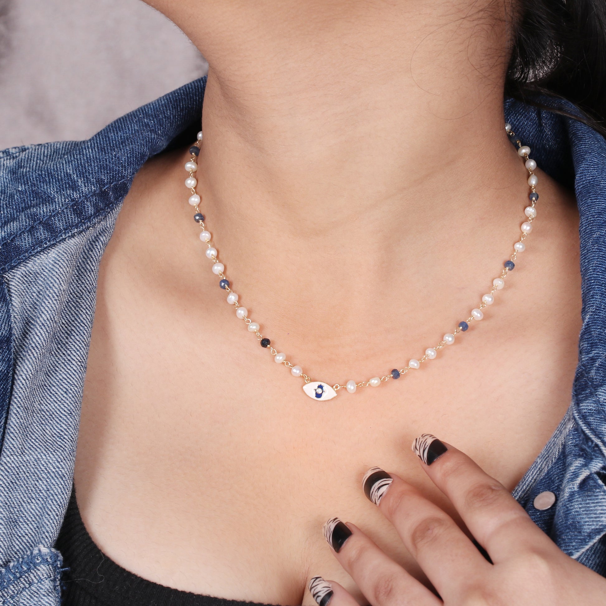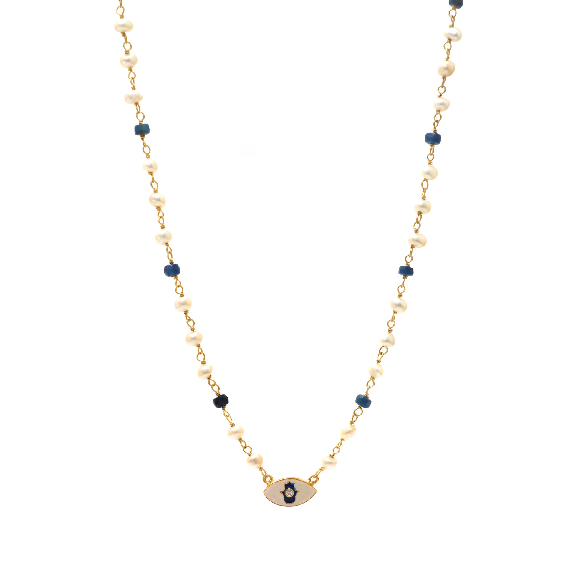 Pearl and Blue Saphhire beaded necklace with white and blue enamel Hamsa charm and zircon stone in 22k gold plated 925 sterling silver