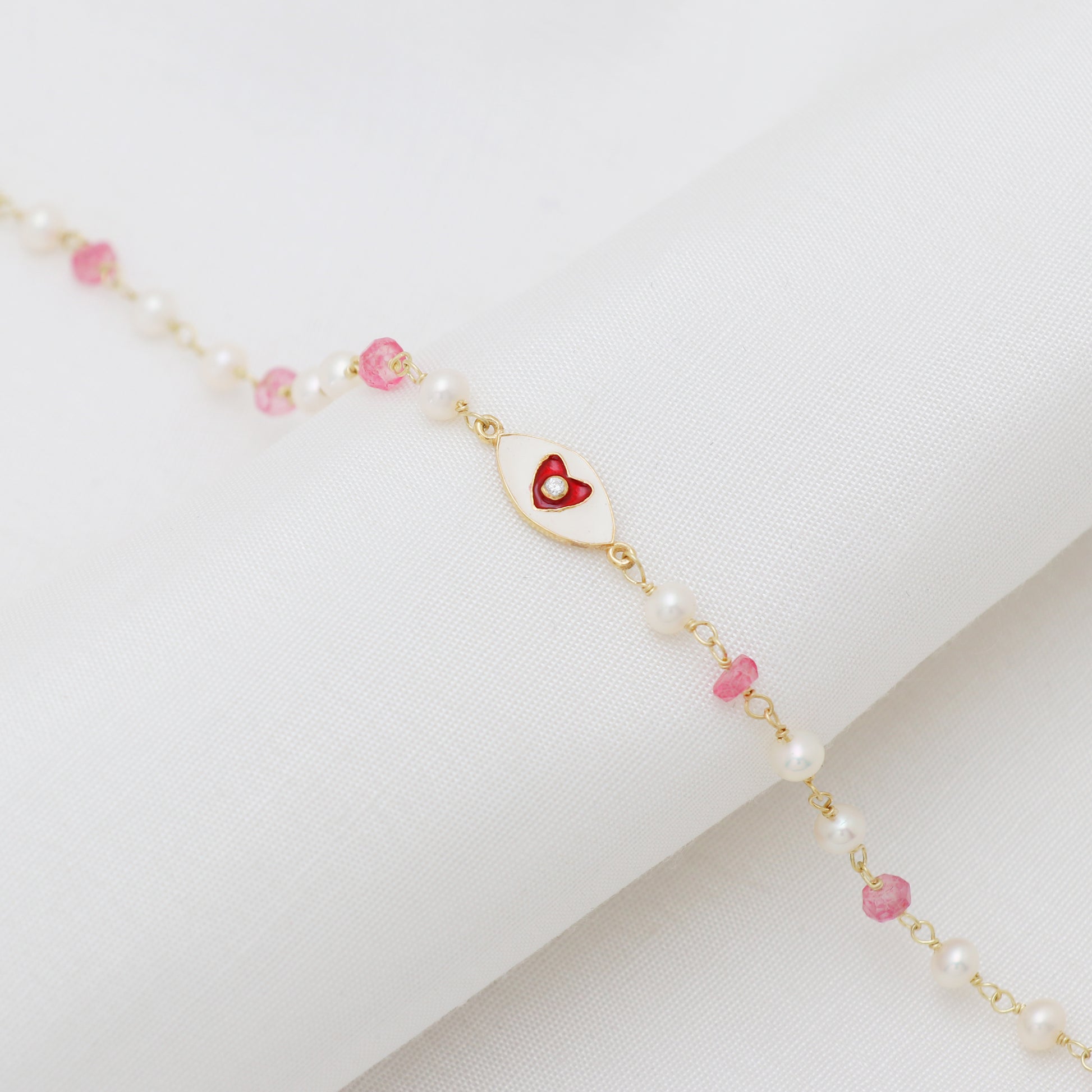 This gold plated 925 sterling silver rosary bracelet features a beautiful combination of pearl and pink topaz stones, accented with a heart charm and red and white enamel. The charm is adorned with sparkling zircon stone, adding a touch of elegance to this piece. Perfect for those seeking a delicate and sophisticated accessory with a touch of faith.