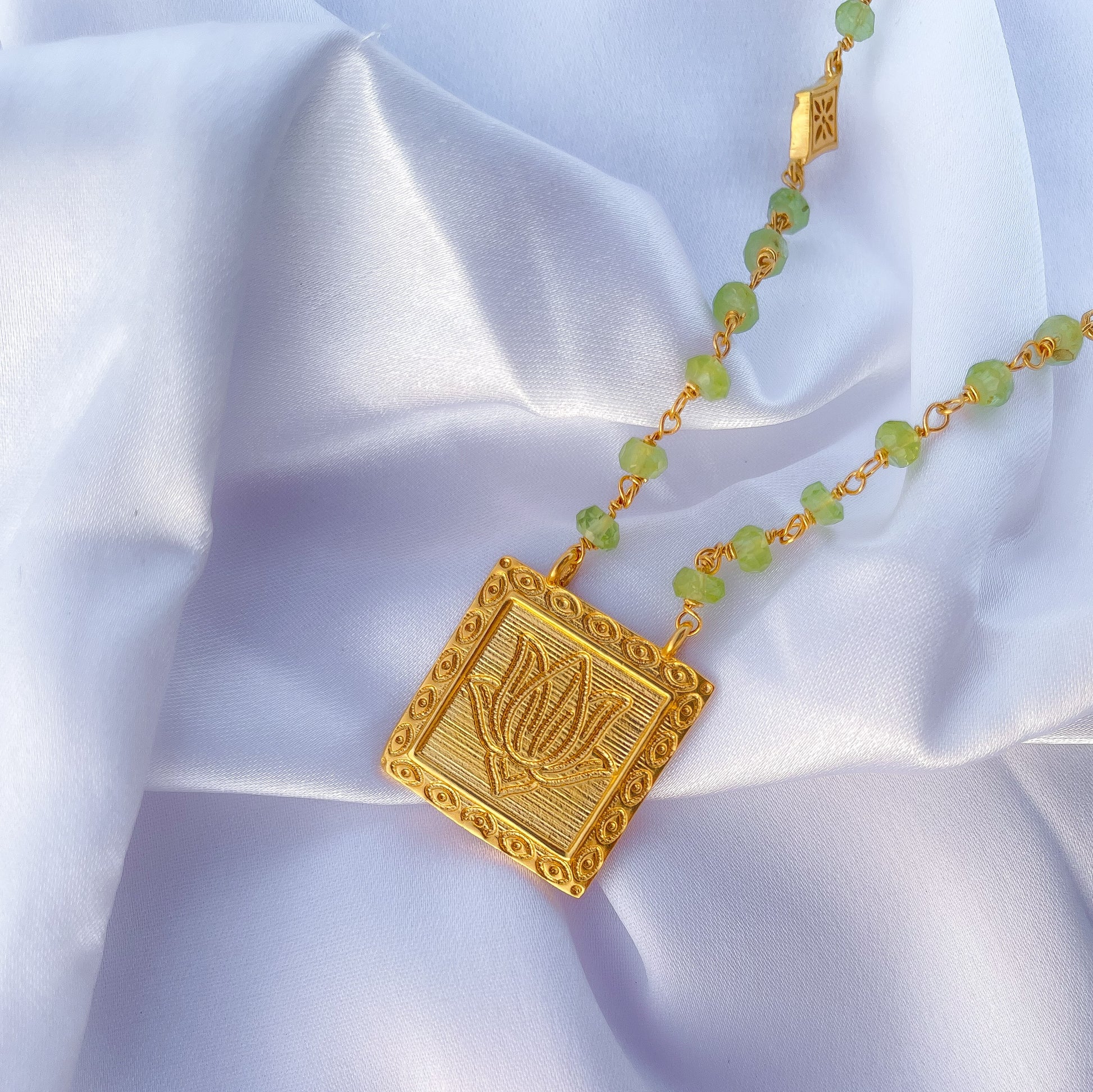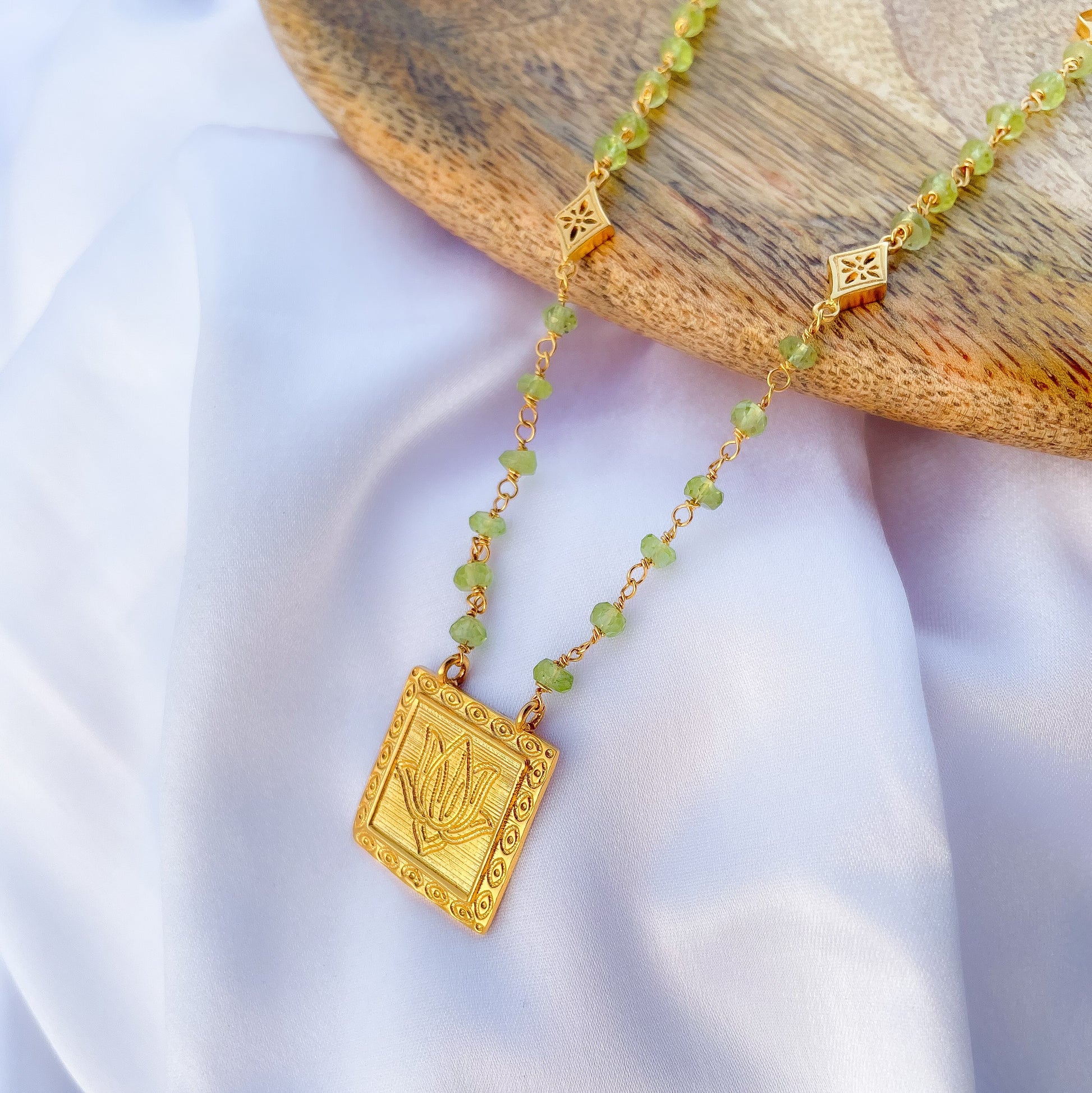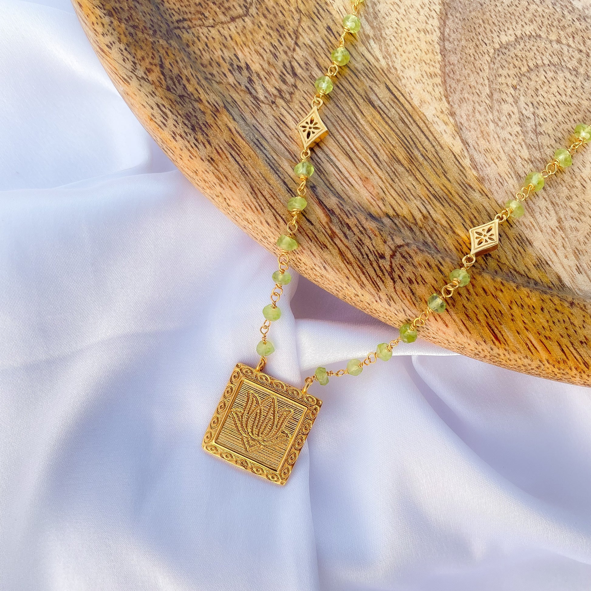 Peridot beaded necklace with Lotus charm in 22k gold plated 925 sterling silver