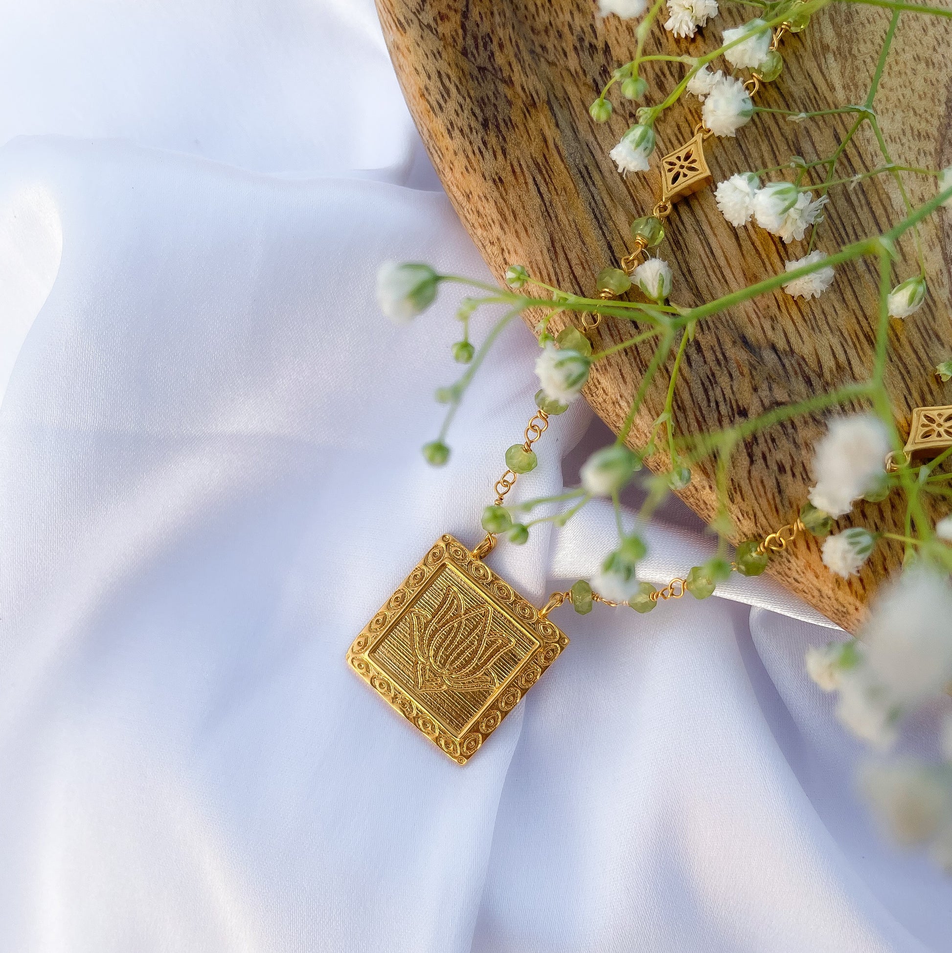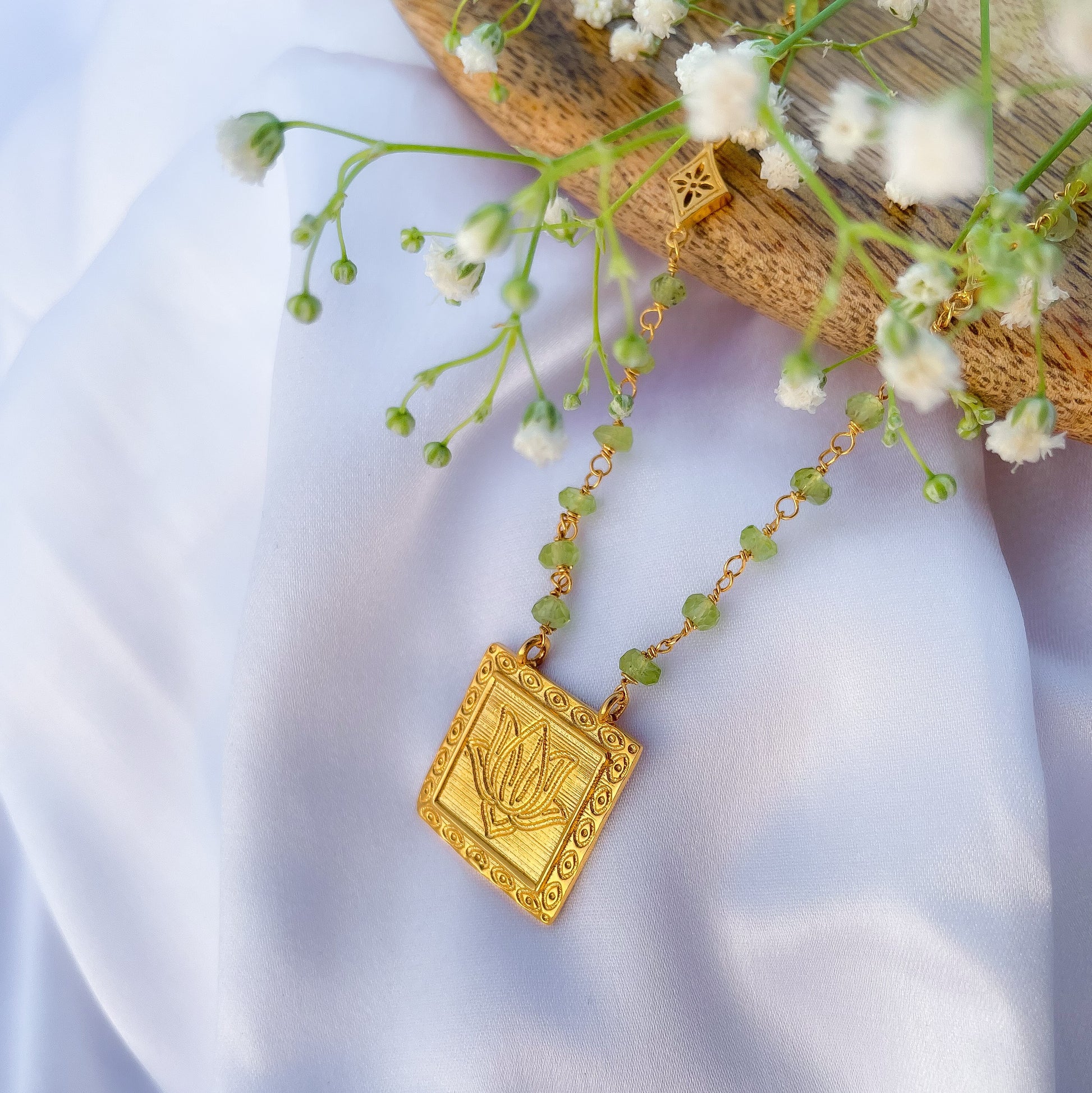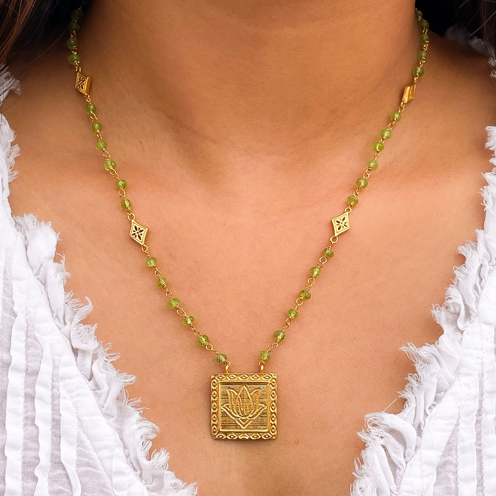 Peridot beaded necklace with Lotus charm in 22k gold plated 925 sterling silver