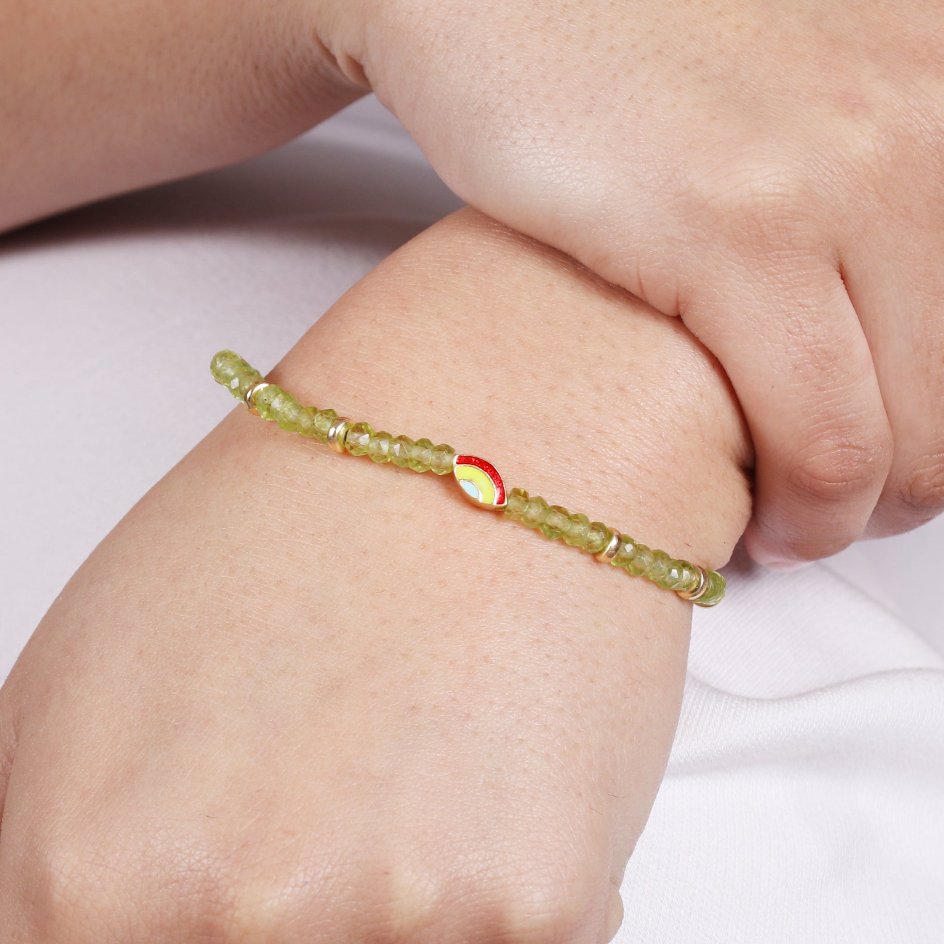 Peridot evil eye charm stretch bracelet with green, red and blue enamel in gold plated 925 sterling silver