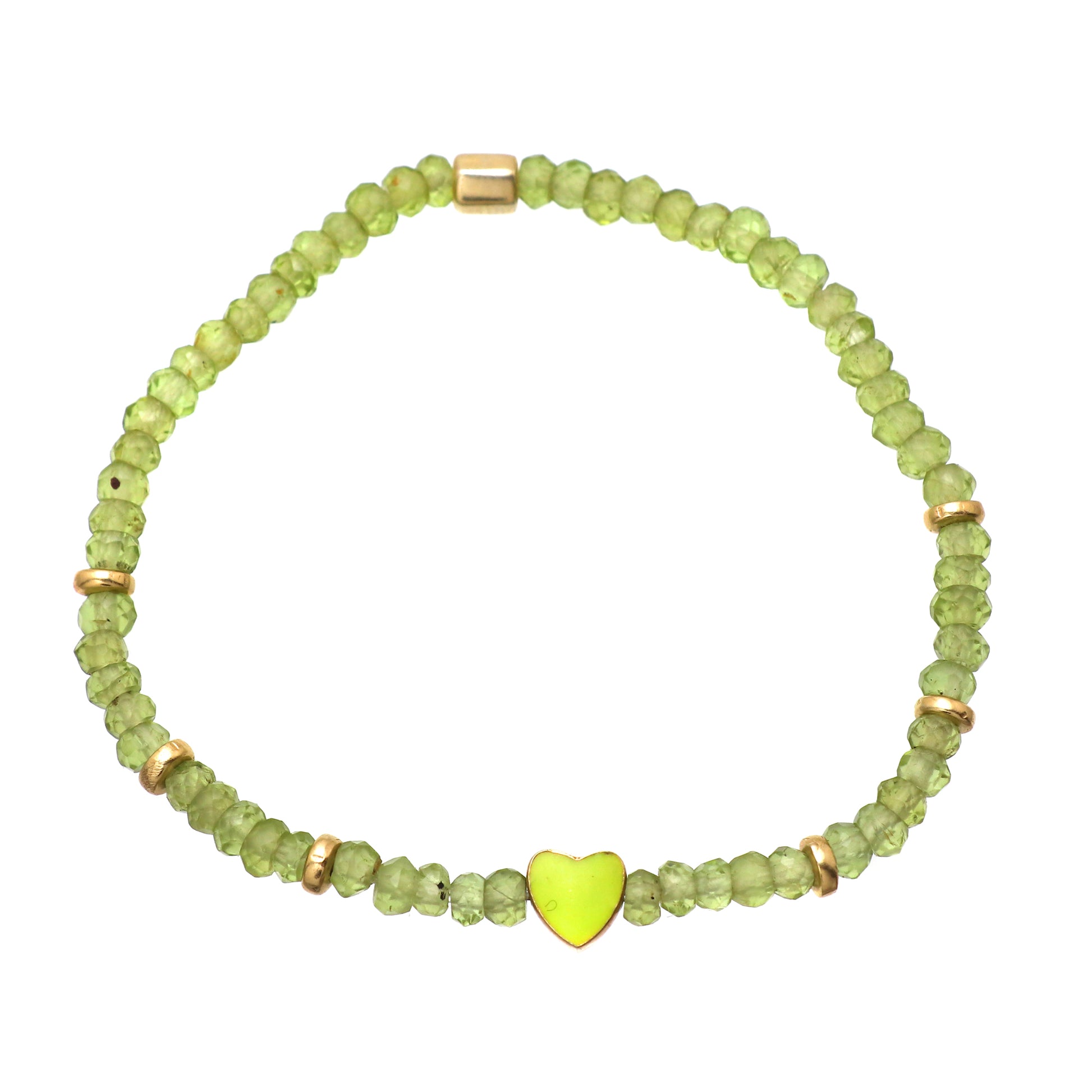 Peridot heart charm stretch bracelet with green enamel in gold plated 925 sterling silver