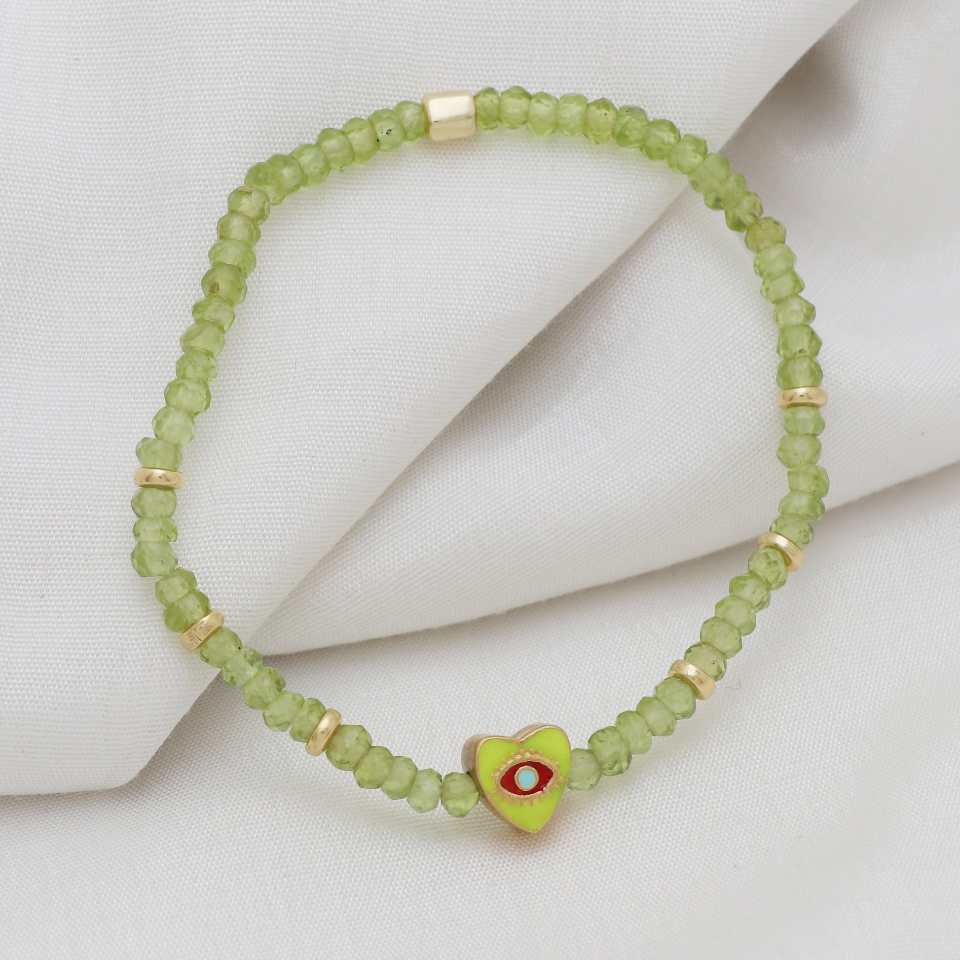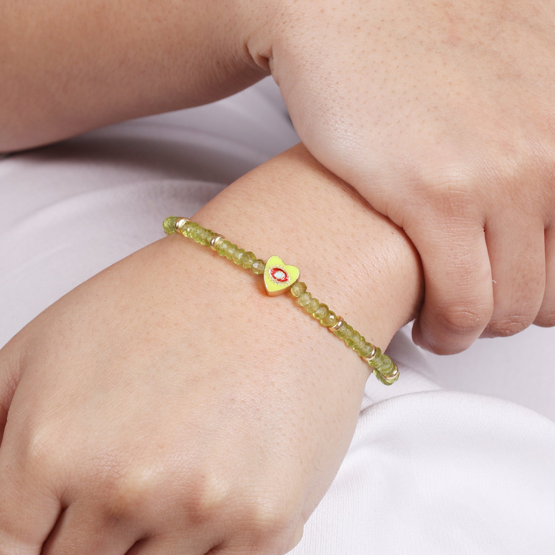 Peridot heart charm with evil eye engraved stretch bracelet with green and red enamel in gold plated 925 sterling silver