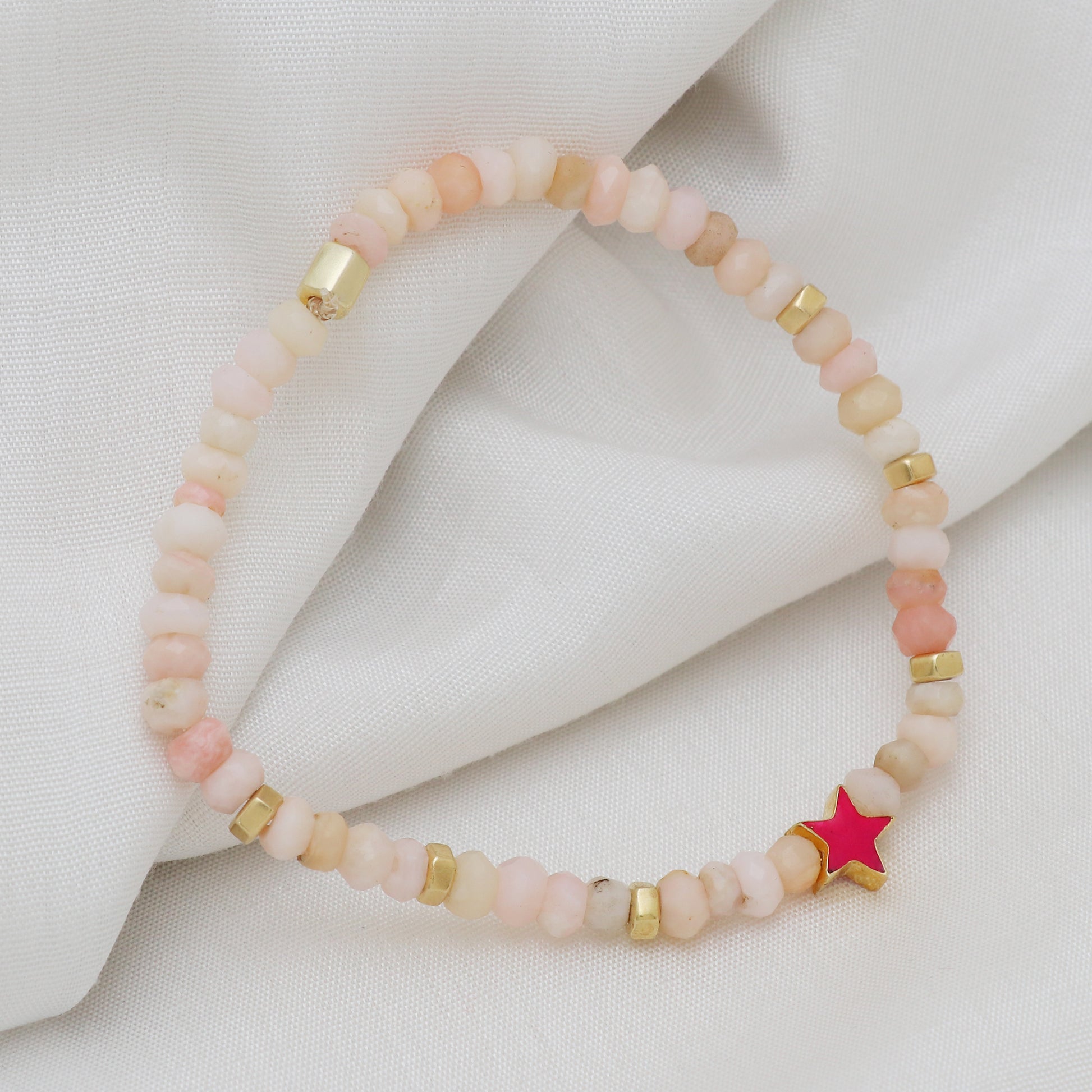 Add a touch of celestial beauty to your wardrobe with our Pink Opal Star Charm Stretch Bracelet. Crafted with gold plated 925 sterling silver and adorned with a pink enamel star charm, this bracelet adds a pop of color and elegance to any outfit. The stretch design ensures a comfortable fit for all wrists.