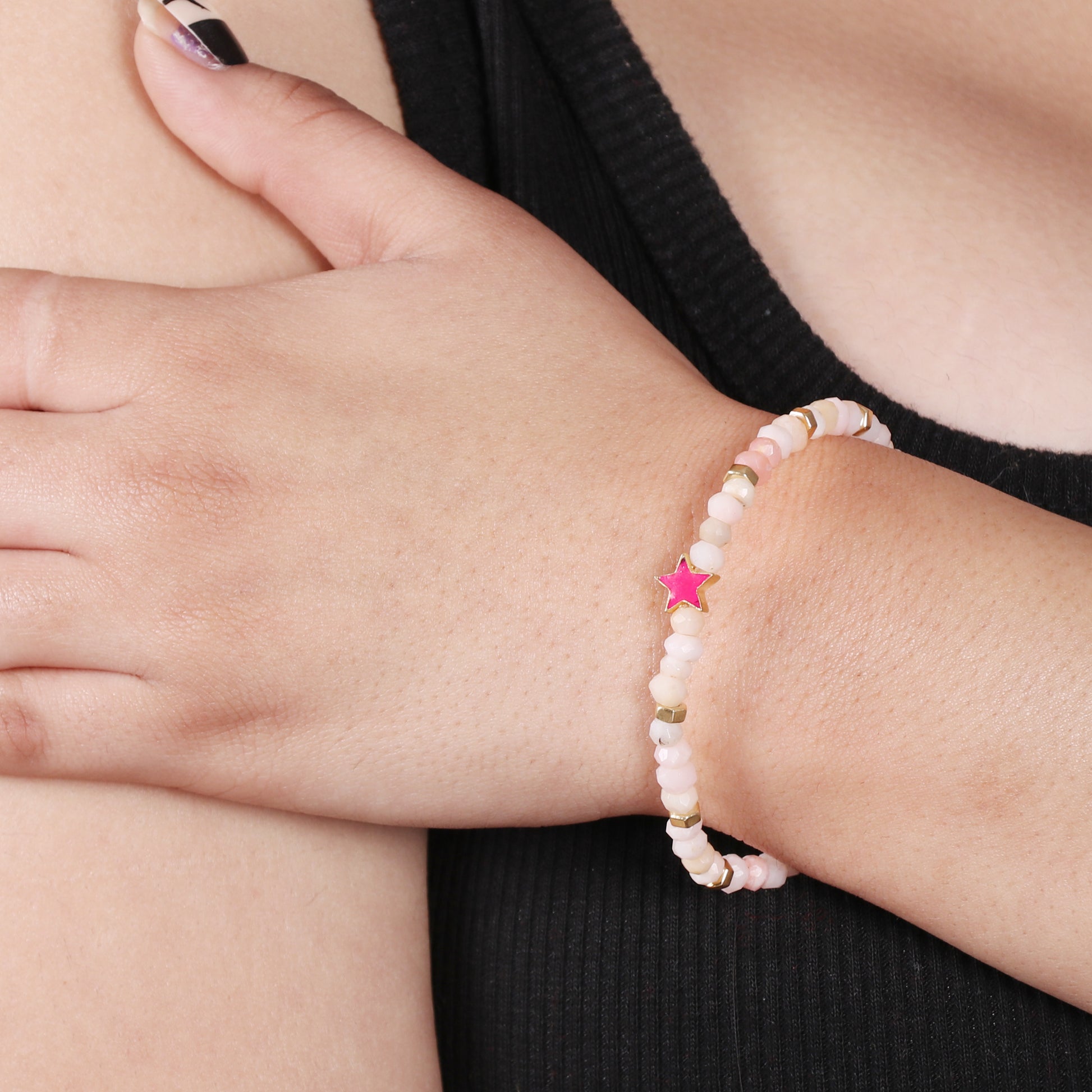 Pink opal star charm stretch bracelet with pink enamel in gold plated 925 sterling silver