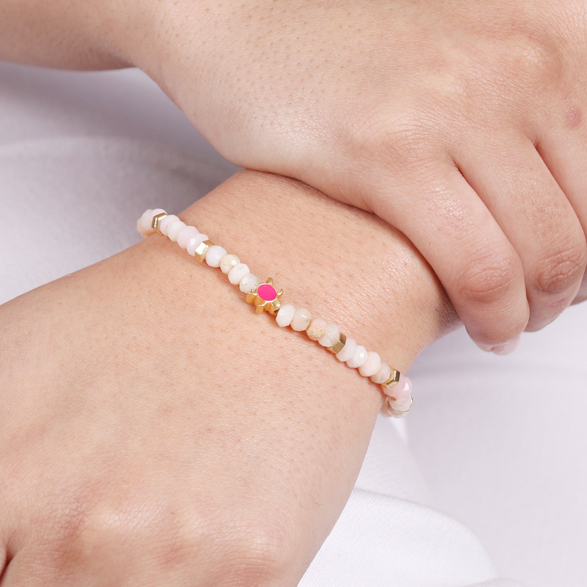 Pink opal turtle charm stretch bracelet with pink enamel in gold plated 925 sterling silver