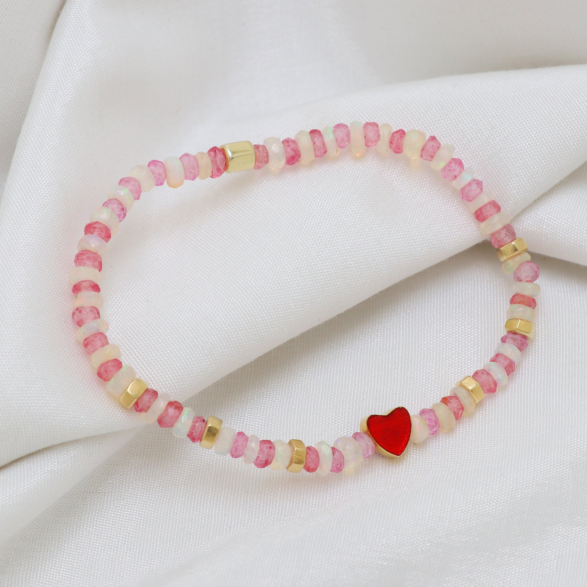 Pink Quartz And White Opal Heart charm stretch bracelet with red enamel in gold plated 925 sterling silver.