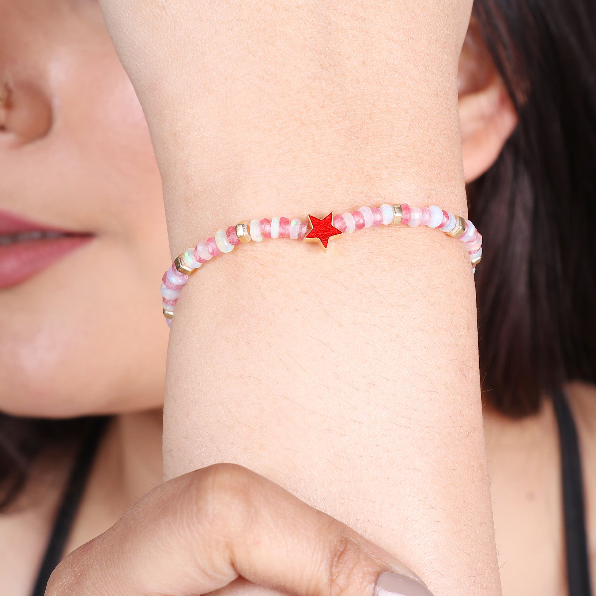 Pink Quartz White Opal Star charm stretch bracelet with red enamel in gold plated 925 sterling silver