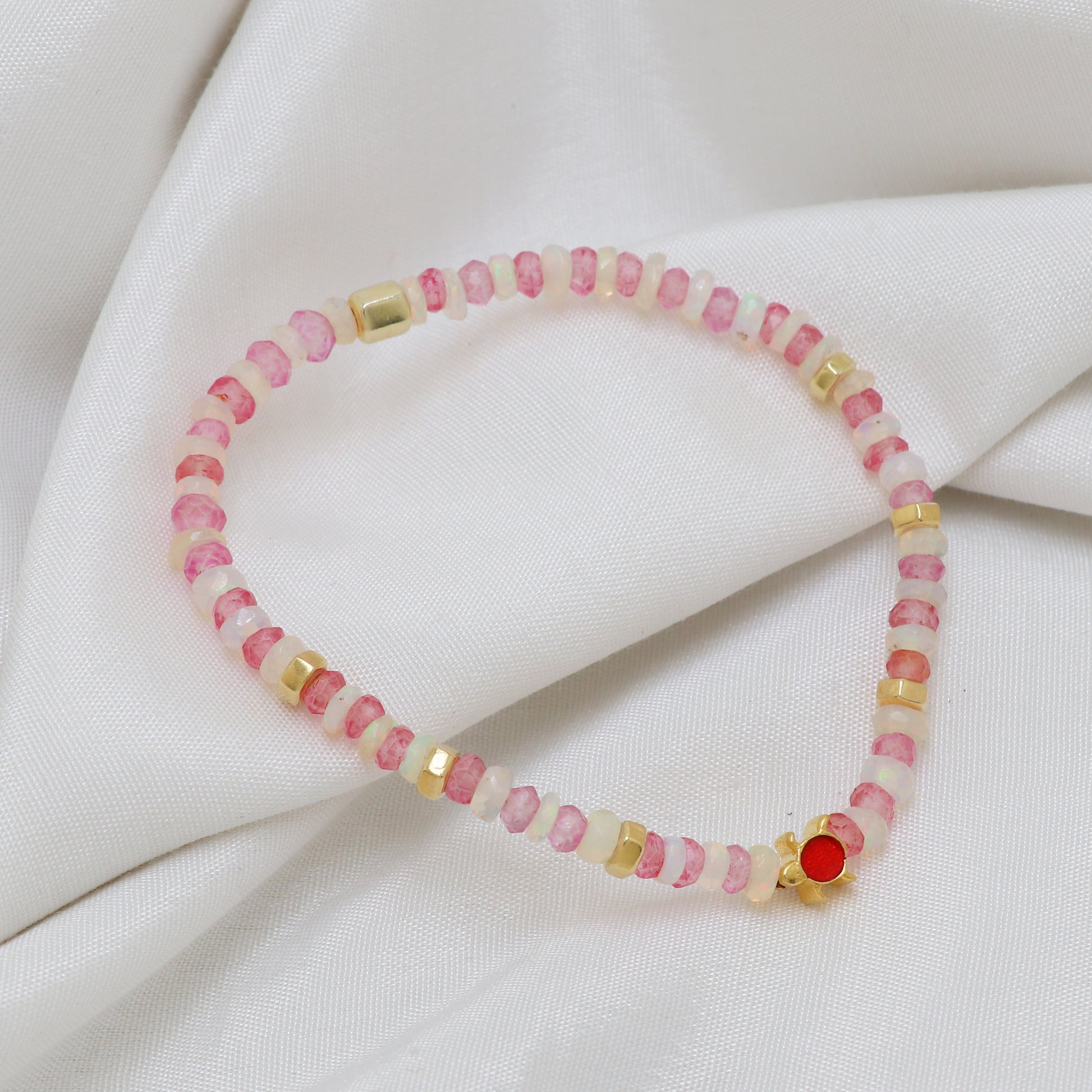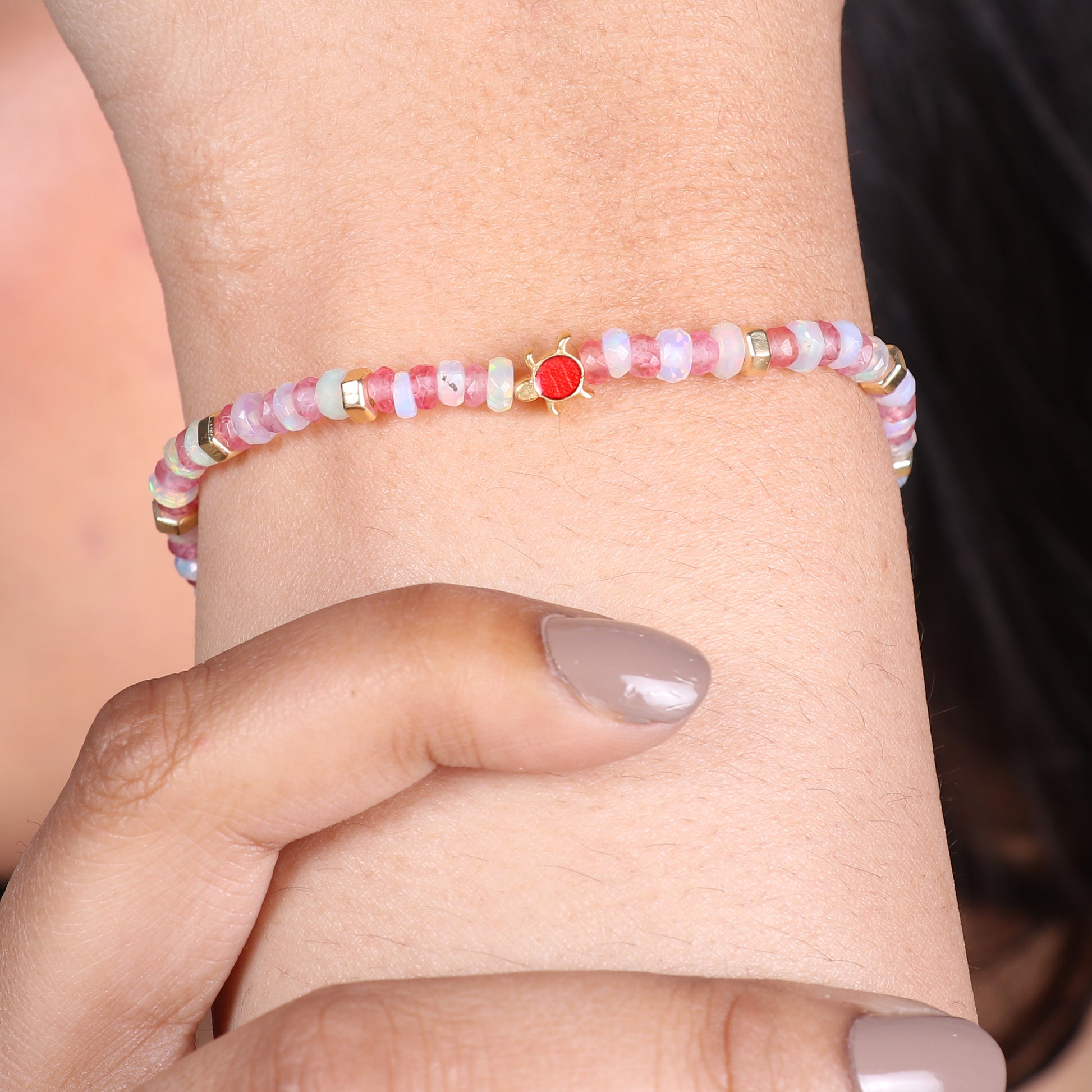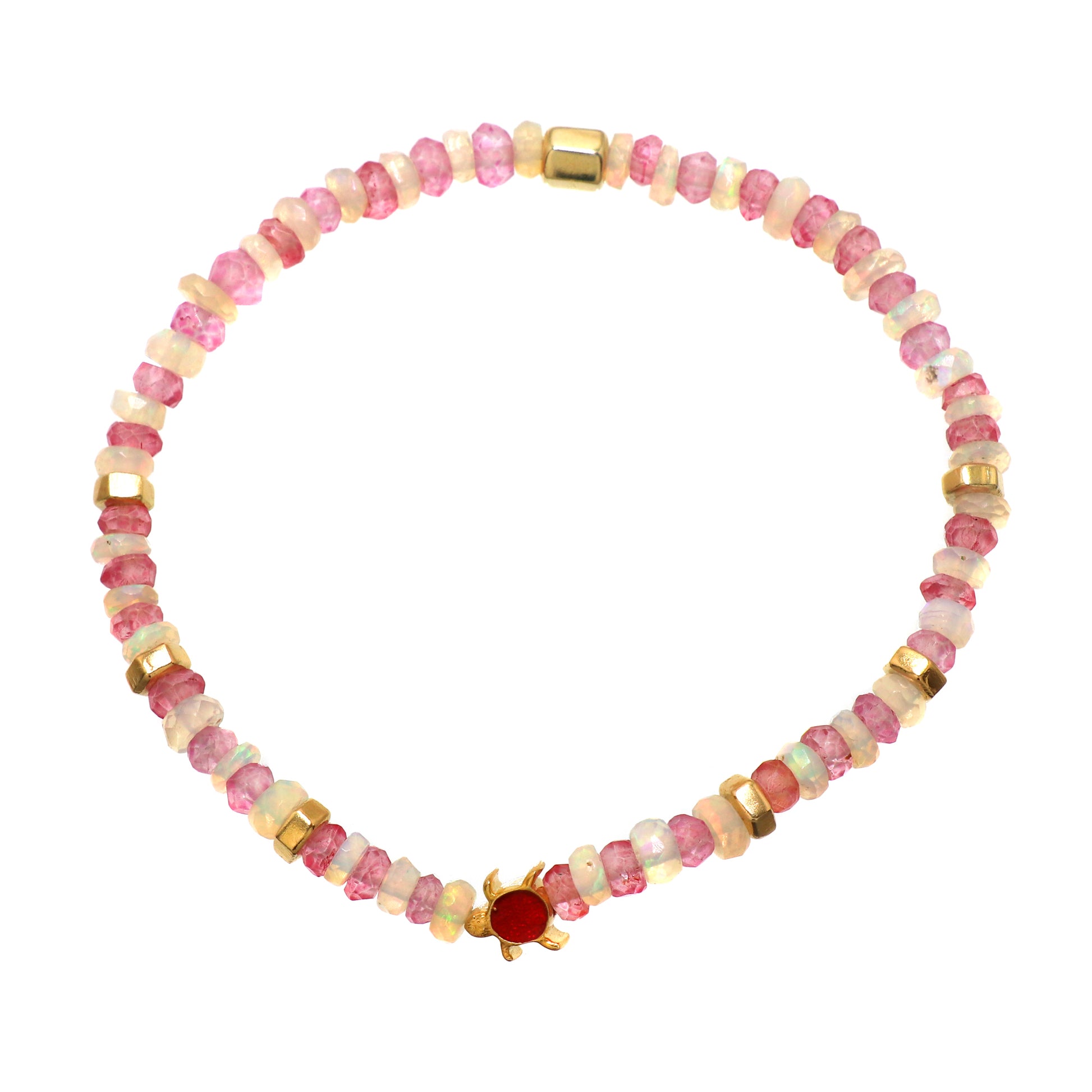 Pink Quartz White Opal Turtle charm stretch bracelet with red enamel in gold plated 925 sterling silver