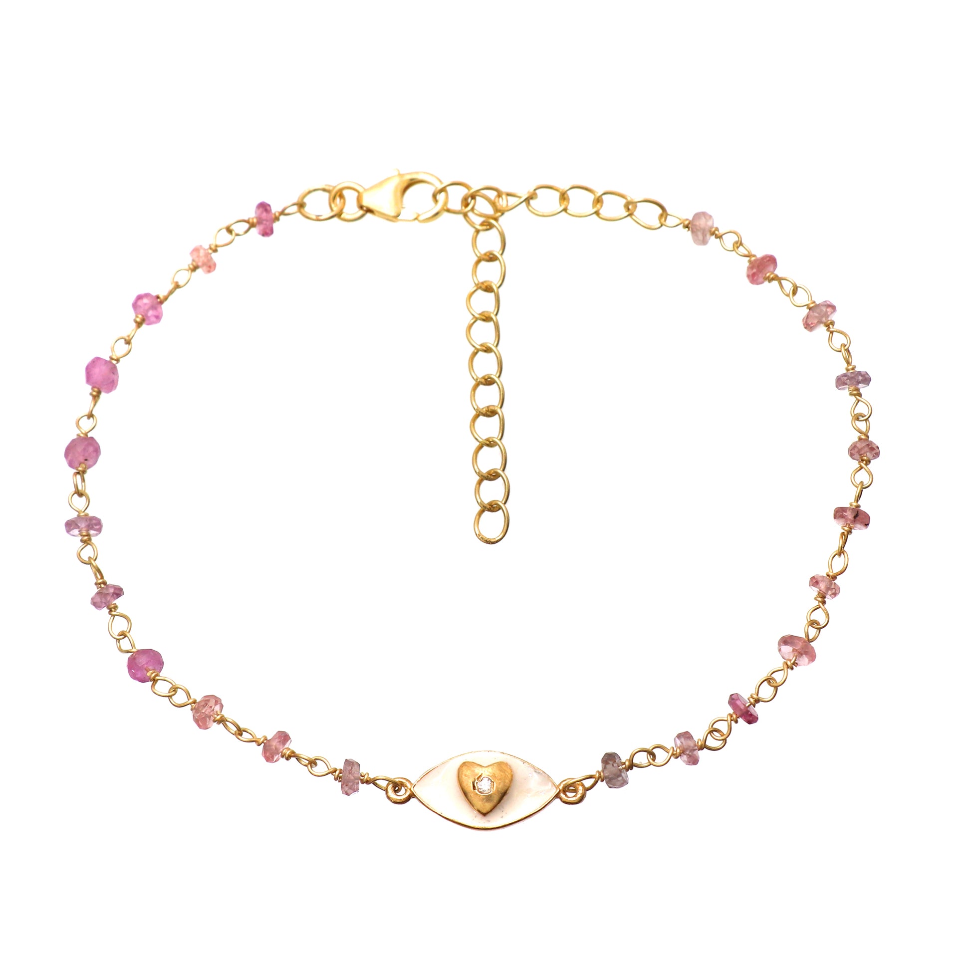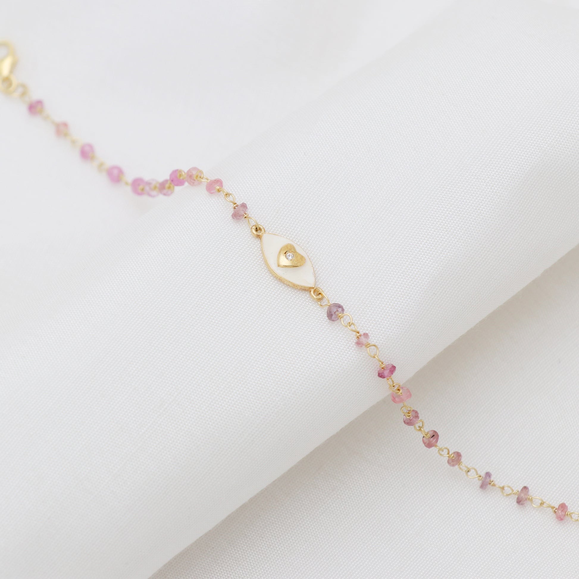 Pink Tourmaline heart charm rosary bracelet with white enamel and zircon stone in gold plated 925 sterling silver